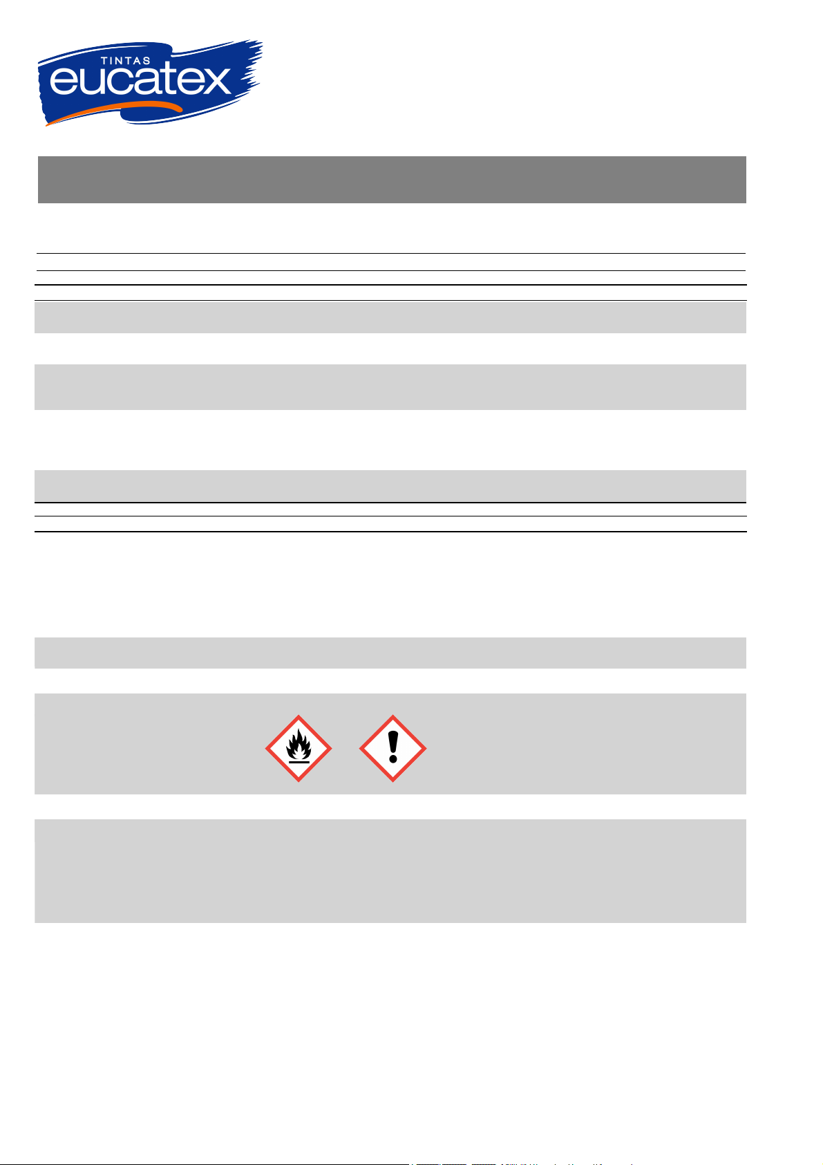 FDS Em conformidade com ABNT NBR 14725 FICHA COM DADOS DE SEGURANÇA Eucatex Diluente para Epóxi Produto: Página: 1/10Data: 13/05/2025 Versão: 01 1 - IDENTIFICAÇÃO Identificação do produto: Eucatex Diluente para Epóxi Outras maneiras de identificação: 4850300 Usos recomendados do produto químico e restrições de uso: Diluição para linha epóxi. Detalhes do fornecedor: EUCATEX INDUSTRIA E COMERCIO LTDA Endereço: RUA ESTRADA DO GUARUJÁ , 3150 , JD MARILIA, CEP: 13.323-902 - Salto - SP - Brasil. Telefone: (11) 4602-7066 Número do telefone de emergência: (11) 4602-7066 2 - IDENTIFICAÇÃO DE PERIGOS Classificação da substância ou mistura: Líquidos inflamáveis - Categoria 2; Toxicidade aguda - Oral - Categoria 4; Toxicidade aguda - Dérmica - Categoria 4; Corrosão/irritação da pele - Categoria 2; Lesões oculares graves/irritação ocular - Categoria 2A; Toxicidade para órgãos-alvo específicos - Exposição única - Categoria 3 - Respiratório; Perigoso ao ambiente aquático - Agudo - Categoria 2. Sistema de classificação utilizado: Norma ABNT-NBR 14725. Sistema Globalmente Harmonizado para a Classificação e Rotulagem de Produtos Químicos, ONU. Elementos de rotulagem do GHS, incluindo frases de precaução Pictogramas: Palavra de advertência: PERIGO Frases de perigo: H225 Líquido e vapores altamente inflamáveis. H302 Nocivo se ingerido. H312 Nocivo em contato com a pele. H315 Provoca irritação à pele. H319 Provoca irritação ocular grave. H335 Pode provocar irritação das vias respiratórias. H401 Tóxico para os organismos aquáticos. Frases de precaução: PREVENÇÃO: P210 Mantenha afastado do calor, superfícies quentes, faíscas, chamas abertas e outras fontes de ignição. Não fume. P233 Mantenha o recipiente hermeticamente fechado. P240 Aterre o vaso contentor e o receptor do produto durante transferências. P241 Utilize equipamento elétrico, de ventilação e de iluminação à prova de explosão. P242 Utilize apenas ferramentas antifaiscantes. P243 Tomar medidas de precaução contra descargas eletrostáticas. P261 Evite inalar poeiras/fumos/gases/névoas/vapores/aerossóis. P264 Lave as mãos cuidadosamente após o manuseio. P270 Não coma, beba ou fume durante a utilização deste produto. P271 Utilize apenas ao ar livre ou em locais bem ventilados. FDS Em conformidade com ABNT NBR 14725 FICHA COM DADOS DE SEGURANÇA Eucatex Diluente para Epóxi Produto: Página: 2/10Data: 13/05/2025 Versão: 01 P273 Evite a liberação para o meio ambiente. P280 Use luvas de proteção, roupa de proteção, proteção ocular, proteção facial e proteção auricular. RESPOSTA À EMERGÊNCIA: P301 + P312 EM CASO DE INGESTÃO: Em caso de mal-estar, contate um CENTRO DE INFORMAÇÃO TOXICOLÓGICA ou médico. P302 + P352 EM CASO DE CONTATO COM A PELE: Lave com água em abundância. P303 + P361 + P353 EM CASO DE CONTATO COM A PELE (ou com cabelo): Retire imediatamente toda a roupa contaminada. Enxague a pele com água ou tome uma ducha. P304 + P340 EM CASO DE INALAÇÃO: Remova a pessoa para local ventilado e a mantenha em repouso em uma posição que não dificulte a respiração. P305 + P351 + P338 EM CASO DE CONTATO COM OS OLHOS: Enxague cuidadosamente com água durante vários minutos. No caso de uso de lentes de contatos, remova-as, se for fácil. Continue enxaguando. P312 Em caso de mal-estar, contate um CENTRO DE INFORMAÇÃO TOXICOLÓGICA ou médico. P321 Tratamento específico. P330 Enxague a boca. P332 + P313 Em caso de irritação cutânea: consulte um médico. P337 + P313 Caso a irritação ocular persista: consulte um médico. P362 + P364 Retire a roupa contaminada. Lave-a antes de usar novamente. P370 + P378 Em caso de incêndio: Utilize dióxido de carbono (CO₂), espuma, neblina d'água e pó químico para extinção. ARMAZENAMENTO: P403 + P233 Armazene em local bem ventilado. Mantenha o recipiente hermeticamente fechado. P403 + P235 Armazene em local bem ventilado. Mantenha em local fresco. P405 Armazene em local fechado à chave. DISPOSIÇÃO: P501 Descarte o conteúdo e o recipiente em conformidade com as regulamentações locais. Outros perigos que não resultam em uma classificação: O produto não possui outros perigos. 3 - COMPOSIÇÃO E INFORMAÇÕES SOBRE OS INGREDIENTES MISTURA Eucatex Diluente para Epóxi Ingredientes, impurezas e/ou aditivos estabilizantes que contribuem para o perigo: Identificador do produto CAS/CE Faixa de concentração (%) Xileno 1330-20-7 215-535-7 54,60 - 91,00 Metil isobutil cetona 108-10-1 203-550-1 15,00 - 25,00 Etilbenzeno 100-41-4 202-849-4 5,40 - 9,00 4 - MEDIDAS DE PRIMEIROS-SOCORROS Inalação: Remova a vítima para local ventilado e a mantenha em repouso numa posição que não dificulte a respiração. Caso sinta indisposição, contate um CENTRO DE INFORMAÇÃO TOXICOLÓGICA ou um médico. Leve este documento. Contato com a pele: Lave a pele exposta com quantidade suficiente de água para remoção do produto. Remova e isole roupas e sapatos contaminados. Em caso de irritação cutânea: Consulte um médico. Leve este FDS Em conformidade com ABNT NBR 14725 FICHA COM DADOS DE SEGURANÇA Eucatex Diluente para Epóxi Produto: Página: 3/10Data: 13/05/2025 Versão: 01 documento. Contato com os olhos: Enxágue cuidadosamente com água durante vários minutos. No caso de uso de lentes de contato, remova-as, se for fácil e continue enxaguando. Caso a irritação ocular persista: consulte um médico. Leve este documento. Ingestão: Lave a boca da vítima com água em abundância. Nunca forneça algo por via oral a uma pessoa inconsciente. Caso sinta indisposição, contate um CENTRO DE INFORMAÇÃO TOXICOLÓGICA ou um médico. Leve este documento. Sintomas e efeitos mais importantes, agudos ou tardios: Provoca irritação à pele com vermelhidão, dor e ressecamento. Provoca irritação ocular grave com vermelhidão e dor. Nocivo se ingerido. Nocivo em contato com a pele. Pode provocar irritação das 