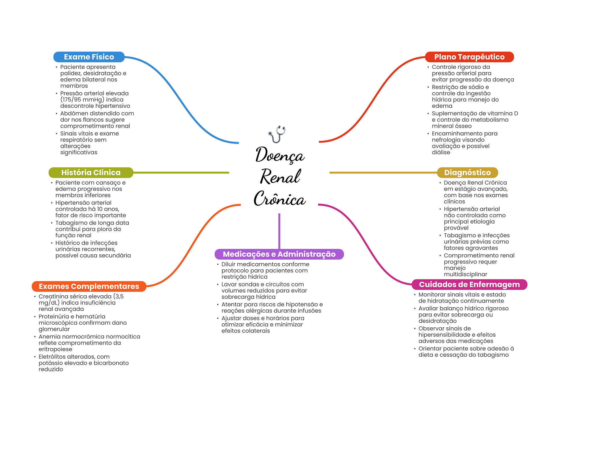 Exame Físico Plano Terapêutico Paciente apresenta Controle rigoroso da palidez, desidratação e pressão arterial para edema bilateral nos evitar progressão da doença membros Restrição de sódio e Pressão arterial elevada controle da ingestão (175/95 mmHg) indica hídrica para manejo do descontrole hipertensivo edema Abdômen distendido com Suplementação de vitamina D dor nos flancos sugere e controle do metabolismo comprometimento renal mineral ósseo Sinais vitais e exame Encaminhamento para respiratório sem nefrologia visando alterações avaliação e possível significativas Doença diálise História Clínica Renal Diagnóstico Paciente com cansaço e Doença Renal Crônica edema progressivo nos em estágio avançado, membros inferiores Crônica com base nos exames Hipertensão arterial clínicos controlada há 10 anos, Hipertensão arterial fator de risco importante não controlada como Tabagismo de longa data principal etiologia contribui para piora da provável função renal Tabagismo e infecções Histórico de infecções urinárias prévias como urinárias recorrentes, fatores agravantes possível causa secundária Medicações e Administração Comprometimento renal Diluir medicamentos conforme progressivo requer protocolo para pacientes com manejo restrição hídrica multidisciplinar Exames Complementares Lavar sondas e circuitos com Cuidados de Enfermagem volumes reduzidos para evitar Creatinina sérica elevada (3,5 sobrecarga hídrica Monitorar sinais vitais e estado mg/dL) indica insuficiência de hidratação continuamente Atentar para riscos de hipotensão e renal avançada reações alérgicas durante infusões Avaliar balanço hídrico rigoroso Proteinúria e hematúria para evitar sobrecarga ou Ajustar doses e horários para microscópica confirmam dano otimizar eficácia e minimizar desidratação glomerular efeitos colaterais Observar sinais de Anemia normocrômica normocítica hipersensibilidade e efeitos reflete comprometimento da adversos das medicações eritropoiese Orientar paciente sobre adesão à Eletrólitos alterados, com dieta e cessação do tabagismo potássio elevado e bicarbonato reduzido