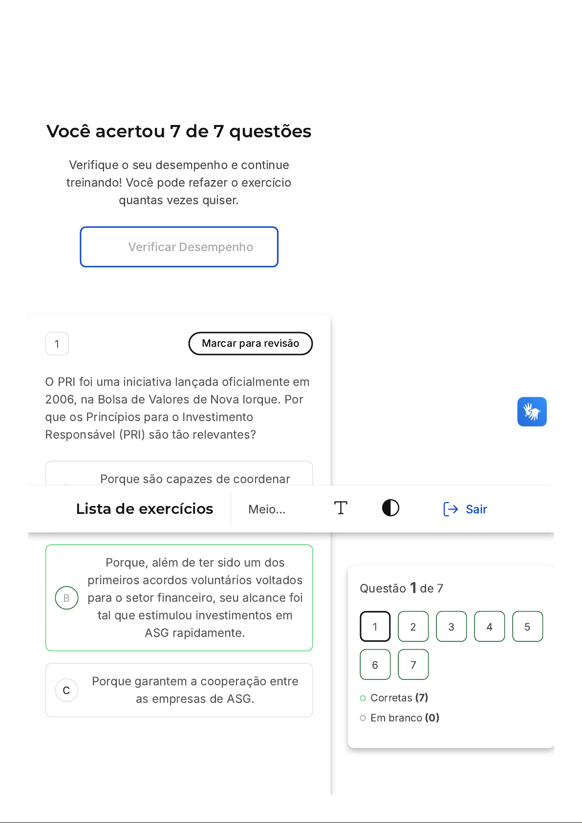 Você acertou 7 de 7 questões Verifique o seu desempenho e continue treinando! Você pode refazer o exercício quantas vezes quiser. Verificar Desempenho A B C 1 Marcar para revisão O PRI foi uma iniciativa lançada oficialmente em 2006, na Bolsa de Valores de Nova Iorque. Por que os Princípios para o Investimento Responsável (PRI) são tão relevantes? Porque são capazes de coordenar esforços de governos acerca da sustentabilidade. Porque, além de ter sido um dos primeiros acordos voluntários voltados para o setor financeiro, seu alcance foi tal que estimulou investimentos em ASG rapidamente. Porque garantem a cooperação entre as empresas de ASG. Questão 1 de 7 Corretas (7) Em branco (0) 1 2 3 4 5 6 7 Lista de exercícios Meio… Sair D E Porque criaram um fundo que permite investir diretamente em empresas sustentáveis. Porque são centralizadas em um investidor influente. Resposta correta Parabéns, você selecionou a alternativa correta. Confira o gabarito comentado! Gabarito Comentado A alternativa correta é: "Porque, além de ter sido um dos primeiros acordos voluntários voltados para o setor financeiro, seu alcance foi tal que estimulou investimentos em ASG rapidamente". O PRI, lançado oficialmente em 2006 na Bolsa de Valores de Nova Iorque, foi uma iniciativa apoiada pelas Nações Unidas e organizada por 20 dos maiores investidores globais. Esses investidores lançaram um conjunto de princípios voluntários com o objetivo de comprometer as instituições com a agenda ASG (Ambiental, Social e Governança). Os seis princípios do PRI abordam a consideração de questões ASG na decisão de investimento, a influência na adoção de melhores práticas pelas empresas, o trabalho colaborativo entre investidores e a transparência ao mercado. Portanto, a relevância do PRI reside no fato de que ele foi um dos primeiros acordos voluntários do setor financeiro que conseguiu estimular rapidamente os investimentos em ASG, contribuindo significativamente para A B C D E a sustentabilidade e a responsabilidade social corporativa. 2 Marcar para revisão Os relatórios de sustentabilidade ajudam os investidores a tomarem suas decisões. Dentre os itens abaixo, quais deles estão relacionados a uma funcionalidade dos relatórios de sustentabilidade? I. Aumentar a divulgação de medidas sustentáveis. II. Gerar dados comparáveis. III. Facilitar análises de investidores. IV. Gerar conhecimento sobre o setor. V. Sugerir investimentos. Apenas os itens I, II e IV estão corretos. Apenas os itens III e IV estão corretos. Apenas os itens I, III e V estão corretos. Apenas os itens II e V estão corretos. Apenas os itens I, II, III e IV estão corretos. Resposta correta Parabéns, você selecionou a alternativa correta. Confira o gabarito comentado! Gabarito Comentado Os indicadores de sustentabilidade não são padronizados e não existe uma regulação específica que determine exatamente o que as empresas devem informar sobre suas iniciativas e resultados nas questões de sustentabilidade. Algumas iniciativas, como os relatórios de sustentabilidade, buscam criar padrões para auxiliar as empresas nessa divulgação. Com base nisso, podemos analisar que o único item que não está relacionado à funcionalidade dos relatórios de sustentabilidade é "sugerir investimentos". Os demais itens, como "aumentar a divulgação de medidas sustentáveis", "gerar dados comparáveis", "facilitar análises de investidores" e "gerar conhecimento sobre o setor", são todos aspectos que os relatórios de sustentabilidade buscam atender. Portanto, a alternativa correta é a que afirma que apenas os itens I, II, III e IV estão corretos. 3 Marcar para revisão Qual foi a primeira dimensão da ASG a ser incorporada pelos investidores? A B C D E Social. Ambiental. Governança Corporativa. Empresarial. Não-Governamental. Resposta correta Parabéns, você selecionou a alternativa correta. Confira o gabarito comentado! Gabarito Comentado As questões ASG se referem a critérios Ambientais, Sociais e de Governança Corporativa. Dentre essas três dimensões, a primeira a ser considerada pelos investidores foi a Governança Corporativa. Isso pode ser compreendido ao analisarmos que as práticas de governança são as que direcionam como os conselheiros, diretores e outros executivos guiam as decisões da empresa. Portanto, a alternativa correta é a que indica a Governança Corporativa como a primeira dimensão da ASG a ser incorporada pelos investidores. A B C D E 4 Marcar para revisão Qual o índice brasileiro que avalia as empresas listadas no mercado local em diversos aspectos da sustentabilidade? Índice de Sustentabilidade Dow Jones. Índice de Sustentabilidade Empresarial (ISE). Índice Carbono Eficiente. IBOVESPA. Índice de Redução de Emissões. Resposta correta Parabéns, você selecionou a alternativa correta. Confira o gabarito comentado! Gabarito Comentado O Índice de Sustentabilidade Empresarial (ISE) é o índice brasileiro que avalia as empresas listadas no mercado local em diversos aspectos da sustentabilidade. Ele é uma ferramenta para análise comparativa da performance das empresas sob o aspecto da sustentabilidade corporativa, baseada em eficiência econômica, equilíbrio ambiental, justiça social e governança corporativa. Portanto, a A B C D E alternativa correta é a B: Índice de Sustentabilidade Empresarial (ISE). 5 Marcar para revisão O conceito de desenvolvimento sustentável foi evoluindo ao longo do tempo. Como o conceito de desenvolvimento sustentável, de acordo com a definição das Nações Unidas, pode ser compreendido? Aquele que visa atender primordialmente às necessidades das empresas sem considerar o impacto ambiental. Aquele que busca maximizar os lucros das organizações a qualquer custo. Aquele que atende às necessidades do presente, sem comprometer a capacidade das gerações futuras de atender às suas necessidades. Aquele que prioriza as ações f