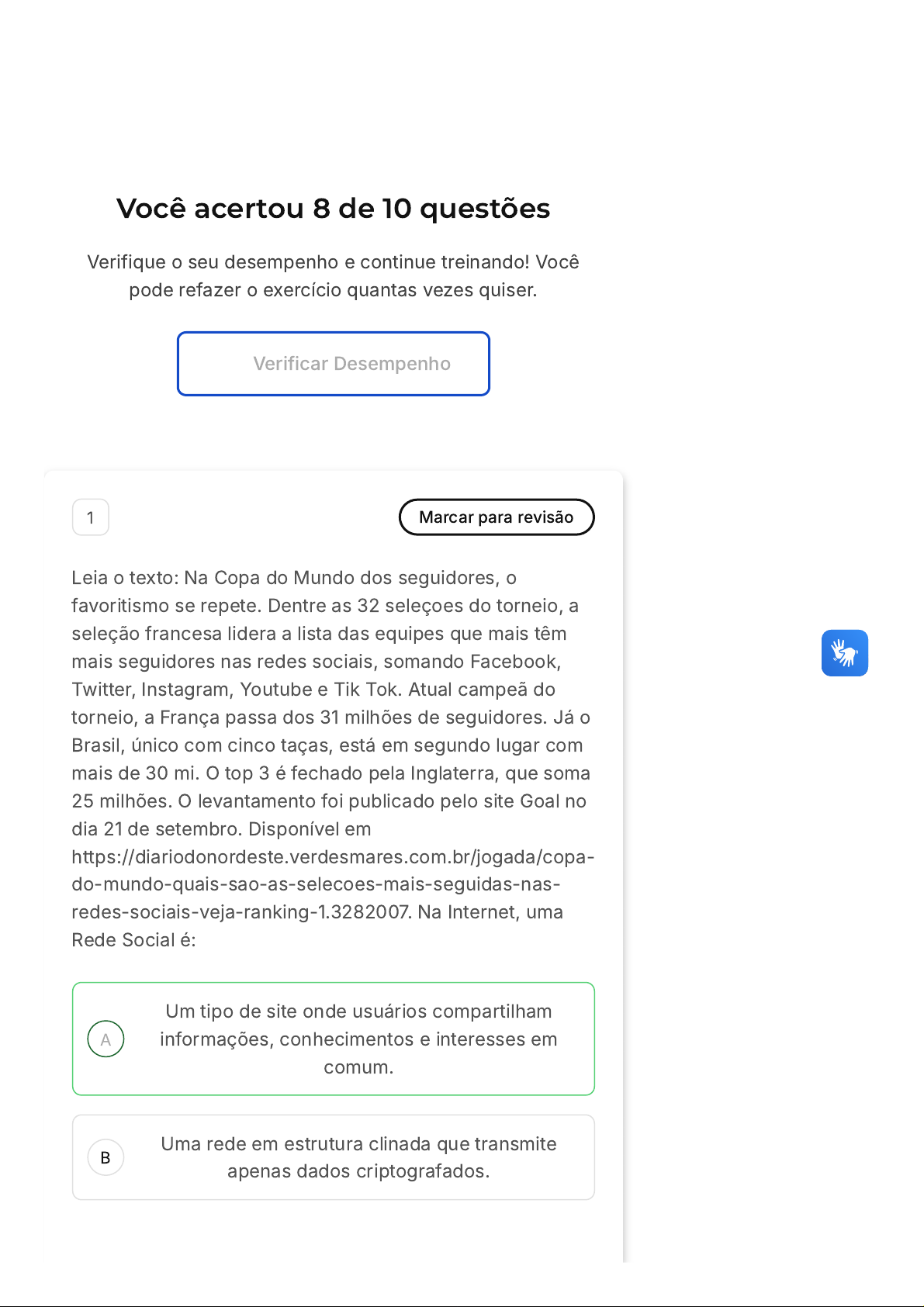 Você acertou 8 de 10 questões Verifique o seu desempenho e continue treinando! Você pode refazer o exercício quantas vezes quiser. Verificar Desempenho A B 1 Marcar para revisão Leia o texto: Na Copa do Mundo dos seguidores, o favoritismo se repete. Dentre as 32 seleçoes do torneio, a seleção francesa lidera a lista das equipes que mais têm mais seguidores nas redes sociais, somando Facebook, Twitter, Instagram, Youtube e Tik Tok. Atual campeã do torneio, a França passa dos 31 milhões de seguidores. Já o Brasil, único com cinco taças, está em segundo lugar com mais de 30 mi. O top 3 é fechado pela Inglaterra, que soma 25 milhões. O levantamento foi publicado pelo site Goal no dia 21 de setembro. Disponível em https://diariodonordeste.verdesmares.com.br/jogada/copa- do-mundo-quais-sao-as-selecoes-mais-seguidas-nas- redes-sociais-veja-ranking-1.3282007. Na Internet, uma Rede Social é: Um tipo de site onde usuários compartilham informações, conhecimentos e interesses em comum. Uma rede em estrutura clinada que transmite apenas dados criptografados. C D E Um site típico de ONGs que incentivam o uso da Internet como meio de inclusão social. Um tipo de conexão de alta velocidade com a Internet, própria para utilização em áreas de baixa renda. Uma rede composta por pelo menos dez computadores e que é utilizada para realizar processamento de grandes cálculos na web. Resposta correta Parabéns, você selecionou a alternativa correta. Confira o gabarito comentado! Gabarito Comentado As redes sociais, em especial o Facebook, foram recebidas com entusiasmo em todo o mundo, não apenas pelo seu caráter de entretenimento, mas, sobretudo, pela percepção de que essas redes poderiam democratizar o acesso à informação e ao conhecimento, considerando-se que a chamada grande mídia, ou seja, as grandes redes de televisão e jornais em todo o mundo, sempre foram dominadas por um pequeno número de famílias e grandes corporações. 2 Marcar para revisão Adaptado de FUNCAB 2011 Leia o texto: Ao contrário do que muita gente pensa, as ferramentas digitais já fazem parte da rotina das pessoas mais velhas, conforme uma pesquisa da Federação Brasileira de Bancos A B C D E (Febraban) e do Instituto de Pesquisas Sociais, Políticas e Econômicas (Ipespe) sobre inclusão financeira dos idosos. Disponível em https://valorinveste.globo.com/mercados/brasil-e- politica/noticia/2022/09/25/maioria-dos-idosos-com- acesso-a-internet-usa-celular-para-checar-diariamente- redes-sociais.ghtml. Redes sociais online têm adquirido importância crescente na sociedade moderna. Existem diversos sites no mercado com esse papel específico, EXCETO: Facebook. Tiktok. Twitter. Linkedin. Google. Resposta correta Parabéns, você selecionou a alternativa correta. Confira o gabarito comentado! Gabarito Comentado O Google, apesar de ser uma ferramenta digital amplamente utilizada, não se enquadra na categoria de redes sociais. Enquanto Facebook, Tiktok, Twitter e Linkedin são plataformas que permitem a interação social por meio do compartilhamento de informações, interesses e atividades, o Google é um motor de busca na internet, cuja principal função é auxiliar os usuários a encontrar informações, websites e outros conteúdos disponíveis na web. Portanto, não possui as características típicas de uma rede social, como a Questão 3 de 10 Lista de exercícios A Sociedad… Sair A B C criação de perfis pessoais e a interação direta entre usuários. 3 Marcar para revisão O fenômeno da economia global é um processo fundamental para a compreensão de como, a partir de sua capacidade de multiplicação, as trocas econômicas atingiram rincões que há menos de um século seriam entendidos como inacreditáveis. Sobre o a dinâmica da economia na era global observamos as assertivas abaixo: I - O avanço da indústria chinesa, que superou a concorrência comercial mundial em vários produtos, pode ser entendido como um símbolo da economia globalizada. II - A sociedade em rede é um mecanismo vital para a dinâmica da economia global, em especial sua capacidade de virtualização como sucessora ao modelo político econômico aplicado nos tempos da Guerra Fria por EUA e URSS. III - O imperialismo norte-americano, que impôs seu domínio econômico-financeiro sobre a América, a Europa Ocidental e parte do continente africano. IV - Expansionismo europeu sobre o Pacífico, a Ásia e a África, que impôs o controle político e comercial de potências ocidentais a diversas partes do mundo. Estão corretas as afirmativas: Somente I, II e III. Somente I e III. Somente as afirmativas II, III e IV. Q 3 Corretas (8) Incorretas (2) Em branco (0) 1 2 3 4 5 6 7 8 9 10 D E A B C D E Somente as afirmativas I, II e IV. Somente as afirmativas I e IV. Resposta correta Parabéns, você selecionou a alternativa correta. Confira o gabarito comentado! Gabarito Comentado A resposta correta é: Somente as afirmativas I, II e IV. 4 Marcar para revisão Na Internet, ela é uma rede social criada em 2004 que permite comunicar com um grupo de amigos predefinido (Grupos), aceitando os amigos e restringindo o acesso de estranhos aos seus dados. Correio Eletrônico. Gmail. Blog. Facebook. Weblog. A B C Resposta incorreta Opa! A alternativa correta é a letra D. Confira o gabarito comentado! Gabarito Comentado O Facebook é a rede social que se encaixa na descrição do enunciado. Foi criado em 2004 e permite a comunicação com um grupo de amigos predefinido, além de possibilitar a aceitação de novos amigos e a restrição do acesso de pessoas desconhecidas aos dados do usuário. Além disso, o Facebook permite a criação de perfis pessoais e profissionais, o acompanhamento de personalidades públicas e marcas, a criação, consumo e compartilhamento de conteúdos, entre outras funcionalidades. 5 Marcar para revisão UFSCAR 2007 Esse mundo novo de extermínio em massa e aniquilação cultural patrocinados pelo 