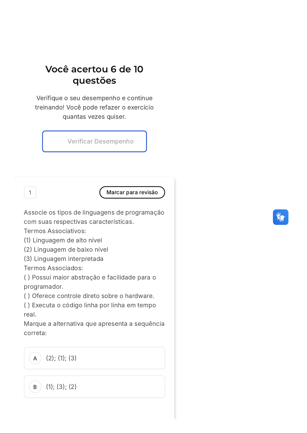 Você acertou 6 de 10 questões Verifique o seu desempenho e continue treinando! Você pode refazer o exercício quantas vezes quiser. Verificar Desempenho A B 1 Marcar para revisão Associe os tipos de linguagens de programação com suas respectivas características. Termos Associativos: (1) Linguagem de alto nível (2) Linguagem de baixo nível (3) Linguagem interpretada Termos Associados: ( ) Possui maior abstração e facilidade para o programador. ( ) Oferece controle direto sobre o hardware. ( ) Executa o código linha por linha em tempo real. Marque a alternativa que apresenta a sequência correta: (2); (1); (3) (1); (3); (2) C D E (1); (2); (3) (3); (2); (1) (2); (3); (1) Resposta correta Parabéns, você selecionou a alternativa correta. Confira o gabarito comentado! Gabarito Comentado Linguagens de alto nível abstraem a complexidade do hardware, enquanto linguagens de baixo nível, como Assembly, permitem manipulação direta dos recursos do sistema. Já linguagens interpretadas processam o código em tempo real, favorecendo testes dinâmicos. Se precisar de mais ajustes, posso refinar as questões! 2 Marcar para revisão A evolução das unidades de armazenamento trouxe avanços significativos no desempenho dos sistemas computacionais. Comparando HDs e SSDs, qual das opções abaixo descreve corretamente uma vantagem dos SSDs em relação aos HDs tradicionais? A B C D E Os SSDs possuem maior capacidade de armazenamento por um custo mais baixo Os SSDs armazenam dados de forma volátil, garantindo maior eficiência energética. Os SSDs utilizam chips de memória flash, eliminando partes móveis e reduzindo a latência de acesso Os SSDs dependem de discos magnéticos para leitura e gravação, resultando em maior confiabilidade Os SSDs não sofrem degradação ao longo do tempo, ao contrário dos HDs tradicionais Resposta correta Parabéns, você selecionou a alternativa correta. Confira o gabarito comentado! Gabarito Comentado Os SSDs são mais rápidos do que os HDs tradicionais porque não possuem partes móveis. Eles utilizam memória flash para armazenar dados, resultando em menor tempo de resposta e maior durabilidade, além de serem mais resistentes a impactos físicos A B C D E 3 Marcar para revisão Considere um projeto que exige controle direto sobre o hardware para otimização de recursos e precisão operacional. Qual linguagem de programação seria mais adequada para atender essas demandas? Python Assembly JavaScript C# SQL Resposta correta Parabéns, você selecionou a alternativa correta. Confira o gabarito comentado! Gabarito Comentado Assembly permite acesso direto aos recursos de hardware, como memória e registradores. É ideal para aplicações onde controle e precisão são fundamentais, como sistemas embarcados e operacionais A B C D E 4 Marcar para revisão A história dos computadores e da computação é marcada pela constante miniaturização e sofisticação do hardware. Uma tecnologia que alterou drasticamente os computadores foi o Circuito Integrado. A grande vantagem dessa tecnologia é: Redução do barulho na operação do circuito. Diminuição do consumo de energia do circuito. Diminuição de tamanho do circuito. Novas funções no circuito. Aumento da ventilação no circuito. Resposta correta Parabéns, você selecionou a alternativa correta. Confira o gabarito comentado! Gabarito Comentado A grande vantagem da tecnologia do Circuito Integrado é a diminuição de tamanho do circuito. Os Circuitos Integrados são compostos por diversos transistores e portas lógicas em uma única pastilha de silício. Esta evolução tecnológica permitiu a miniaturização dos componentes do computador, tornando-os A B C mais compactos e eficientes, sem comprometer seu desempenho. Portanto, a principal contribuição dos Circuitos Integrados para a história da computação foi a redução significativa do tamanho dos circuitos, possibilitando a criação de computadores cada vez menores e mais poderosos. 5 Marcar para revisão Os sistemas operacionais desempenham funções essenciais na gestão de recursos e na segurança do sistema. Durante o gerenciamento de ____, o sistema operacional organiza a utilização da CPU para garantir eficiência no processamento. Além disso, ao administrar ____, ele assegura que cada programa tenha acesso exclusivo à sua área de memória. Por fim, o gerenciamento de dispositivos de ____, como teclado e monitor, garante a interação eficaz entre hardware e software. Assinale a alternativa que contém a sequência correta para preencher as lacunas acima: processos - memória - entrada e saída dispositivos - CPU - memória memória - processos - hardware D E A B segurança - processos - entrada e saída dispositivos - segurança - hardware Resposta correta Parabéns, você selecionou a alternativa correta. Confira o gabarito comentado! Gabarito Comentado O gerenciamento de processos organiza o uso da CPU, a alocação de memória garante exclusividade para os programas, e a administração dos dispositivos de entrada e saída possibilita a interação entre hardware e software de forma eficiente e segura 6 Marcar para revisão Os componentes que formam o cerne da infraestrutura da internet, responsáveis por cobrir as enormes distâncias intercontinentais e transportar os datagramas pelo mundo, são chamados de: Modems. Roteadores. C D E World Wide Web. Infraestrutura de circuitos virtuais. Servidores. Resposta incorreta Opa! A alternativa correta é a letra B. Confira o gabarito comentado! Gabarito Comentado Os roteadores são os componentes que formam o núcleo da infraestrutura da internet. Eles são responsáveis por cobrir as grandes distâncias intercontinentais e transportar os datagramas (pacotes de dados) pelo mundo. Os Sistemas Autônomos e os roteadores de Backbone permitem a interconexão e a troca de pacotes no ambiente de roteamento global. Portanto, a alternativa correta é Roteadores. 7 Marcar para revisã