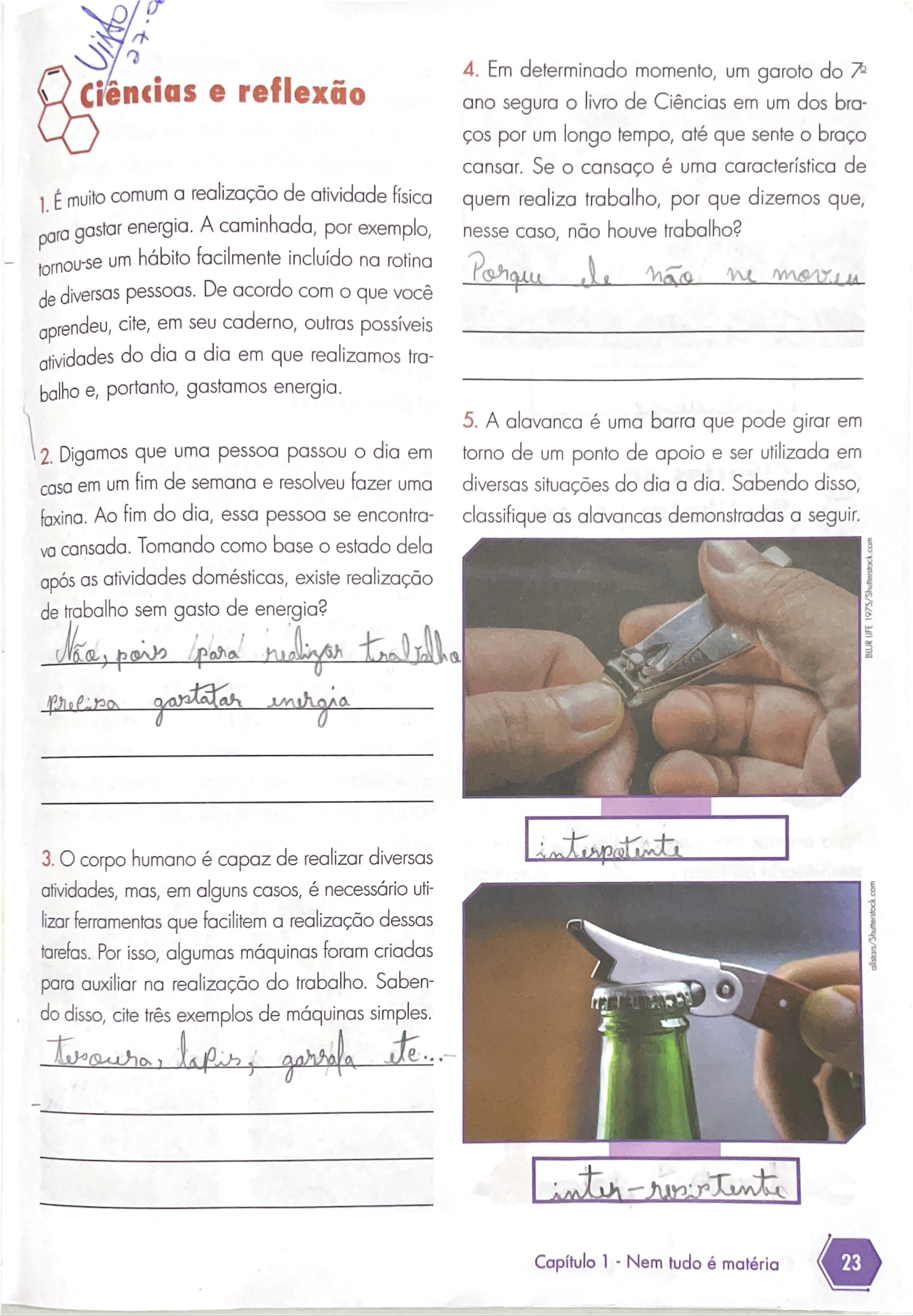 4. Em determinado momento, um garoto do Ciências e reflexão ano segura livro de Ciências em um dos bra- por um longo tempo, até que sente braço cansar. Se cansaço é uma característica de 1. É muito comum a realização de atividade física quem realiza trabalho, por que dizemos que, para gastar energia. A caminhada, por exemplo, nesse caso, não houve trabalho? tornou-se um hábito facilmente incluído na rotina Porque não ne moven de diversas pessoas. De acordo com que você aprendeu, cite, em seu caderno, outras possíveis atividades do dia a dia em que realizamos tra- balho e, portanto, gastamos energia. 5. A alavanca é uma barra que pode girar em 2. Digamos que uma pessoa passou O dia em torno de um ponto de apoio e ser utilizada em casa em um fim de semana e resolveu fazer uma diversas situações do dia a dia. Sabendo disso, faxina. Ao fim do dia, essa pessoa se encontra- classifique as alavancas demonstradas a seguir. va cansada. Tomando como base estado dela após as atividades domésticas, existe realização de trabalho sem gasto de energia? Não, realizar BLUR LIFE 1975/Shutterstock.com gastatar 3.0 corpo humano é capaz de realizar diversas atividades, mas, em alguns casos, é necessário uti- lizar ferramentas que facilitem a realização dessas tarefas. Por isso, algumas máquinas foram criadas allstars/Shutterstock.com para auxiliar na realização do trabalho. Saben- do disso, cite três exemplos de máquinas simples. garrala Capítulo 1 Nem tudo é matéria 232. Latas de bebidas, como refrigerantes, são embalagens metálicas totalmente lacradas, às quais são adicionados, em sua superfície supe- rior, pequenos dispositivos em forma de argola, que são empregados em sua abertura. princí- pio de ação desse dispositivo é um exemplo de: of alavanca. b) polia. c) cunha. d) parafuso. e) plano inclinado. Ciências no 3. A acessibilidade é um elemento essencial da mobilidade urbana, possibilitando a pessoas com Vestibular Enem as mais diversas características circularem e apro- veitarem mesmos espaços. Ela proporciona 1. (Uerj) A figura abaixo ilustra uma ferramenta uma vida digna aos indivíduos, eliminando utilizada para apertar OU desapertar determina- minimizando os entraves ao acesso de pessoas das peças metálicas. com deficiência física, idosos, gestantes e crian- ças. Infelizmente, na maioria das cidades brasi- leiras, essa inclusão ainda não é uma realidade. Dois dos mais comuns elementos relacionados à acessibilidade são as rampas de acesso e ele- vadores em transportes públicos. Ambos repre- Para apertar uma peça aplicando-se a menor sentados nas imagens a seguir. intensidade de força possível, essa ferramenta deve ser segurada de acordo com O esquema indicado em: com a) b) c) 24 Eixo 1 Matéria e energia anoPodemos concluir que rampas e elevadores em frotas de veículos são exemplos de: a) alavanca e ferramenta. plano inclinado e máquina complexa. c) plano inclinado e máquina simples. d) cunha e roldana. e) ferramenta e máquina simples. 4. Para suspender um balde contendo água do fundo de um poço, é recomendável USO de um tipo de: a) alavanca. d) parafuso. b) plano inclinado. polia. c) cunha. 5. (Enem-Adaptada) Gangorra é um brinquedo que consiste em uma tábua longa e estreita, equili- brada e fixada no seu ponto central (pivô). Nesse brinquedo, duas pessoas se sentam nas extremi- dades e, alternadamente, impulsionam-se para cima, fazendo descer a extremidade oposta, reali- zando, assim, movimento da gangorra. B Pivô A Imagine que você (A) e seu amigo (B) estavam brincando em uma gangorra quando ele resolveu se sentar um pouco mais perto do pivô. Nesse caso, a dificuldade que você tem em levantá-lo: a) não se altera, já que pivô consegue equilibrar esforço. b) aumenta, já que houve aumento da haste da alavanca. c) aumenta, porque houve redução da distância entre corpo dele e O pivô. d) diminui, porque houve redução da distância entre O corpo dele e pivô. e) diminui, porque a haste da alavanca se torna maior com a aproximação do corpo dele. 6. A mandíbula é um OSSO que funciona como uma máquina simples, que é a: cunha. alavanca. b) polia. d) plano inclinado. Capítulo 1 Nem tudo é matéria 25