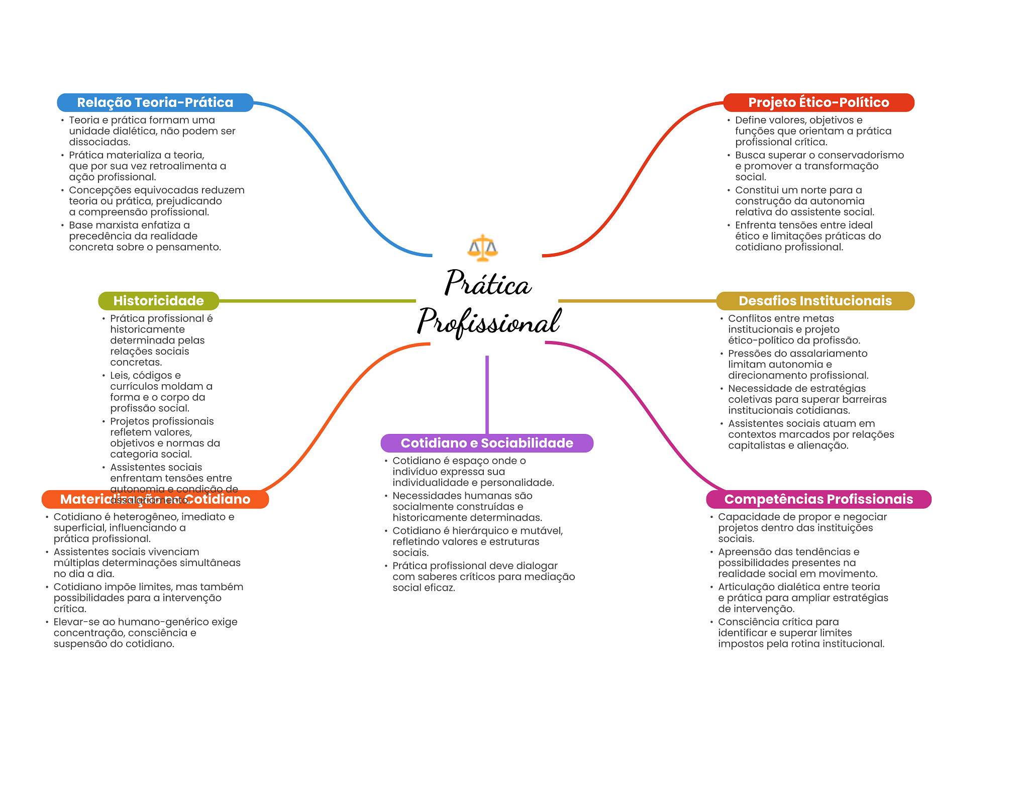 Relação Teoria-Prática Projeto Ético-Político Teoria e prática formam uma Define valores, objetivos e unidade dialética, não podem ser funções que orientam a prática dissociadas. profissional crítica. Prática materializa a teoria, Busca superar conservadorismo que por sua vez retroalimenta a e promover a transformação ação profissional. social. Concepções equivocadas reduzem Constitui um norte para a teoria ou prática, prejudicando construção da autonomia a compreensão profissional. relativa do assistente social. Base marxista enfatiza a Enfrenta tensões entre ideal precedência da realidade ético e limitações práticas do concreta sobre pensamento. cotidiano profissional. Prática Historicidade Desafios Institucionais Prática profissional é Profissional Conflitos entre metas historicamente institucionais e projeto determinada pelas ético-político da profissão. relações sociais Pressões do assalariamento concretas. limitam autonomia e Leis, códigos e direcionamento profissional. currículos moldam a Necessidade de estratégias forma e corpo da coletivas para superar barreiras profissão social. institucionais cotidianas. Projetos profissionais Assistentes sociais atuam em refletem valores, contextos marcados por relações objetivos e normas da Cotidiano e Sociabilidade capitalistas e alienação. categoria social. Cotidiano é espaço onde Assistentes sociais indivíduo expressa sua enfrentam tensões entre individualidade e personalidade. autonomia e condição de Cotidiano Necessidades humanas são socialmente construídas e Competências Profissionais Cotidiano é heterogêneo, imediato e historicamente determinadas. Capacidade de propor e negociar superficial, influenciando a Cotidiano é hierárquico e mutável, projetos dentro das instituições prática profissional. refletindo valores e estruturas sociais. Assistentes sociais vivenciam sociais. Apreensão das tendências e múltiplas determinações simultâneas Prática profissional deve dialogar possibilidades presentes na no dia a dia. com saberes críticos para mediação realidade social em movimento. Cotidiano impõe limites, mas também social eficaz. Articulação dialética entre teoria possibilidades para a intervenção e prática para ampliar estratégias crítica. de intervenção. Elevar-se ao humano-genérico exige Consciência crítica para concentração, consciência e identificar e superar limites suspensão do cotidiano. impostos pela rotina institucional.