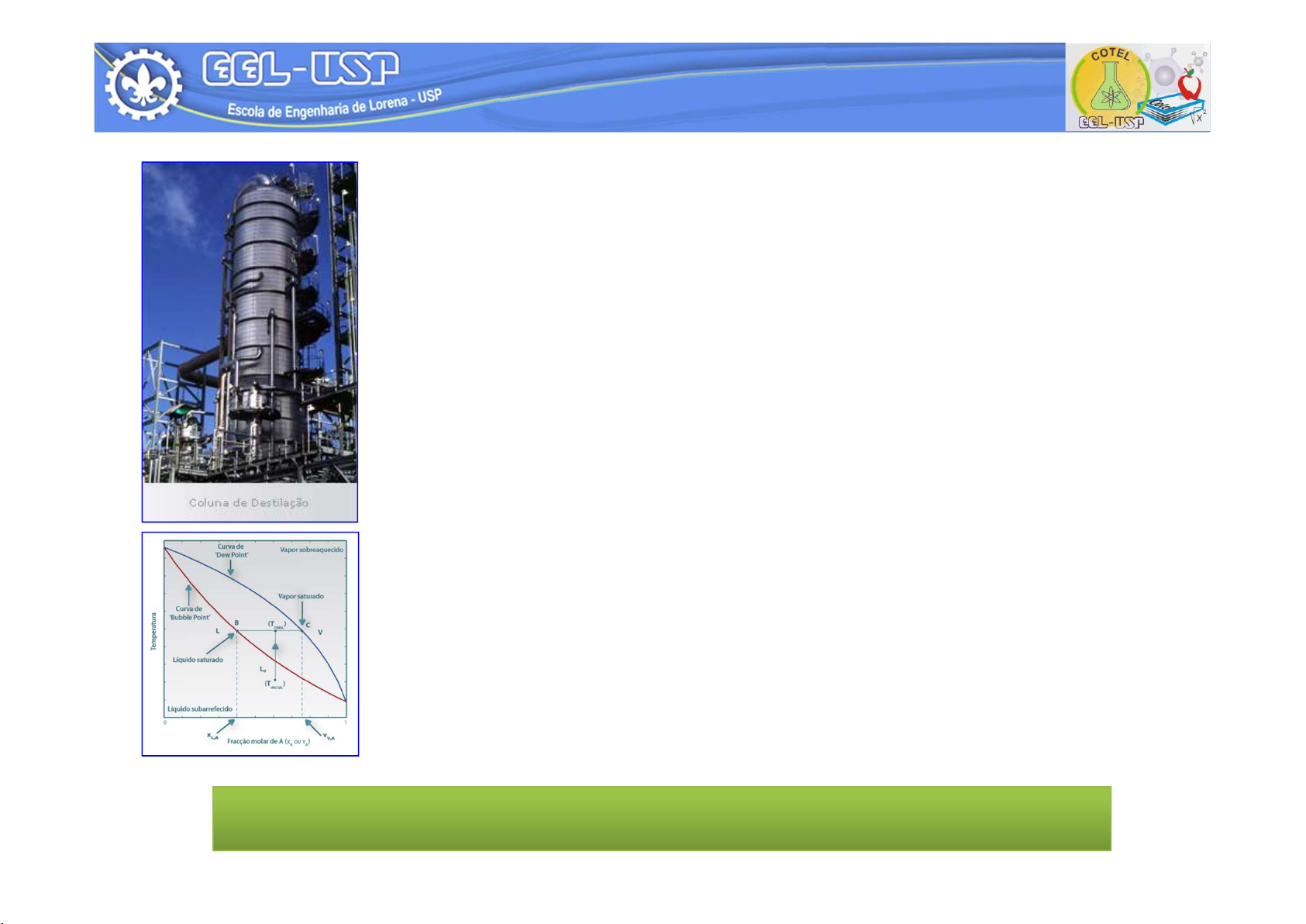 Colégio Técnico de Lorena (COTEL) Operações Unitárias Destilação Atenção: Estas notas destinam-se exclusivamente a servir como roteiro de estudo. Figuras e tabelas de outras fontes foram reproduzidas estritamente com fins didáticos. Prof. Lucrécio Fábio dos Santos Departamento de Engenharia Química LOQ/EEL A destilação é uma operação unitária frequentemente utilizada para: • Separar líquidos miscíveis com volatilidades diferentes; • Separar líquidos de sólidos solúveis. DESTILAÇÃO 2 Refinarias de petróleo: para separação do petróleo em diversos hidrocarbonetos de menor peso molecular; Indústrias de biocombustíveis,: como na purificação do etanol; Separação do ar: para obtenção de gases puros (oxigênio, nitrogênio); Indústrias de alimentos: para fabricação de bebidas destiladas e obtenção de essências vegetais; Indústria de perfumaria e cosméticos: na extração de óleos essenciais de folhas e ervas para agentes aromatizantes; Dessalinização da água. Aplicação industrial 3 A destilação é uma Operação Unitária integrada no conjunto das operações de Transferência de Massa. O mecanismo envolvido nesta operação de separação baseia-se no princípio do equilíbrio líquido/vapor. Classificação 4 Princípio do processo Operação baseada na separação de misturas homogêneas por sua volatilização parcial. A separação ocorre devido a diferenças de volatilidade. Os vapores gerados são mais ricos nos componentes mais voláteis do que o líquido (mistura inicial), o que possibilita a separação das frações. Equilíbrio líquido vapor de uma mistura binária 5 Princípio do processo Diagrama de fase líquido-vapor Equilíbrio líquido vapor de uma mistura binária A linha horizontal, em Tfinal (B-C), é chamada de linha de amarração; ela liga as composições de líquido e vapor que estão em equilíbrio Principais tipos de destilação Destilação diferencial (batelada); Destilação flash; Destilação fracionada (Contínuo – multiestágio); Destilação por arraste por vapor d’água; Destilação extrativa. 7 Os métodos de separação diferem um do outro pelo modo de conduzir a operação e pelo tipo de equipamento utilizado, porém todos estão baseados por um mesmo princípio: o vapor produzido por uma dada mistura está geralmente mais concentrado do que o líquido. 8 Principais tipos de destilação Destilação diferencial A mistura líquida é aquecida dentro de um recipiente (vaso) onde parte do líquido evapora. A fase vaporizada contém a maior parte dos componentes mais voláteis. Esse vapor é resfriado em um condensador formando um líquido que é recolhido em outro recipiente Como resultado do processo tem-se duas frações líquidas com composições diferentes: • o líquido restante no balão (com alta concentração dos componentes menos voláteis); • o condensado (com concentração mais alta dos componentes mais voláteis). 9 Destilação diferencial 10 Destilação diferencial o Baixa eficiência (um único estágio). o São utilizadas para a separação de impurezas não voláteis ou para separar líquidos de pontos de ebulição muito afastados . o Pode ser utilizada como uma etapa inicial de remoção de componentes mais voláteis. o Utilizada em escala de bancada, por ser de simples operação e baixo custo de implementação. 11 Destilação diferencial Utilizada também na indústria de bebidas. 12 Destilação Fracionada No decorrer da destilação, o ponto de ebulição da mistura sofre uma elevação gradual, uma vez que a composição do vapor se torna cada vez mais rica no componente mais volátil. Para purificar misturas deste tipo, seria necessário separar a primeira fração do destilado, rica no componente mais volátil e novamente destilar esta primeira fração separadamente, repetindo várias vezes este processo até obter a composição desejada na fração destilada final. 13 Uma outra maneira de realizar esta operação é com o emprego de colunas de fracionamento. Destilação Fracionada 14 Torre de destilação de uma refinaria de petróleo (processo contínuo) Destilação Fracionada 15 Torre de destilação de uma refinaria de petróleo (processo contínuo) Destilação Fracionada 16 Vídeo Baixa eficiência (um único estágio); Normalmente utilizada como uma etapa auxiliar à outra operação de destilação. (processo contínuo) Destilação Flash Despressurização rápida 17 (processo contínuo) Destilação Flash 18 (processo contínuo) Destilação Flash 19 Destilação por arraste a vapor d’água O vapor que sai da mistura arrasta preferencialmente o componente mais volátil. É um método variante de destilação simples, consiste em injetar vapor no balão em vez de realizar o aquecimento direto. 20 Seu maior emprego é a vaporização de misturas com características desfavoráveis de transferência da calor ou de líquidos que se decompõem quando destilados normalmente à pressão atmosférica. Destilação por arraste a vapor d’água 21 22 EXERCÍCIO Observe o diagrama de fase líquido-vapor mostrado na próxima tela e responda as seguintes questões: 1. O que significam as linhas denominadas de a e b no diagrama de fases? 2. Defina ponto de bolha (“bubble point”) e ponto de orvalho (“dew point”). 3. Suponha um aquecimento de uma mistura de dois líquidos miscíveis em um processo de destilação, conforme mostrado no diagrama de Tinicial até Tfinal. De acordo com o diagrama, após este aquecimento qual é a composição da fase líquida e da fase vapor, em termos de fração molar? 23 24 Ponto de bolha. Quando um líquido composto por dois ou mais componentes é aquecido, o ponto de bolha é a temperatura (a uma dada pressão) onde a primeira bolha de vapor é formada. ... Para um único componente, o ponto de bolha e oponto de orvalho são os mesmos e são referidos como o ponto de ebulição.