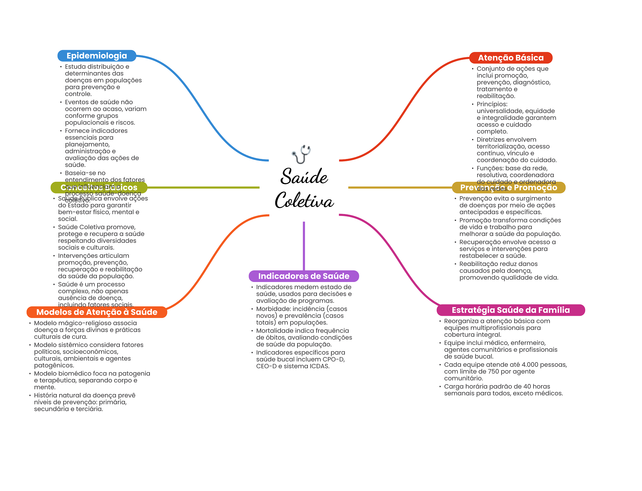 Epidemiologia Atenção Básica Estuda distribuição e Conjunto de ações que determinantes das inclui promoção, doenças em populações prevenção, diagnóstico, para prevenção e tratamento e controle. reabilitação. Eventos de saúde não Princípios: ocorrem ao acaso, variam universalidade, equidade conforme grupos e integralidade garantem populacionais e riscos. acesso e cuidado Fornece indicadores completo. essenciais para Diretrizes envolvem planejamento, territorialização, acesso administração e contínuo, vínculo e avaliação das ações de coordenação do cuidado. saúde. Funções: base da rede, Baseia-se no entendimento dos fatores Saúde resolutiva, coordenadora do cuidado e ordenadora Promoção processo saúde doença envolve ações Coletiva Prevenção evita surgimento do Estado para garantir de doenças por meio de ações bem-estar físico, mental e antecipadas e específicas. social. Promoção transforma condições Saúde Coletiva promove, de vida e trabalho para protege e recupera a saúde melhorar a saúde da população. respeitando diversidades Recuperação envolve acesso a sociais e culturais. serviços e intervenções para Intervenções articulam restabelecer a saúde. promoção, prevenção, Reabilitação reduz danos recuperação e reabilitação causados pela doença, da saúde da população. Indicadores de Saúde promovendo qualidade de vida. Saúde é um processo Indicadores medem estado de complexo, não apenas saúde, usados para decisões e ausência de doença, incluindo fatores sociais avaliação de programas. Modelos de Atenção à Saúde Morbidade: incidência (casos Estratégia Saúde da Família novos) e prevalência (casos Modelo mágico-religioso associa totais) em populações. Reorganiza a atenção básica com doença a forças divinas e práticas Mortalidade indica frequência equipes multiprofissionais para culturais de cura. de óbitos, avaliando condições cobertura integral. Modelo sistêmico considera fatores de saúde da população. Equipe inclui médico, enfermeiro, políticos, socioeconômicos, Indicadores específicos para agentes comunitários e profissionais culturais, ambientais e agentes de saúde bucal. saúde bucal incluem CPO-D, patogênicos. CEO-D e sistema ICDAS. Cada equipe atende até 4.000 pessoas, Modelo biomédico foca na patogenia com limite de 750 por agente e terapêutica, separando corpo e comunitário. mente. Carga horária padrão de 40 horas História natural da doença prevê semanais para todos, exceto médicos. níveis de prevenção: primária, secundária e terciária.