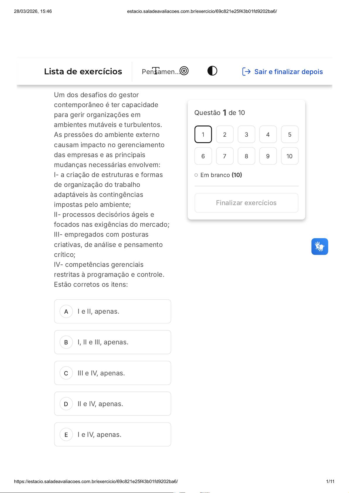 A B C D E 1 Marcar para revisão Um dos desafios do gestor contemporâneo é ter capacidade para gerir organizações em ambientes mutáveis e turbulentos. As pressões do ambiente externo causam impacto no gerenciamento das empresas e as principais mudanças necessárias envolvem: I- a criação de estruturas e formas de organização do trabalho adaptáveis às contingências impostas pelo ambiente; II- processos decisórios ágeis e focados nas exigências do mercado; III- empregados com posturas criativas, de análise e pensamento crítico; IV- competências gerenciais restritas à programação e controle. Estão corretos os itens: I e II, apenas. I, II e III, apenas. III e IV, apenas. II e IV, apenas. I e IV, apenas. Questão 1 de 10 Em branco (10) 1 2 3 4 5 6 7 8 9 10 Finalizar exercícios Lista de exercícios Pensamen… Sair e finalizar depois 28/03/2026, 15:46 estacio.saladeavaliacoes.com.br/exercicio/69c821e25f43b01fd9202ba6/ https://estacio.saladeavaliacoes.com.br/exercicio/69c821e25f43b01fd9202ba6/ 1/11 A B C D E 2 Marcar para revisão O termo VUCA tem sido utilizado para descrever o mundo atual e seus desafios. Esse acrônimo é uma forma de representar as mudanças rápidas e constantes que ocorrem na sociedade, na economia e na política. O que significa o termo VUCA? Voluntariedade, unificação, coerência, adaptabilidade. Voluntariedade, unicidade, clareza, ação. Volatilidade, unicidade, coerência, ação. Volatilidade, incerteza, complexidade, ambiguidade. Volatilidade, incerteza, clareza, adaptabilidade. 3 Marcar para revisão João Ribeiro é diretor de uma empresa de médio porte que atua em um segmento de produtos químicos. Recentemente, ele participou de um fórum com outros executivos no qual foram discutidas mudanças nas normas e leis vigentes do segmento, bem como um possível aumento de tributação 28/03/2026, 15:46 estacio.saladeavaliacoes.com.br/exercicio/69c821e25f43b01fd9202ba6/ https://estacio.saladeavaliacoes.com.br/exercicio/69c821e25f43b01fd9202ba6/ 2/11 A B C D E A B (impostos). É importante que João acompanhe esses aspectos que estão relacionados às: variáveis político-legais. variáveis econômicas. variáveis financeiras. variáveis dinâmicas. variáveis de mercado. 4 Marcar para revisão É no ambiente interno de uma empresa que se encontra pontos fortes e fracos que refletem a singularidade de cada organização. Mas o que é o ambiente interno de uma empresa? É o ambiente que reflete apenas as peculiaridades de cada empresa. É o ambiente que influencia diretamente a concorrência externa. 28/03/2026, 15:46 estacio.saladeavaliacoes.com.br/exercicio/69c821e25f43b01fd9202ba6/ https://estacio.saladeavaliacoes.com.br/exercicio/69c821e25f43b01fd9202ba6/ 3/11 C D E A B É o ambiente que se dissocia dos recursos tangíveis e intangíveis de uma empresa.. É o ambiente específico dos recursos humanos de uma organização. É o ambiente que é composto por fatores que influenciam diretamente na capacidade da empresa de se desenvolver e atingir objetivos. 5 Marcar para revisão A visão sistêmica é uma abordagem que vê as organizações como um todo interconectado e interdependente e o propósito é uma parte essencial dessa equação. Qual é a importância do propósito para as organizações? O propósito é importante para a diferenciação entre organizações públicas e privadas. O propósito é o que garante o lucro das empresas privadas. 28/03/2026, 15:46 estacio.saladeavaliacoes.com.br/exercicio/69c821e25f43b01fd9202ba6/ https://estacio.saladeavaliacoes.com.br/exercicio/69c821e25f43b01fd9202ba6/ 4/11 C D E O propósito é o que garante o financiamento das organizações sem fins lucrativos. O propósito é o que dá uma razão para a existência de qualquer organização, é o seu legado para a sociedade. O propósito é importante para a identidade cultural das organizações. 6 Marcar para revisão Existem diferentes níveis de ambiente que influenciam as empresas de maneiras distintas. O macroambiente, microambiente e ambiente interno são exemplos desses níveis. Compreender a diferença entre eles é fundamental para que a empresa possa tomar decisões estratégicas com mais precisão. Qual é a diferença entre macroambiente, microambiente e ambiente interno? 28/03/2026, 15:46 estacio.saladeavaliacoes.com.br/exercicio/69c821e25f43b01fd9202ba6/ https://estacio.saladeavaliacoes.com.br/exercicio/69c821e25f43b01fd9202ba6/ 5/11 A B C O macroambiente é composto pelos fornecedores, concorrentes e clientes da empresa, enquanto o microambiente é formado pelo ambiente social em que a organização está inserida. O microambiente é composto pelos fornecedores, concorrentes e clientes da empresa, enquanto o macroambiente é formado pelo ambiente social em que a organização está inserida. O ambiente interno é formado pelos fornecedores, concorrentes e clientes da empresa, enquanto o macroambiente é composto pelo ambiente social em que a organização está inserida. 28/03/2026, 15:46 estacio.saladeavaliacoes.com.br/exercicio/69c821e25f43b01fd9202ba6/ https://estacio.saladeavaliacoes.com.br/exercicio/69c821e25f43b01fd9202ba6/ 6/11 D E A B O microambiente é formado pelos fornecedores, concorrentes e clientes da empresa, enquanto o ambiente interno é composto pelo ambiente social em que a organização está inserida. O macroambiente é formado pelos fatores externos que formam o ambiente social, enquanto o microambiente é composto pelos elementos que influem diretamente na estratégia e na operação de determinada organização. 7 Marcar para revisão (Adaptada ENADE) Das situações a seguir, qual caracteriza uma mudança que está ocorrendo diante da nova ordem organizacional? Aumenta a importância da integração entre diferentes áreas e setores. A liderança tem um papel cada vez menor no contexto organizacional. 28/03/2026, 15:46 estacio.saladeavaliacoes.com.br/exercicio/69c821e25f43b01fd9202ba6/ https://estacio.sala