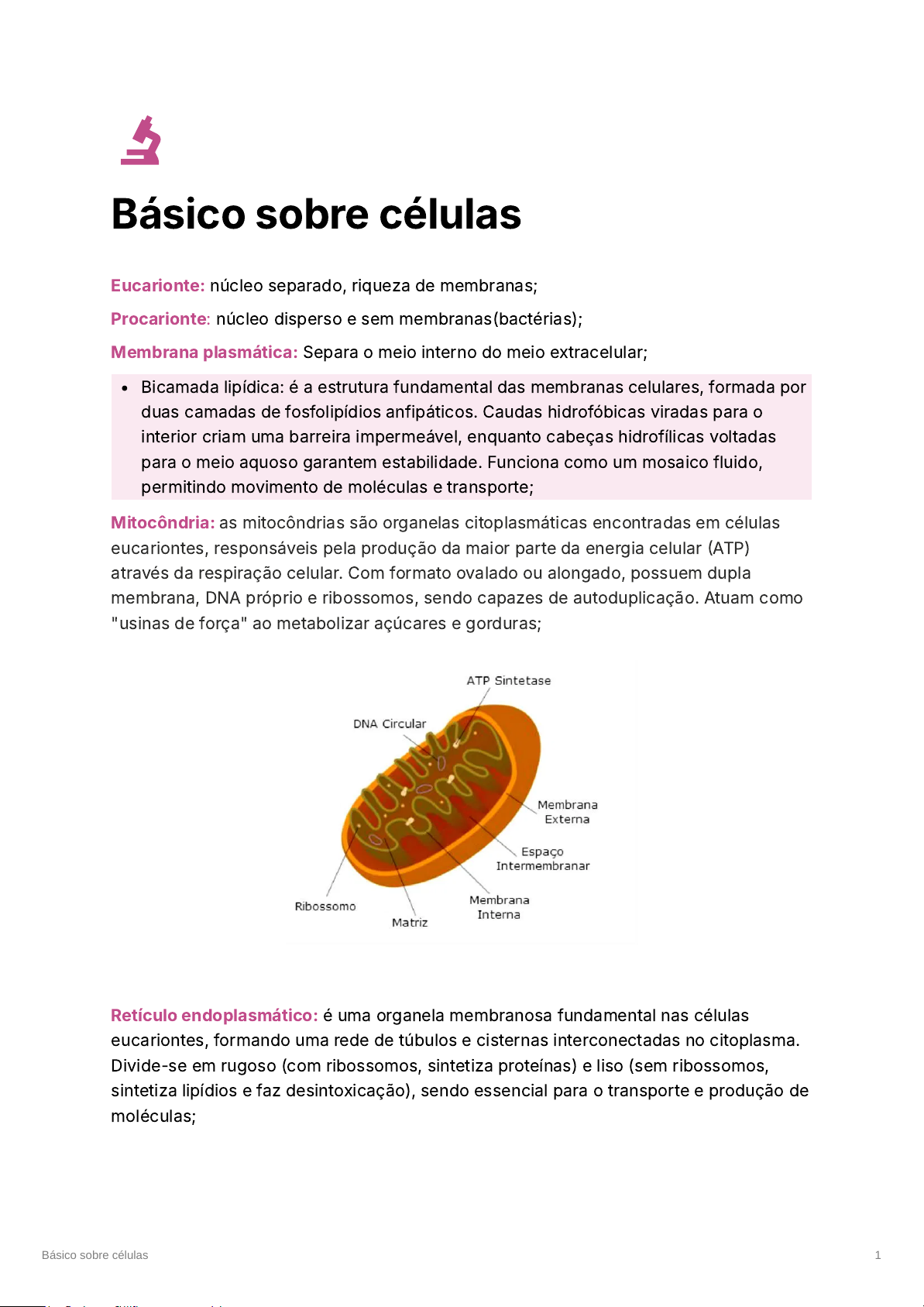 Básico sobre células Eucarionte: núcleo separado, riqueza de membranas; Procarionte: núcleo disperso e sem membranas(bactérias); Membrana plasmática: Separa o meio interno do meio extracelular; Bicamada lipídica: é a estrutura fundamental das membranas celulares, formada por duas camadas de fosfolipídios anfipáticos. Caudas hidrofóbicas viradas para o interior criam uma barreira impermeável, enquanto cabeças hidrofílicas voltadas para o meio aquoso garantem estabilidade. Funciona como um mosaico fluido, permitindo movimento de moléculas e transporte; Mitocôndria: as mitocôndrias são organelas citoplasmáticas encontradas em células eucariontes, responsáveis pela produção da maior parte da energia celular �ATP) através da respiração celular. Com formato ovalado ou alongado, possuem dupla membrana, DNA próprio e ribossomos, sendo capazes de autoduplicação. Atuam como "usinas de força" ao metabolizar açúcares e gorduras; Retículo endoplasmático: é uma organela membranosa fundamental nas células eucariontes, formando uma rede de túbulos e cisternas interconectadas no citoplasma. Divide-se em rugoso (com ribossomos, sintetiza proteínas) e liso (sem ribossomos, sintetiza lipídios e faz desintoxicação), sendo essencial para o transporte e produção de moléculas; Básico sobre células 1 Polirribossomos: são conjuntos de múltiplos ribossomos associados a uma única molécula de RNA mensageiro (mRNA); Endossomos: endossomos são vesículas membranosas (tipo “bolsinhas”) que ficam no citoplasma e ajudam a organizar e direcionar substâncias que entram na célula; Eles participam principalmente da endocitose, que é quando a célula “engole” partículas ou moléculas do meio externo; Aparelho de Golgi: é uma organela citoplasmática eucarionte, formada por pilhas de bolsas membranosas achatadas chamadas cisternas ou dictiossomos. Sua função principal é receber proteínas e lipídios do retículo endoplasmático, modificá-los, empacotá-los e distribuí-los para lisossomos, membrana plasmática ou secreção; Lisossomos: são organelas membranosas em células eucariontes, produzidas pelo Básico sobre células 2 complexo golgiense, que atuam na digestão intracelular, autofagia (reciclagem de organelas) e defesa; Peroxissomos: organelas citoplasmáticas pequenas e membranosas, presentes em células eucarióticas (animais e vegetais), especializadas em reações de oxidação. São cruciais para a desintoxicação celular (fígado/rins) e quebra de ácidos graxos; Citoesqueleto: é uma rede complexa e dinâmica de filamentos proteicos no citoplasma de células eucariontes, responsável por manter a forma celular, ancorar organelas e permitir o movimento; Depósitos citoplasmáticos: são acúmulos temporários de substâncias (nutrientes, pigmentos ou produtos celulares) dispersos no citosol, sem membrana própria. Atuam principalmente na reserva de energia (glicogênio, gorduras) e no metabolismo, diferenciando-se das organelas por não serem estruturas permanentes ou ativas; Núcleo celular: é a organela central de células eucariontes que abriga o material genético �DNA) e comanda as funções celulares, incluindo síntese proteica, Básico sobre células 3 metabolismo e reprodução; Cromatina é o conjunto de DNA e proteínas (histonas e não histonas) presente no núcleo das células eucarióticas, organizando o material genético para caber no núcleo e regular a expressão gênica. É basicamente a observação microscópica, quando a célula é densa ou não; Nucléolo é uma estrutura densa e esférica, sem membrana, situada no núcleo de células eucariontes, composta por RNA e proteínas. Sua principal função é a produção de RNA ribossômico �RNAr� e a montagem das subunidades dos ribossomos, essenciais para a síntese de proteínas. Básico sobre células 4