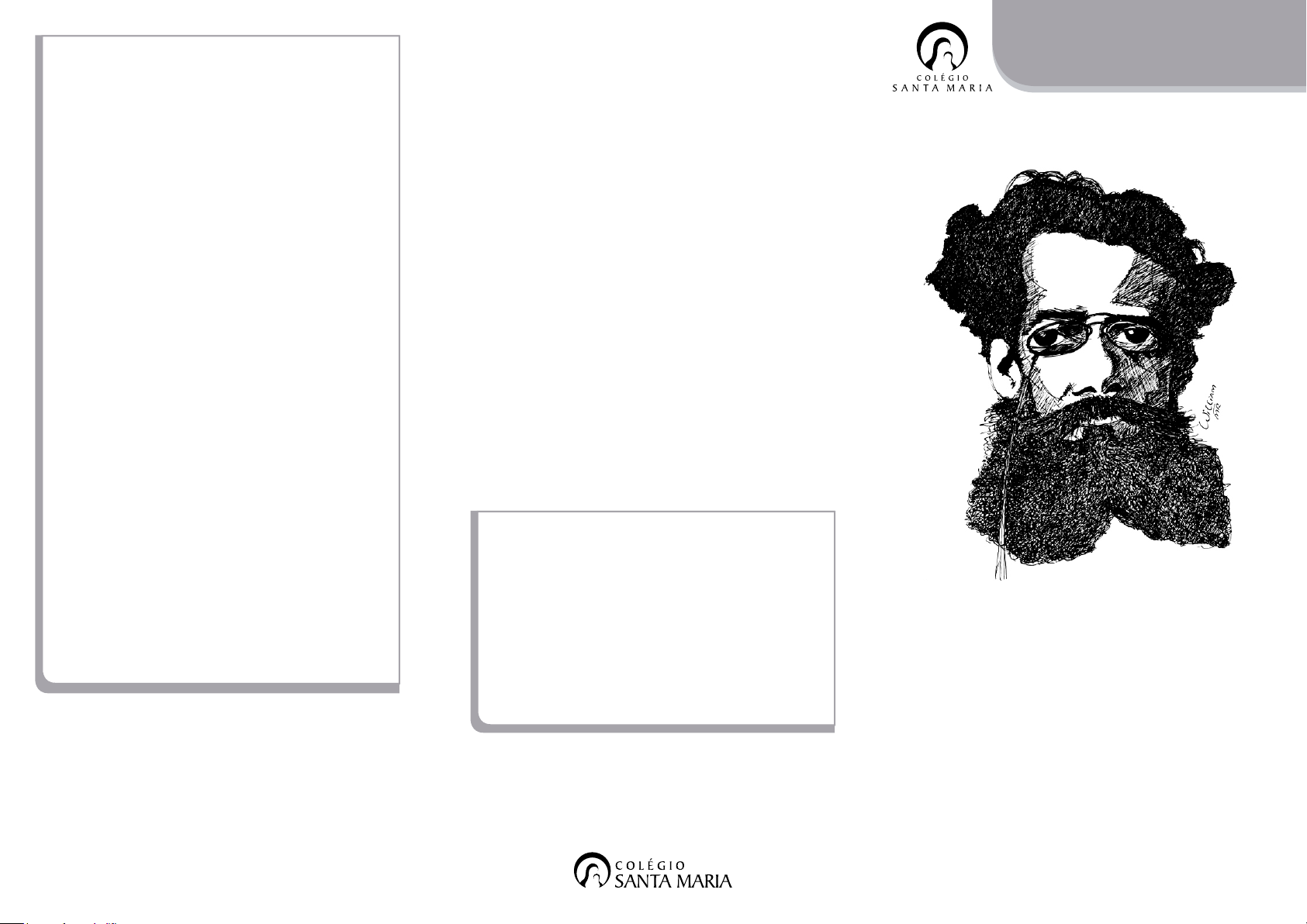 Joaquim Maria Machado de Assis nasceu no Rio de Janeiro em 1839. Com 16 anos, publicou seu primeiro trabalho literário, o poema Ela. Um ano depois conseguiu seu primeiro emprego como aprendiz de tipógrafo na Imprensa Nacional. No ano de 1860, passou a trabalhar no jornal Di- ário do Rio de Janeiro e escrever para as revistas “O Espelho”, “A Semana Ilustrada” e o “Jornal das Famílias”. Um ano depois, publicou seu primeiro livro, chamado Queda que as mulheres têm para os tolos. Em 1897, Machado de Assis e José Veríssimo fundaram a Academia Brasileira de Letras sendo eleito presidente da instituição, cargo que ocupou até sua morte em 1908. Escreveu mais de 50 livros. Ficou imortalizado por obras como Quincas Borba, Memórias Póstu- mas de Brás Cubas, Dom Casmurro e O Alienista. A Dica da Biblioteca é uma coletânea de folhetos contendo resenhas, informações biográficas e curiosi- dades sobre os grandes nomes da literatura brasileira. Neste fascículo, o autor destacado é Machado de Assis e as obras escolhidas são O Alienista, Dom Casmurro e Memórias Póstumas de Brás Cubas. Boa leitura! Apresentação Sobre o autor DICA DA BIBLIOTECA CONHECENDO A LITERATURA BRASILEIRA Nº 001 Março/2015 Machado de Assis ht tp :// ww w. hu m or da te rra .co m /2 01 1/ 03 /1 3/ ca ric at ur a- de -m ac ha do -d e- as sis -e -la nc am en to -d e- re vis ta / Para saber mais BRASIL. Ministério da Educação. Homena- gem aos 100 anos de falecimento de Macha- do de Assis (Obra Completa). Disponível em: . MACHADO DE ASSIS. Disponível em: . Em um dos textos que li sobre Machado de Assis, encontrei a palavra “EXTRAORDINÁRIO”. Ela é perfeita para defini-lo. Negro e pobre, Machado de Assis teve uma vida difícil, mas não foi diferente de muitas que já conhecemos e até mesmo vivenciamos. Porém, seu brilhantismo intelectual fez a diferença. Já na adolescência publica seu primeiro poema. Sua rede de amigos foi composta de ou- tros grandes nomes da literatura, igualmen- te brilhantes, como José de Alencar, Joaquim Manoel de Macedo, Gonçalves Dias e Manoel Antônio de Almeida. E sua trajetória profissio- nal resultou em uma vasta bibliografia até seu falecimento em setembro de 1908. Suas produções são tão importantes para a Literatura Brasileira que existem inúmeras ini- ciativas de análise de seus livros e personagens. E estes são apaixonantes. É imprescindível ler Machado de Assis! Sua obra tem textos para todos os gostos. Esco- lha um estilo, desligue-se de qualquer opinião alheia sobre os livros e construa seu próprio conceito machadiano. Opinião Daniela Luzia da Silva Gomes Unidade Contagem “Naquele tempo, por mais mulheres bonitas que achasse, nenhuma receberia a mínima parte do amor que tinha a Capitu. À minha própria mãe não queria mais que metade. Capitu era tudo e mais que tudo; não vivia nem trabalhava que não fosse pensando nela.” (ASSIS, Machado de. Dom Casmurro. 10. ed. Jaraguá do Sul: Avenida, 2005.p.170) www.santamaria.pucminas.br/biblioteca A mente humana é muito complexa e, há anos, vem sendo estudada. E essa é a ideia central do conto O Alienista, de Machado de Assis, escrito em 1886. A narrativa do livro co- meça com o retorno do Dr. Simão Bacamarte à sua terra natal Itaguaí. Estabelecido em Itaguaí, casa-se com D. Evarista uma viúva jovem que lhe poderia dar filhos saudáveis e inteligentes, mas isso não acontece, por ela ser estéril. Com o passar dos anos, Dr. Bacamarte, ocupa o seu tempo e até mesmo a sua frus- tração por não ter um herdeiro em estudar a mente humana (psiquiatria). Ele decide com a ajuda de Crispim Soares a criar um local onde poderia estudar os moradores com transtor- nos psicológicos, chamando esse local de asilo Casa Verde. Ao longo do livro o Dr. Simão Bacamarte interna cerca de 75% da população de Itaguaí, gerando, assim, revolta por seu critério de in- ternação. O restante da população se junta a Pórfiro, um barbeiro cujas pretensões eram po- líticas e não o bem-estar dos pacientes. Surge então, a Revolução Canjica. Será que essa revolução influencia nas de- cisões de Bacamarte? O que acontece com ele? Por que o título do livro é “O alienista” se 75% da população de Itaguaí era “louca”? E, por fim, Bacamarte era alienado ou um grande herói? Isso vocês irão saber após a leitura do livro. Dom Casmurro é um livro que trata de ma- neira contundente o drama vivido por alguém que ama intensa e visceralmente, um dilema atemporal e que, talvez, por isso conquiste mais fãs a cada dia; ávidos por tentar compreender o que de fato ocorreu entre Escobar, grande amigo de Bentinho e Capitu, sua amantíssima esposa. Uma história intrigante, que foi publicada há mais de um século e nos coloca diante de um grande mistério cujo desfecho até hoje, não se pode afirmar categoricamente. Impos- sível dizer se as dúvidas de Bentinho com rela- ção ao amor de Capitu são plausíveis ou infun- dadas. Entretanto, existem inúmeras hipóteses, estudos literários, e até mesmo psicológicos, a respeito da idoneidade e fidelidade de nossa heroína. Bentinho também teria sido sempre e inquestionavelmente fiel? A marca predominante dessa obra-prima da literatura é a dualidade natural do ser hu- mano, inerente à personalidade de todos nós. Somos dotados de sentimentos os mais diver- sos, como a raiva, inveja, ciúme, mas também a compaixão, o amor e a esperança. Sim, eles convivem e se digladiam em uma batalha inin- terrupta que nos torna, enfim, humanos, de- masiadamente humanos. Um clássico envolvente da literatura brasi- leira que merece ser lido e relido. Trata do amor, da afeição, da amizade e, em última análise, da complexidade dos relacionamentos humanos. Uma obra revolucionária. Logo podemos perceber que o narrador é um autor-defunto, ou defunto-autor - um morto que resolve es- crever suas memórias. Assim, ele conta sua visão de mundo, seus conh
