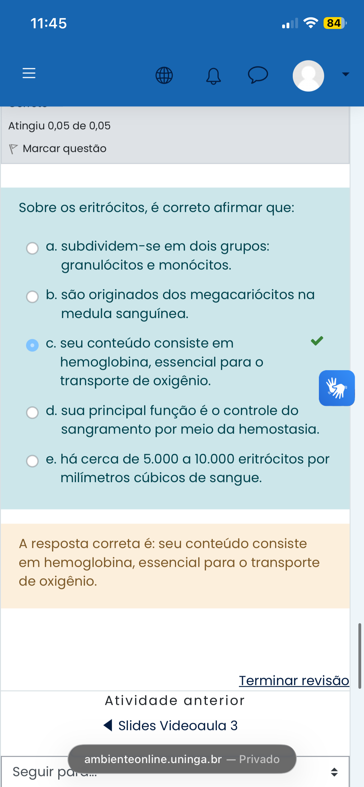 11:45 84 Atingiu 0,05 de 0,05 Marcar questão Sobre os eritrócitos, é correto afirmar que: a. subdividem-se em dois grupos: granulócitos e monócitos. b. são originados dos megacariócitos na medula sanguínea. seu conteúdo consiste em hemoglobina, essencial para transporte de oxigênio. d. sua principal função é controle do sangramento por meio da hemostasia. e. há cerca de 5.000 a 10.000 eritrócitos por milímetros cúbicos de sangue. A resposta correta é: seu conteúdo consiste em hemoglobina, essencial para o transporte de oxigênio. Terminar revisão Atividade anterior Slides Videoaula 3 ambienteonline.uninga.br - Privado Seguir