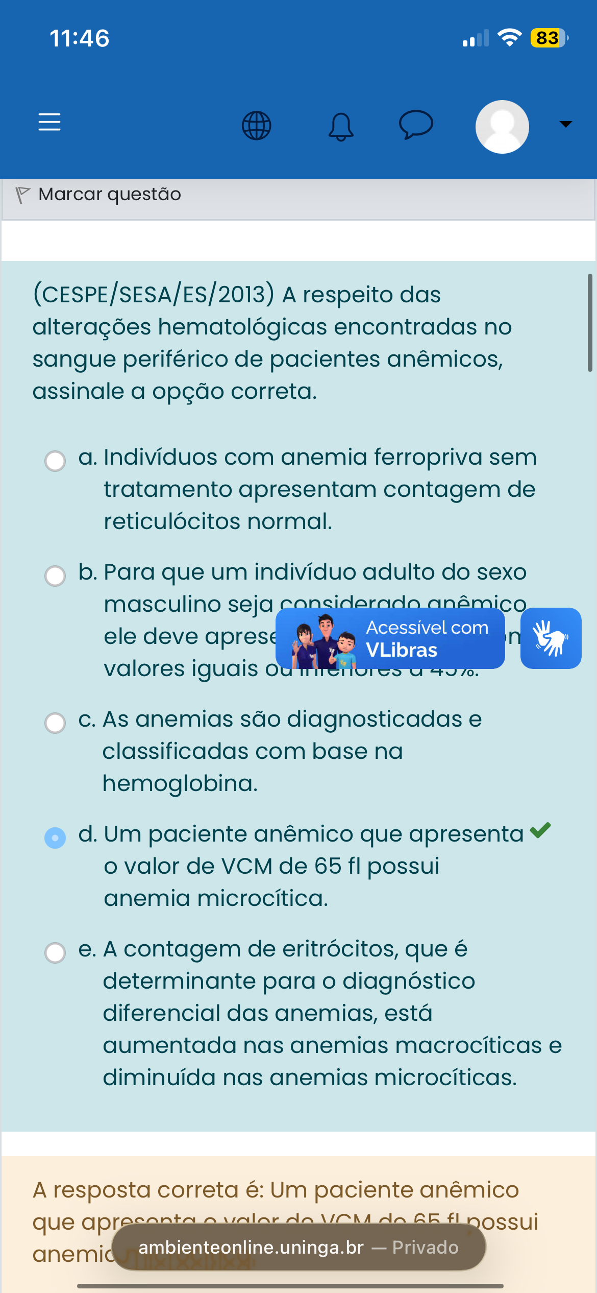 11:46 83 Marcar questão (CESPE/SESA/ES/2013) respeito das alterações hematológicas encontradas no sangue periférico de pacientes anêmicos, assinale a opção correta. a. Indivíduos com anemia ferropriva sem tratamento apresentam contagem de reticulócitos normal. b. Para que um indivíduo adulto do sexo masculino seja considerado anêmico ele deve aprese Acessível com n VLibras valores iguais ou As anemias são diagnosticadas e classificadas com base na hemoglobina. d. Um paciente anêmico que apresenta valor de VCM de 65 fl possui anemia microcítica. e. contagem de eritrócitos, que é determinante para diagnóstico diferencial das anemias, está aumentada nas anemias macrocíticas e diminuída nas anemias microcíticas. resposta correta é: Um paciente anêmico que apresenta do do 65 fl possui anemic ambienteonline.uninga.br Privado