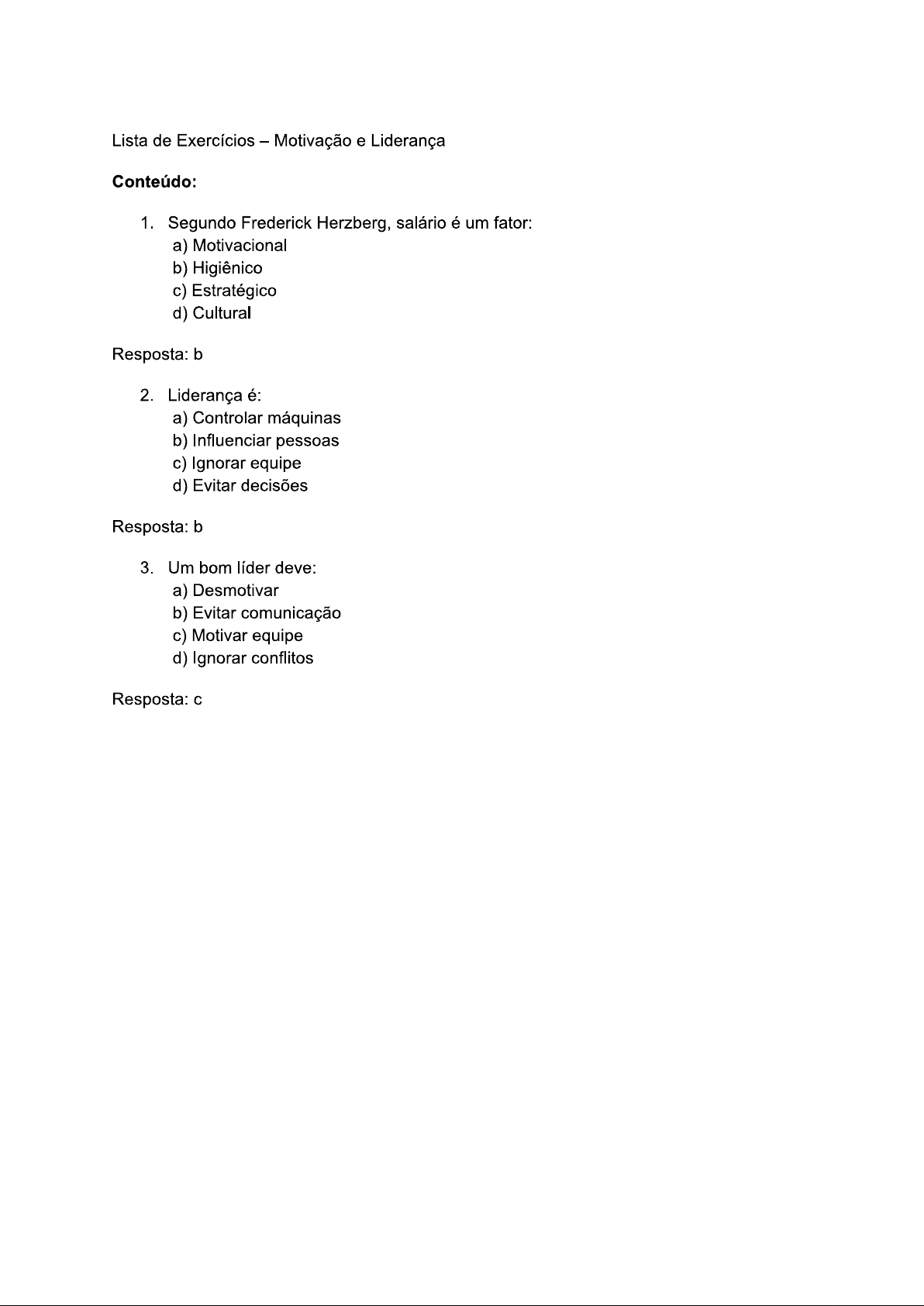 Lista de Exercícios - Motivação e Liderança Conteúdo: 1. Segundo Frederick Herzberg, salário é um fator: a) Motivacional b) Higiênico c) Estratégico d) Cultural Resposta: b 2. Liderança é: a) Controlar máquinas b) Influenciar pessoas c) Ignorar equipe d) Evitar decisões Resposta: b 3. Um bom líder deve: a) Desmotivar b) Evitar comunicação c) Motivar equipe d) Ignorar conflitos Resposta: c