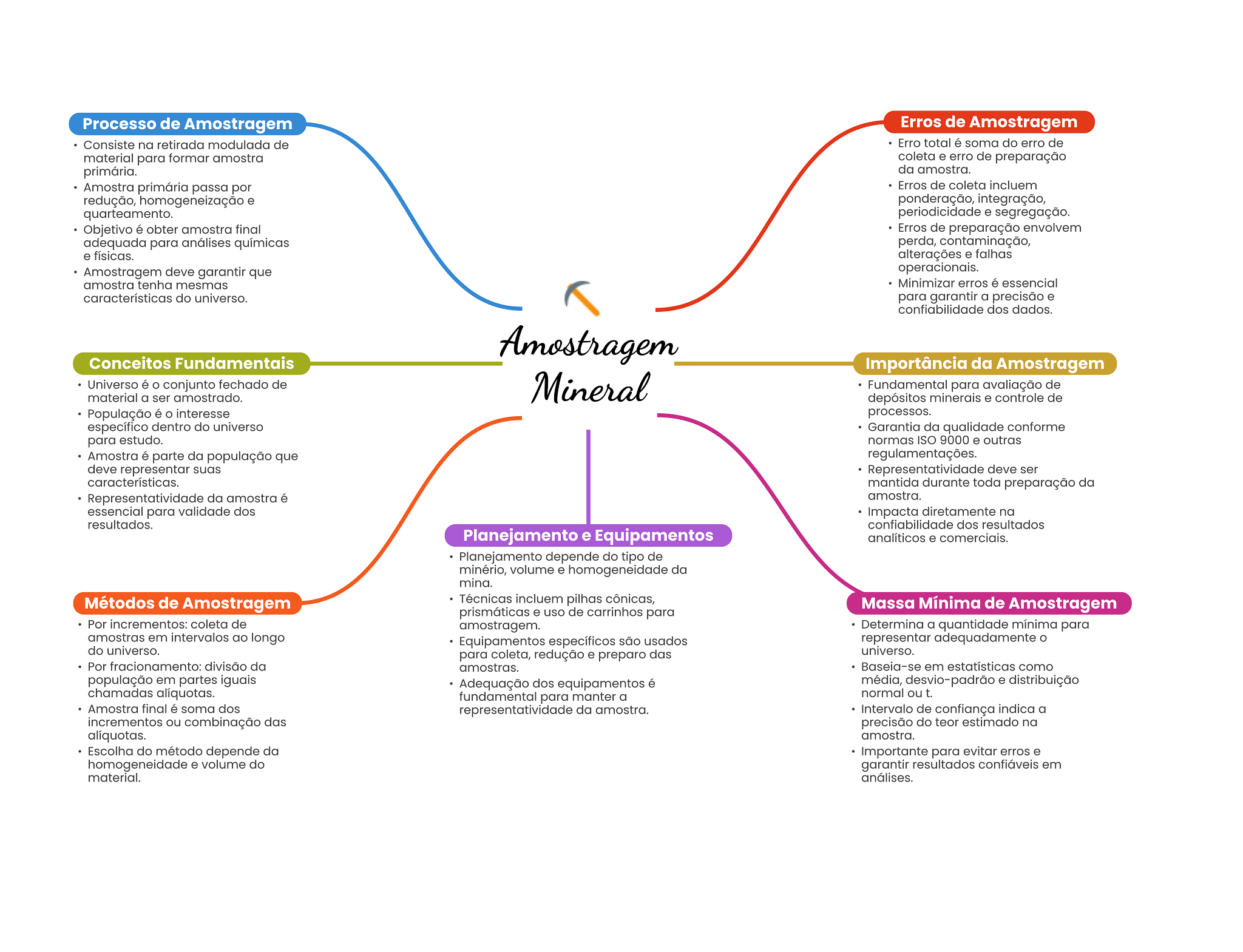 Processo de Amostragem Erros de Amostragem Consiste na retirada modulada de Erro total é soma do erro de material para formar amostra coleta e erro de preparação primária. da amostra. Amostra primária passa por Erros de coleta incluem redução, homogeneização e ponderação, integração, quarteamento. periodicidade e segregação. Objetivo é obter amostra final Erros de preparação envolvem adequada para análises químicas perda, contaminação, e físicas. alterações e falhas Amostragem deve garantir que operacionais. amostra tenha mesmas Minimizar erros é essencial características do universo. para garantir a precisão e confiabilidade dos dados. Amostragem Conceitos Fundamentais Importância da Amostragem Universo é conjunto fechado de Mineral Fundamental para avaliação de material a ser amostrado. depósitos minerais e controle de População é interesse processos. específico dentro do universo Garantia da qualidade conforme para estudo. normas ISO 9000 e outras Amostra é parte da população que regulamentações. deve representar suas Representatividade deve ser características. mantida durante toda preparação da Representatividade da amostra é amostra. essencial para validade dos Impacta diretamente na resultados. confiabilidade dos resultados Planejamento e Equipamentos analíticos e comerciais. Planejamento depende do tipo de minério, volume e homogeneidade da mina. Métodos de Amostragem Técnicas incluem pilhas cônicas, Massa Mínima de Amostragem prismáticas e uso de carrinhos para Por incrementos: coleta de amostragem. Determina a quantidade mínima para amostras em intervalos ao longo Equipamentos específicos são usados representar adequadamente do universo. para coleta, redução e preparo das universo. Por fracionamento: divisão da amostras. Baseia-se em estatísticas como população em partes iguais Adequação dos equipamentos é média, desvio-padrão e distribuição chamadas alíquotas. fundamental para manter a normal ou t. Amostra final é soma dos representatividade da amostra. Intervalo de confiança indica a incrementos ou combinação das precisão do teor estimado na alíquotas. amostra. Escolha do método depende da Importante para evitar erros e homogeneidade e volume do garantir resultados confiáveis em material. análises.