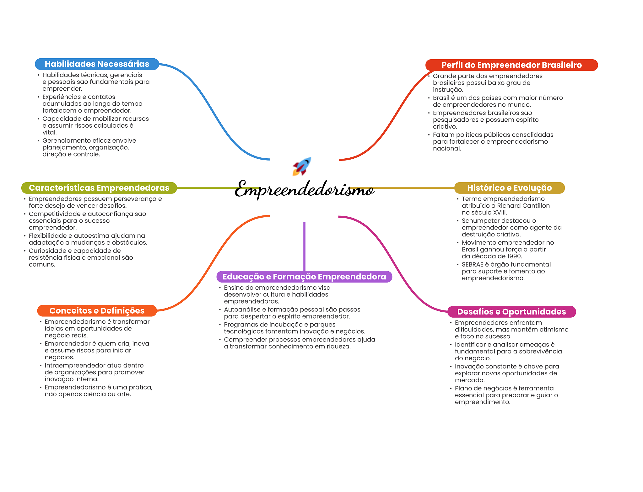 Habilidades Necessárias Perfil do Empreendedor Brasileiro Habilidades técnicas, gerenciais Grande parte dos empreendedores e pessoais são fundamentais para brasileiros possui baixo grau de empreender. instrução. Experiências e contatos Brasil é um dos países com maior número acumulados ao longo do tempo de empreendedores no mundo. fortalecem empreendedor. Empreendedores brasileiros são Capacidade de mobilizar recursos pesquisadores e possuem espírito e assumir riscos calculados é criativo. vital. Faltam políticas públicas consolidadas Gerenciamento eficaz envolve para fortalecer empreendedorismo planejamento, organização, nacional. direção e controle. Características Empreendedoras Empreendedorismo Histórico e Evolução Empreendedores possuem perseverança e Termo empreendedorismo forte desejo de vencer desafios. atribuído a Richard Cantillon Competitividade e autoconfiança são no século XVIII. essenciais para sucesso Schumpeter destacou empreendedor. empreendedor como agente da Flexibilidade e autoestima ajudam na destruição criativa. adaptação a mudanças e obstáculos. Movimento empreendedor no Curiosidade e capacidade de Brasil ganhou força a partir resistência física e emocional são da década de 1990. comuns. SEBRAE é órgão fundamental para suporte e fomento ao Educação e Formação Empreendedora empreendedorismo. Ensino do empreendedorismo visa desenvolver cultura e habilidades empreendedoras. Conceitos e Definições Autoanálise e formação pessoal são passos Desafios e Oportunidades para despertar espírito empreendedor. Empreendedorismo é transformar Programas de incubação e parques Empreendedores enfrentam ideias em oportunidades de tecnológicos fomentam inovação e negócios. dificuldades, mas mantêm otimismo negócio reais. e foco no sucesso. Compreender processos empreendedores ajuda Empreendedor é quem cria, inova a transformar conhecimento em riqueza. Identificar e analisar ameaças é e assume riscos para iniciar fundamental para a sobrevivência negócios. do negócio. Intraempreendedor atua dentro Inovação constante é chave para de organizações para promover explorar novas oportunidades de inovação interna. mercado. Empreendedorismo é uma prática, Plano de negócios é ferramenta não apenas ciência ou arte. essencial para preparar e guiar empreendimento.