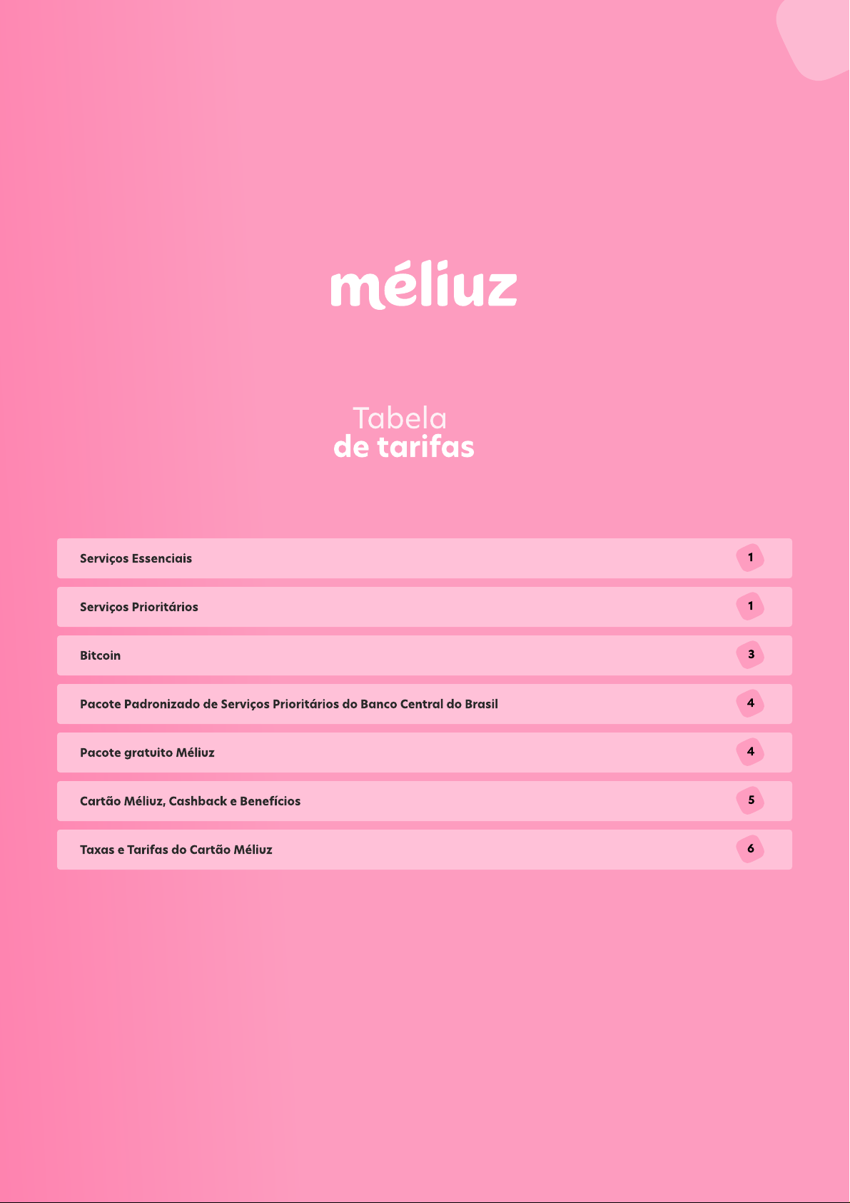 Esta tabela foi elaborada em conformidade com a Resolução do Conselho Monetário Nacional nª 3919/2021, publicada pelo Banco Central do Brasil. Fone Méliuz 0800 301 0101. Canal disponível em todo