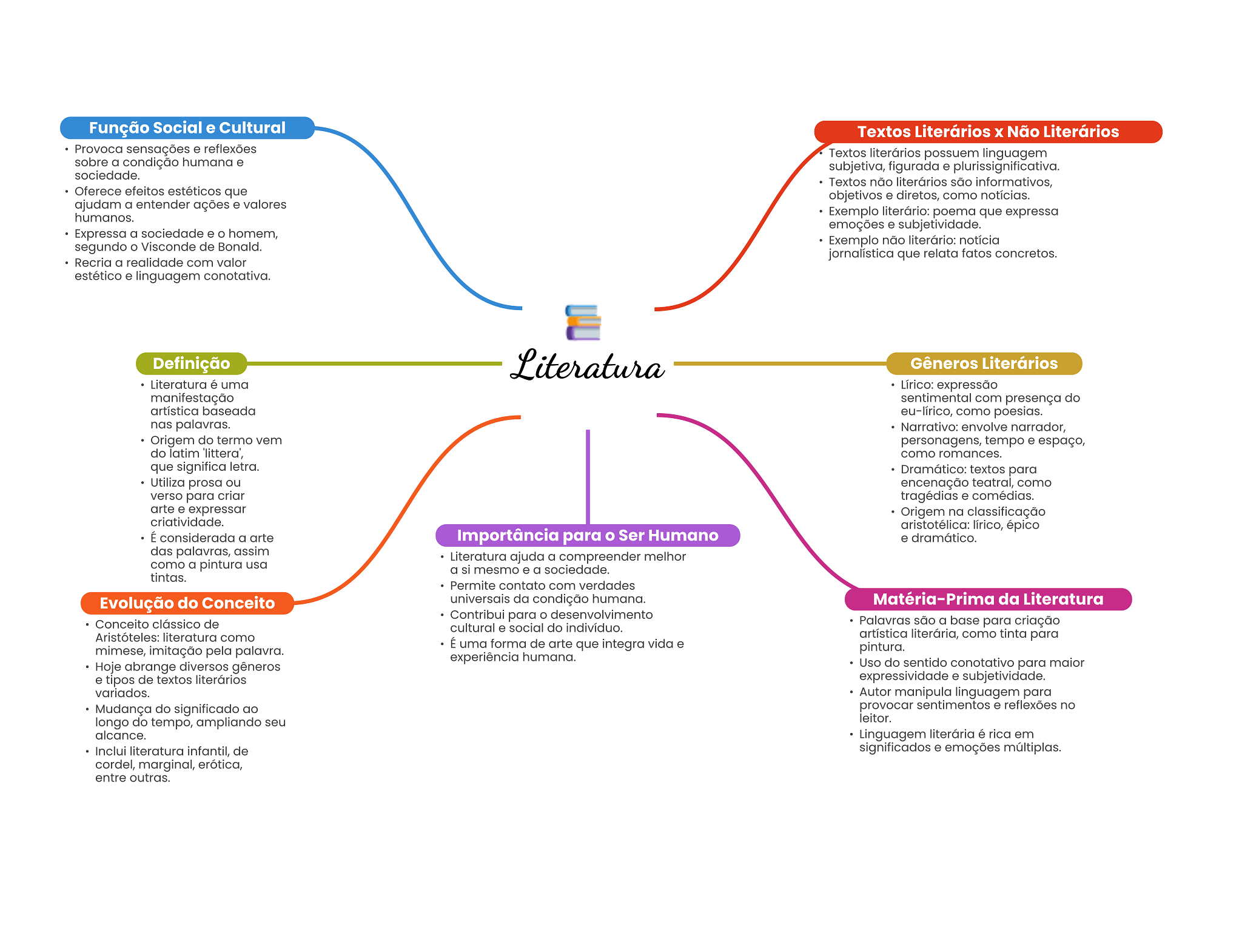 Função Social e Cultural Textos Literários Não Literários Provoca sensações e reflexões Textos literários possuem linguagem sobre a condição humana e subjetiva, figurada e plurissignificativa. sociedade. Textos não literários são informativos, Oferece efeitos estéticos que objetivos e diretos, como notícias. ajudam a entender ações e valores humanos. Exemplo literário: poema que expressa emoções e subjetividade. Expressa a sociedade e homem, segundo Visconde de Bonald. Exemplo não literário: notícia jornalística que relata fatos concretos. Recria a realidade com valor estético e linguagem conotativa. Definição Literatura Gêneros Literários Literatura é uma Lírico: expressão manifestação sentimental com presença do artística baseada eu-lírico, como poesias. nas palavras. Narrativo: envolve narrador, Origem do termo vem personagens, tempo e espaço, do latim 'littera', como romances. que significa letra. Dramático: textos para Utiliza prosa ou encenação teatral, como verso para criar tragédias e comédias. arte e expressar Origem na classificação criatividade. aristotélica: lírico, épico É considerada a arte Importância para Ser Humano e dramático. das palavras, assim Literatura ajuda a compreender melhor como a pintura usa a si mesmo e a sociedade. tintas. Permite contato com verdades Evolução do Conceito universais da condição humana. Matéria-Prima da Literatura Contribui para desenvolvimento Conceito clássico de cultural e social do indivíduo. Palavras são a base para criação Aristóteles: literatura como artística literária, como tinta para mimese, imitação pela palavra. É uma forma de arte que integra vida e pintura. experiência humana. Hoje abrange diversos gêneros Uso do sentido conotativo para maior e tipos de textos literários expressividade e subjetividade. variados. Autor manipula linguagem para Mudança do significado ao provocar sentimentos e reflexões no longo do tempo, ampliando seu leitor. alcance. Linguagem literária é rica em Inclui literatura infantil, de significados e emoções múltiplas. cordel, marginal, erótica, entre outras.