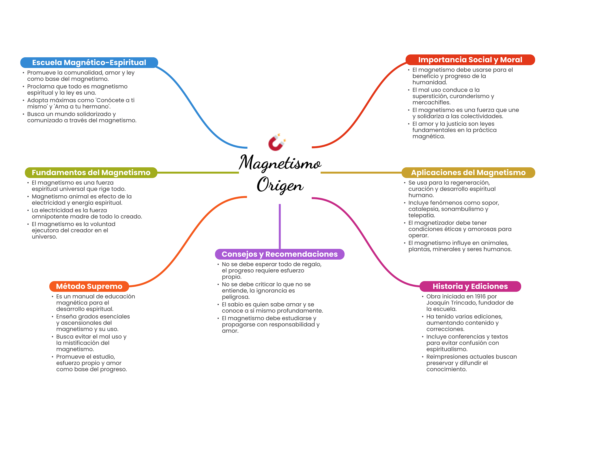 Escuela Magnético-Espiritual Importancia Social y Moral Promueve la comunalidad, amor y ley El magnetismo usarse para el como base del magnetismo. beneficio y progreso de la humanidad. Proclama que todo es magnetismo El mal uso conduce a la espiritual y la ley es una. superstición, curanderismo y Adopta máximas como Conócete a ti mercachifles. y Ama a tu hermano. El magnetismo es una fuerza que une Busca un mundo solidarizado y y solidariza a las colectividades. comunizado a través del magnetismo. El amor y la justicia son leyes fundamentales en la práctica magnética. Magnetismo Fundamentos del Magnetismo Aplicaciones del Magnetismo El magnetismo es una fuerza espiritual universal que rige todo. Origen Se usa para la regeneración, curación y desarrollo espiritual Magnetismo animal es efecto de la humano. electricidad y energía espiritual. Incluye fenómenos como sopor, La electricidad es la fuerza catalepsia, sonambulismo y omnipotente madre de todo lo creado. telepatía. El magnetismo es la voluntad magnetizador debe tener ejecutora del creador en el condiciones éticas y amorosas para universo. operar. El magnetismo influye en animales, plantas, minerales y seres humanos. Consejos y Recomendaciones No se debe esperar todo de regalo, el progreso requiere esfuerzo propio. Método Supremo No se debe criticar lo que no se entiende, la ignorancia es Historia y Ediciones Es un manual de educación peligrosa. Obra iniciada en 1916 por magnética para el sabio es quien sabe amar y se Trincado, fundador de desarrollo espiritual. conoce a mismo profundamente. la escuela. Enseña grados esenciales magnetismo debe estudiarse y Ha tenido varias ediciones, y ascensionales del propagarse con responsabilidad y aumentando contenido y magnetismo y su uso. amor. correcciones. Busca evitar el mal uso y Incluye conferencias y textos la mistificación del para evitar confusión con magnetismo. espiritualismo. Promueve el estudio, Reimpresiones actuales buscan esfuerzo propio y amor preservar y difundir el como base del progreso. conocimiento.