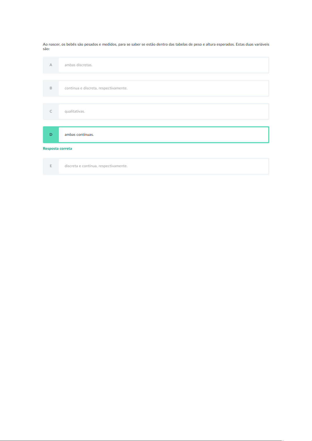 Ao nascer, os bebês são pesados e medidos, para se saber se estão dentro das tabelas de peso e altura esperados. Estas duas variáveis são: A ambas discretas. contínua e discreta, respectivamente. c qualitativas. D ambas contínuas. Resposta correta E discreta e contínua, respectivamente.