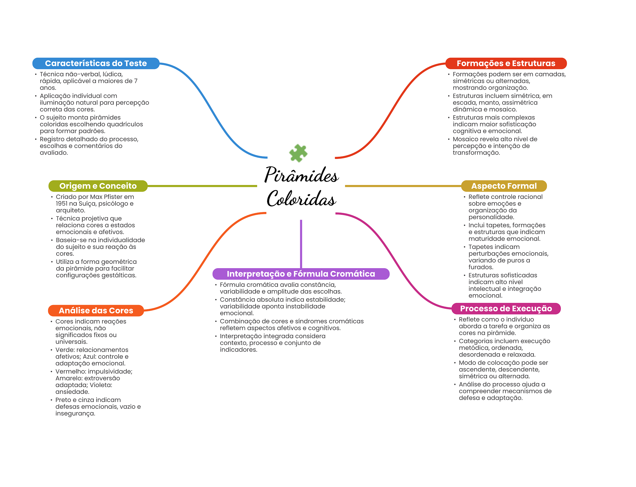 Características do Teste Formações e Estruturas Técnica não-verbal, lúdica, Formações podem ser em camadas, rápida, aplicável a maiores de 7 simétricas ou alternadas, anos. mostrando organização. Aplicação individual com Estruturas incluem simétrica, em iluminação natural para percepção escada, manto, assimétrica correta das cores. dinâmica e mosaico. sujeito monta pirâmides Estruturas mais complexas coloridas escolhendo quadrículos indicam maior sofisticação para formar padrões. cognitiva e emocional. Registro detalhado do processo, Mosaico revela alto nível de escolhas e comentários do percepção e intenção de avaliado. transformação. Pirâmides Origem e Conceito Aspecto Formal Criado por Max Pfister em 1951 na Suíça, psicólogo e Coloridas Reflete controle racional sobre emoções e arquiteto. organização da Técnica projetiva que personalidade. relaciona cores a estados Inclui tapetes, formações emocionais e afetivos. e estruturas que indicam Baseia-se na individualidade maturidade emocional. do sujeito e sua reação às Tapetes indicam cores. perturbações emocionais, Utiliza a forma geométrica variando de puros a da pirâmide para facilitar furados. configurações gestálticas. Interpretação e Fórmula Cromática Estruturas sofisticadas Fórmula cromática avalia constância, indicam alto nível variabilidade e amplitude das escolhas. intelectual e integração emocional. Constância absoluta indica estabilidade; Análise das Cores variabilidade aponta instabilidade emocional. Processo de Execução Cores indicam reações Combinação de cores e síndromes cromáticas Reflete como indivíduo emocionais, não refletem aspectos afetivos e cognitivos. aborda a tarefa e organiza as significados fixos ou Interpretação integrada considera cores na pirâmide. universais. contexto, processo e conjunto de Categorias incluem execução Verde: relacionamentos indicadores. metódica, ordenada, afetivos; Azul: controle e desordenada e relaxada. adaptação emocional. Modo de colocação pode ser Vermelho: impulsividade; ascendente, descendente, Amarelo: extroversão simétrica ou alternada. adaptada; Violeta: Análise do processo ajuda a ansiedade. compreender mecanismos de Preto e cinza indicam defesa e adaptação. defesas emocionais, vazio e insegurança.