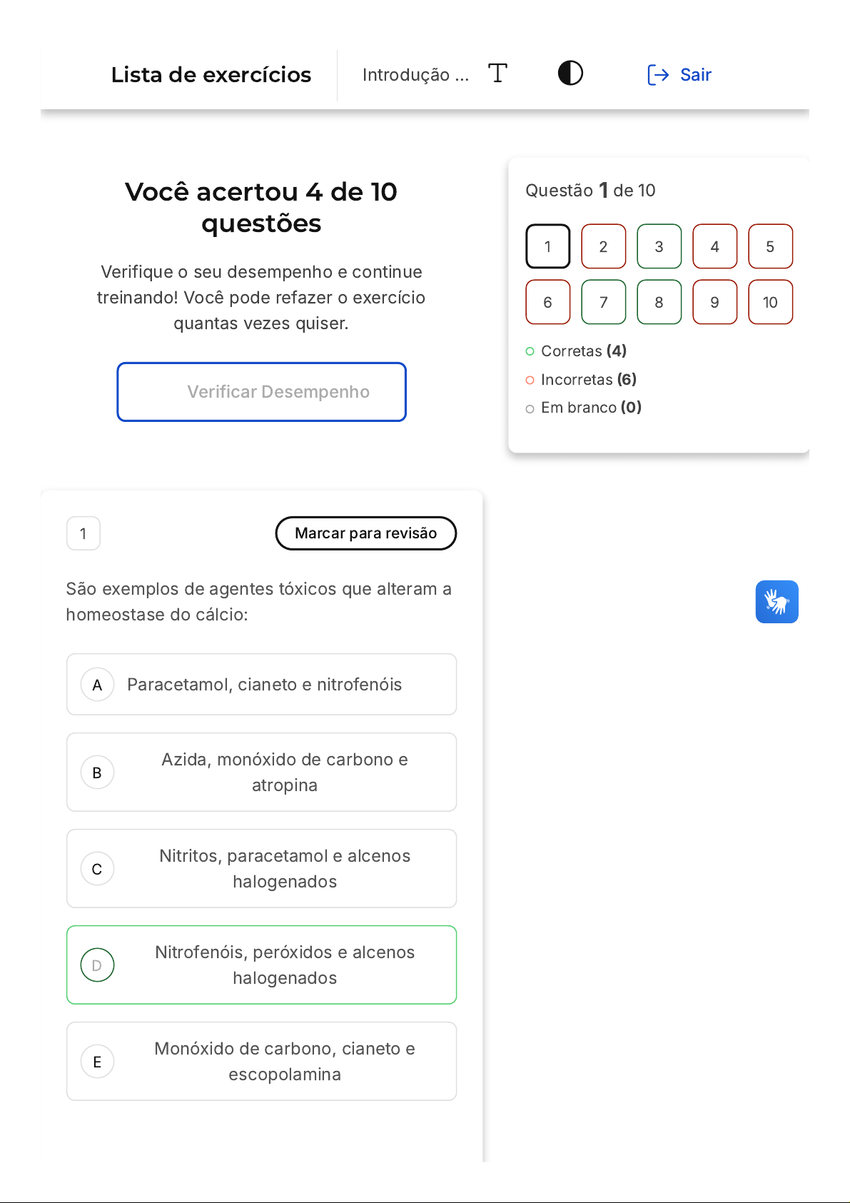 Você acertou 4 de 10 questões Verifique o seu desempenho e continue treinando! Você pode refazer o exercício quantas vezes quiser. Verificar Desempenho A B C D E 1 Marcar para revisão São exemplos de agentes tóxicos que alteram a homeostase do cálcio: Paracetamol, cianeto e nitrofenóis Azida, monóxido de carbono e atropina Nitritos, paracetamol e alcenos halogenados Nitrofenóis, peróxidos e alcenos halogenados Monóxido de carbono, cianeto e escopolamina Questão 1 de 10 Corretas (4) Incorretas (6) Em branco (0) 1 2 3 4 5 6 7 8 9 10 Lista de exercícios Introdução … Sair Resposta correta Parabéns, você selecionou a alternativa correta. Confira o gabarito comentado! Gabarito Comentado Os agentes tóxicos que alteram a homeostase do cálcio são os nitrofenóis, peróxidos e alcenos halogenados. A homeostase do cálcio é um processo biológico que mantém o equilíbrio dos níveis de cálcio no organismo. Os nitrofenóis, peróxidos e alcenos halogenados são substâncias que podem interferir nesse equilíbrio, causando uma série de problemas de saúde. 2 Marcar para revisão Considere as seguintes afirmações em relação aos conceitos de toxicologia: I. Toxicidade: é a capacidade que um agente químico tem de causar danos. II. Risco: é definido como a probabilidade esperada de ocorrência de um efeito indesejável decorrente da exposição a um agente tóxico. III. Intoxicação é a manifestação dos efeitos tóxicos. É o processo patológico efetivamente que é evidenciado pelos sinais e sintomas. Está correta a afirmação: A B C D E I e II. I e III. II e III. I, II e III. I apenas Resposta incorreta Opa! A alternativa correta é a letra D. Confira o gabarito comentado! Gabarito Comentado Todas as afirmações estão corretas. A toxicidade é de fato a capacidade que um agente químico tem de causar danos. O risco é definido como a probabilidade esperada de ocorrência de um efeito indesejável decorrente da exposição a um agente tóxico. E a intoxicação é a manifestação dos efeitos tóxicos, sendo o processo patológico efetivamente evidenciado pelos sinais e sintomas. Portanto, a alternativa correta é a D: I, II e III. 3 Marcar para revisão A toxicodinâmica é o estudo da natureza da ação tóxica exercida por substâncias químicas A B C D E sobre o sistema biológico. Analise os seguintes mecanismos de ação tóxica: I - A atropina e a escopolamina fixam-se e bloqueiam os receptores muscarínicos da acetilcolina, nos sistemas nervosos central e autônomo. II - A tetrodotoxina bloqueia os canais de sódio situados nas membranas axônicas, impedindo as trocas iônicas, causando paralisia muscular. III - As toxinas botulínicas produzidas pelo Clostridium botulinum complexam-se reversivelmente com o axônio terminal colinérgico e bloqueiam a liberação de adrenalina. A alternativa que contém as afirmativas corretas é: I, II I, II, III II, III III I, III Resposta correta Parabéns, você selecionou a alternativa correta. Confira o gabarito comentado! Gabarito Comentado As afirmativas I e II estão corretas. A atropina e a escopolamina realmente se fixam e bloqueiam os receptores muscarínicos da acetilcolina, nos sistemas nervosos central e autônomo, conforme descrito na afirmativa I. A tetrodotoxina, por sua vez, bloqueia os canais de sódio situados nas membranas axônicas, impedindo as trocas iônicas e causando paralisia muscular, como mencionado na afirmativa II. No entanto, a afirmativa III está incorreta. As toxinas botulínicas produzidas pelo Clostridium botulinum não bloqueiam a liberação de adrenalina, mas sim a liberação de acetilcolina, um neurotransmissor importante para a contração muscular. Portanto, a alternativa correta é a "A", que contém apenas as afirmativas I e II. 4 Marcar para revisão O Paracetamol é metabolizado no fígado principalmente por três vias. Uma delas origina um metabólito que tem variável grau de toxicidade para vários órgãos, atingindo principalmente o fígado, o que pode causar insuficiência hepática (IH), além de danos ao sistema de coagulação e nefrotoxicidade. O diagnóstico precoce, que é de grande importância para iniciar o tratamento, pode ser realizado após avaliação da história do paciente, bem como dos aspectos clínicos e laboratoriais. Em relação ao mecanismo de ação tóxica do paracetamol pode-se dizer que é do tipo: A B C D E Interferência na estabilidade das membranas. Complexação com biomoléculas. Interferência no influxo de cálcio intracelular. Interação com DNA. Interação com lipídios. Resposta incorreta Opa! A alternativa correta é a letra B. Confira o gabarito comentado! Gabarito Comentado O mecanismo de ação tóxica do Paracetamol é caracterizado pela complexação com biomoléculas. Isso ocorre porque um dos metabólitos do Paracetamol, produzido no fígado, tem a capacidade de se ligar a biomoléculas, o que pode levar a danos em vários órgãos, principalmente no fígado. Essa ligação, ou complexação, pode causar insuficiência hepática, danos ao sistema de coagulação e nefrotoxicidade. Portanto, a alternativa correta é a B: "Complexação com biomoléculas". 5 Marcar para revisão A B C D E Leia as alternativas abaixo e marque a opção correta: Um dos parâmetros utilizados para expressar o grau de toxicidade crônica das substâncias químicas é a DL50. A natureza dos efeitos tóxicos produzidos por um certo agente químico independe da frequência e duração da exposição. Com base nos valores de DL50, as substâncias que necessitam de altas doses para produzir o efeito tóxico são classificadas como pouco tóxicas. A DL50 é um parâmetro cujo efeito medido é a alergia. Os efeitos tóxicos de uma substância são determinados pela prevalência de pessoas que sofrem intoxicação. Resposta incorreta Opa! A alternativa correta é a letra C. Confira o gabarito comentado! Gabarito Comentado A alternativa correta é a 