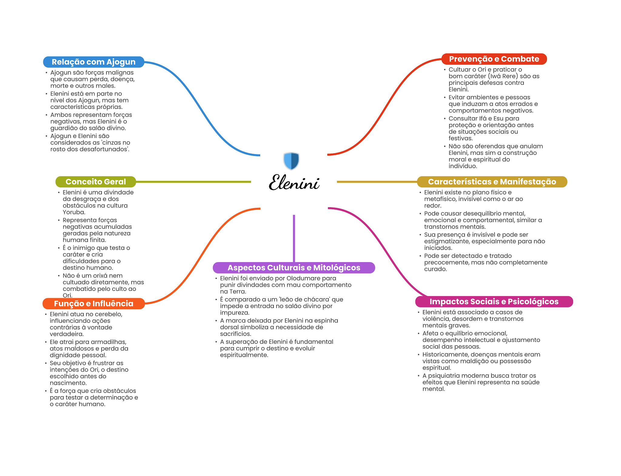 Relação com Ajogun Prevenção e Combate Ajogun são forças malignas Cultuar Ori e praticar que causam perda, doença, bom caráter (Iwá Rere) são as morte e outros males. principais defesas contra Elenini. Elenini está em parte no nível dos Ajogun, mas tem Evitar ambientes e pessoas características próprias. que induzam a atos errados e comportamentos negativos. Ambos representam forças negativas, mas Elenini é Consultar Ifá e Esu para guardião do salão divino. proteção e orientação antes de situações sociais ou Ajogun e Elenini são festivas. considerados as 'cinzas no rosto dos desafortunados'. Não são oferendas que anulam Elenini, mas sim a construção moral e espiritual do indivíduo. Conceito Geral Elenini Características e Manifestação Elenini é uma divindade Elenini existe no plano físico e da desgraça e dos metafísico, invisível como ar ao obstáculos na cultura redor. Yoruba. Pode causar desequilibrio mental, Representa forças emocional e comportamental, similar a negativas acumuladas transtornos mentais. geradas pela natureza Sua presença é invisível e pode ser humana finita. estigmatizante, especialmente para não É inimigo que testa iniciados. caráter e cria Pode ser detectado e tratado dificuldades para precocemente, mas não completamente destino humano. Aspectos Culturais e Mitológicos curado. Não é um orixá nem Elenini foi enviado por Olodumare para cultuado diretamente, mas punir divindades com mau comportamento combatido pelo culto ao na Terra. Ori. É comparado a um 'leão de chácara' que Função e Influência Impactos Sociais e Psicológicos impede a entrada no salão divino por Elenini atua no cerebelo, impureza. Elenini está associado a casos de influenciando ações A marca deixada por Elenini na espinha violência, desordem e transtornos contrárias à vontade dorsal simboliza a necessidade de mentais graves. verdadeira. sacrifícios. Afeta equilíbrio emocional, Ele atrai para armadilhas, A superação de Elenini é fundamental desempenho intelectual e ajustamento atos maldosos e perda da para cumprir destino e evoluir social das pessoas. dignidade pessoal. espiritualmente. Historicamente, doenças mentais eram Seu objetivo é frustrar as vistas como maldição ou possessão intenções do Ori, destino espiritual. escolhido antes do A psiquiatria moderna busca tratar os nascimento. efeitos que Elenini representa na saúde É a força que cria obstáculos mental. para testar a determinação e caráter humano.