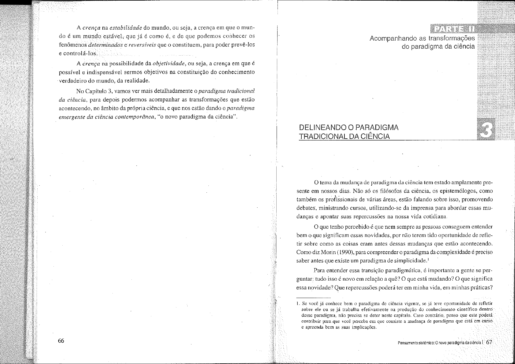 A crença na estabilidade do mundo, ou seja, a crença em que mun- PARTE do é um mundo estável, que já é como é, e de que podemos conhecer Acompanhando as transformações fenômenos determinados e reversíveis que constituem, para poder prevê-los do paradigma da ciência e controlá-los. A crença na possibilidade da objetividade, ou seja, a crença em que é possível e indispensável sermos objetivos na constituição do conhecimento verdadeiro do mundo, da realidade. No Capítulo 3, vamos ver mais detalhadamente paradigma tradicional da ciência, para depois podermos acompanhar as transformações que estão acontecendo, no âmbito da própria ciência, e que nos estão dando paradigma emergente da ciência contemporânea, "o novo paradigma da DELINEANDO O PARADIGMA TRADICIONAL DA CIÊNCIA 3 O tema da mudança de paradigma da ciência tem estado amplamente pre- sente em nossos dias. Não só filósofos da ciência, os epistemólogos, como também profissionais de várias áreas, estão falando sobre isso, promovendo debates, ministrando cursos, utilizando-se da imprensa para abordar essas mu- danças e apontar suas repercussões na nossa vida cotidiana. O que tenho percebido é que nem sempre as pessoas conseguem entender bem que significam essas novidades, por não terem tido oportunidade de refle- tir sobre como as coisas eram antes dessas mudanças que estão acontecendo. Como diz Morin (1990), para compreender paradigma da complexidade é preciso saber antes que existe um paradigma de Para entender essa transição paradigmática, é importante a gente se per- guntar: tudo isso é novo em relação a quê? O que está mudando? O que significa essa novidade? Que repercussões poderá ter em minha vida, em minhas práticas? 1. Se você já conhece bem paradigma de ciência vigente, se já teve oportunidade de refletir sobre ele ou se já trabalha efetivamente na produção do conhecimento científico dentro desse paradigma, não precisa se deter neste capítulo. Caso contrário, penso que este poderá contribuir para que você perceba em que consiste a mudança de paradigma que está em curso e apreenda bem as suas implicações. 66 Pensamento sistêmico: 0 novo paradigma da ciência 67Ou seja, é importante procurar entender bem, não só como se constituiu Quadro 9 Paradigma tradicional da ciência² paradigma tradicional através dos tempos que já vimos no Capítulo 2 SIMPLICIDADE mas também as manifestações desse paradigma na ciência e nas práticas dela análise derivadas. relações causais lineares Quando se aborda a questão do paradigma da ciência, aparece uma ESTABILIDADE multiplicidade de termos, alguns já familiares para nós, outros muito novos. determinação previsibilidade Torna-se importante não só procurar saber em que sentido estão sendo usa- reversibilidade controlabilidade dos esses termos, ou a que geralmente se referem, mas ainda dispormos de um OBJETIVIDADE quadro de referência amplo, em que todos eles possam se encaixar. Um quadro subjetividade entre parênteses de referência permitirá organizar as idéias a respeito. uni-verso O quadro de referência que elaborei para abordar a mudança de paradigma da ciência descreve, de forma resumida, essa transição de uma ciência tradicional 1. O pressuposto da simplicidade: a crença em que, separando-se mundo para uma ciência novo-paradigmática emergente. complexo em partes, encontram-se elementos simples, em que é preciso separar Para evitar mal-entendidos, é preciso esclarecer que aqui "tradicional" as partes para entender todo, ou seja, 0 pressuposto de que "o microscópico se refere a algo que tem uma origem muito remota, mas não a algo que já tenha é simples". Daí decorrem, entre outras coisas, a atitude de análise e a busca de relações causais lineares. desaparecido e/ou sido substituído. A ciência tradicional continua vigorosa em 2. pressuposto da estabilidade do mundo: a crença em que 0 mundo é estável, nossos dias. ou seja, em que mundo já é". Ligados a esse pressuposto estão a crença A expressão "novo-paradigmática emergente" é usada aqui para se referir na determinação a conseqüente previsibilidade dos fenômenos e a a algo que tem uma origem relativamente recente, no século XX, especialmente a crença na reversibilidade com a conseqüente controlabilidade dos partir de sua segunda metade, portanto algo muito novo em relação à ciência tra- fenômenos. dicional, que tem mais de 400 anos de história. 3. pressuposto da objetividade: a crença em que "é possível conhecer Como a ciência tradicional tem sido chamada de "ciência moderna" (sécu- objetivamente 0 mundo tal como ele é na realidade" e a exigência da los XVII a XIX), essa nova ciência tem sido chamada também de "ciência pós- objetividade como critério de Daí decorrem os esforços para moderna" (século XX). Prefiro chamá-la de "ciência novo-paradigmática emergen- colocar entre parênteses a subjetividade do cientista, para atingir uni- te" ou simplesmente de "ciência verso, ou versão única do conhecimento. Muitos autores reconheceram a existência de diversos pressupostos epistemológicos, presentes na ciência clássica, cartesiana, newtoniana, moderna. Acompanhando OS desenvolvimentos contemporâneos da ciência, pude E hoje, eles mesmos, ou outros, estão descrevendo uma mudança epistemológica, identificar como eles conduzem necessariamente a mudanças nessas três dimen- uma revisão do paradigma até então dominante, dando origem a uma ciência pós- sões epistemológicas, constituindo-se assim o novo paradigma da ciência, com moderna, novo-paradigmática. três novos pressupostos que serão abordados no Capítulo 4. Nesse amplo conjunto de descrições do paradigma tradicional, distingui 2. Essa é apenas a primeira metade do quadro de referência para a transição paradigmática da três dimensões, que adotei como descrição resumida desse paradigma: ciência e se