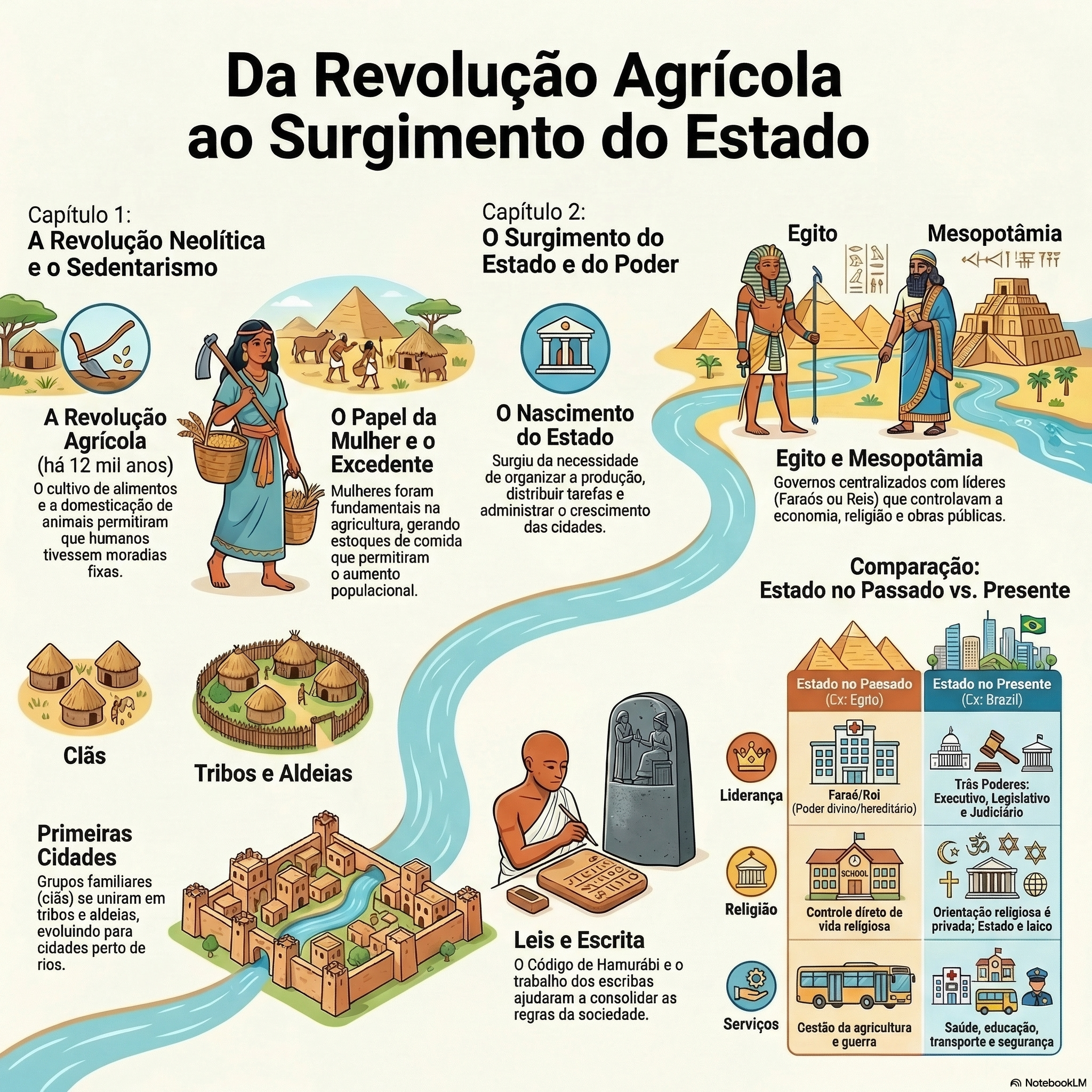 Da Revolução Agrícola ao Surgimento do Estado Capítulo 1: Capítulo 2: A Revolução Neolítica Surgimento do Egito Mesopotâmia e Sedentarismo Estado e do Poder Revolução Papel da Nascimento Agrícola Mulher e do Estado (há 12 mil anos) Excedente Surgiu da necessidade Egito e Mesopotâmia de organizar a produção, cultivo de alimentos Governos centralizados com líderes Mulheres foram distribuir tarefas e e a domesticação de fundamentais na (Faraós ou Reis) que controlavam a administrar crescimento animais permitiram agricultura, gerando economia, religião e obras públicas. das cidades. que humanos estoques de comida tivessem moradias que permitiram fixas. o aumento Comparação: populacional. Estado no Passado vs. Presente Estado no Paesado Estado no Presente (Cx: Egrto) (Cx: Brazil) Clãs Tribos e Aldeias Trâs Poderes: Liderança Faraé/Roi Executivo, Legislativo (Poder divino/hereditário) e Judiciário Primeiras Cidades SCHOOL Grupos familiares (ciãs) se uniram em tribos e aldeias, Religião Controle díreto de Orientação religiosa é evoluindo para vida relígiosa privada; Estado e laico cidades perto de Leis e Escrita rios. 0 Código de Hamurábi e trabalho dos escribas ajudaram a as regras da sociedade. Serviços Cestão da agricultura Saúde, educação, e guerra transporte e segurança NotebookLM