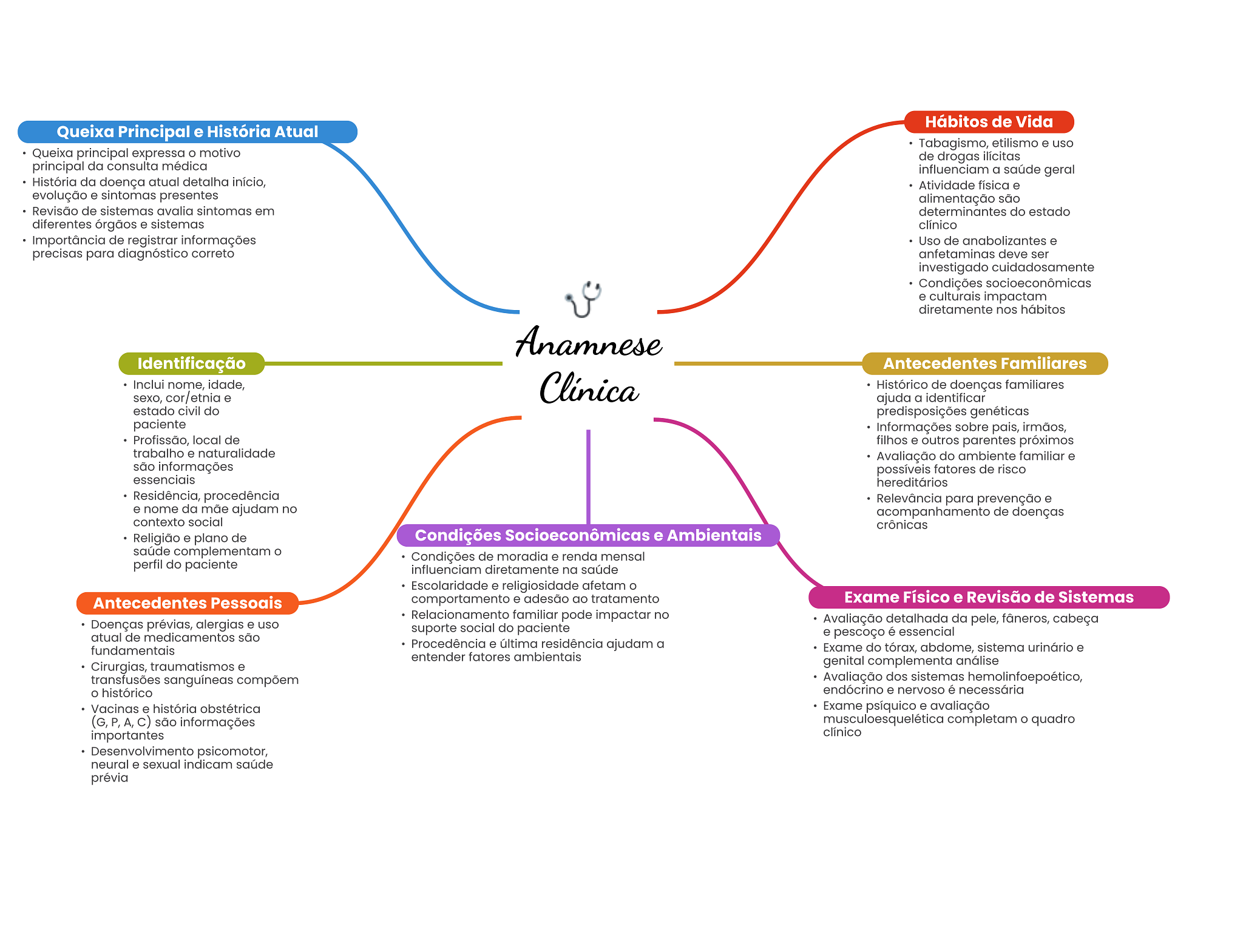 Hábitos de Vida Queixa Principal e História Atual Tabagismo, etilismo e uso Queixa principal expressa motivo de drogas ilícitas principal da consulta médica influenciam a saúde geral História da doença atual detalha início, Atividade física e evolução e sintomas presentes alimentação são Revisão de sistemas avalia sintomas em determinantes do estado diferentes órgãos e sistemas clínico Importância de registrar informações Uso de anabolizantes e precisas para diagnóstico correto anfetaminas deve ser investigado cuidadosamente Condições socioeconômicas e culturais impactam diretamente nos hábitos Anamnese Identificação Antecedentes Familiares Inclui nome, idade, Clínica Histórico de doenças familiares sexo, cor/etnia e ajuda a identificar estado civil do predisposições genéticas paciente Informações sobre pais, irmãos, Profissão, local de filhos e outros parentes próximos trabalho e naturalidade Avaliação do ambiente familiar e são informações possíveis fatores de risco essenciais hereditários Residência, procedência Relevância para prevenção e e nome da mãe ajudam no acompanhamento de doenças contexto social crônicas Religião e plano de Condições Socioeconômicas e Ambientais saúde complementam O Condições de moradia e renda mensal perfil do paciente influenciam diretamente na saúde Escolaridade e religiosidade afetam Antecedentes Pessoais comportamento e adesão ao tratamento Exame Físico e Revisão de Sistemas Relacionamento familiar pode impactar no Doenças prévias, alergias e uso Avaliação detalhada da pele, fâneros, cabeça suporte social do paciente atual de medicamentos são e pescoço é essencial fundamentais Procedência e última residência ajudam a Exame do tórax, abdome, sistema urinário e entender fatores ambientais Cirurgias, traumatismos e genital complementa análise transfusões sanguíneas compõem Avaliação dos sistemas hemolinfoepoético, histórico endócrino e nervoso é necessária Vacinas e história obstétrica Exame psíquico e avaliação (G, P, c) são informações musculoesquelética completam quadro importantes clínico Desenvolvimento psicomotor, neural e sexual indicam saúde prévia