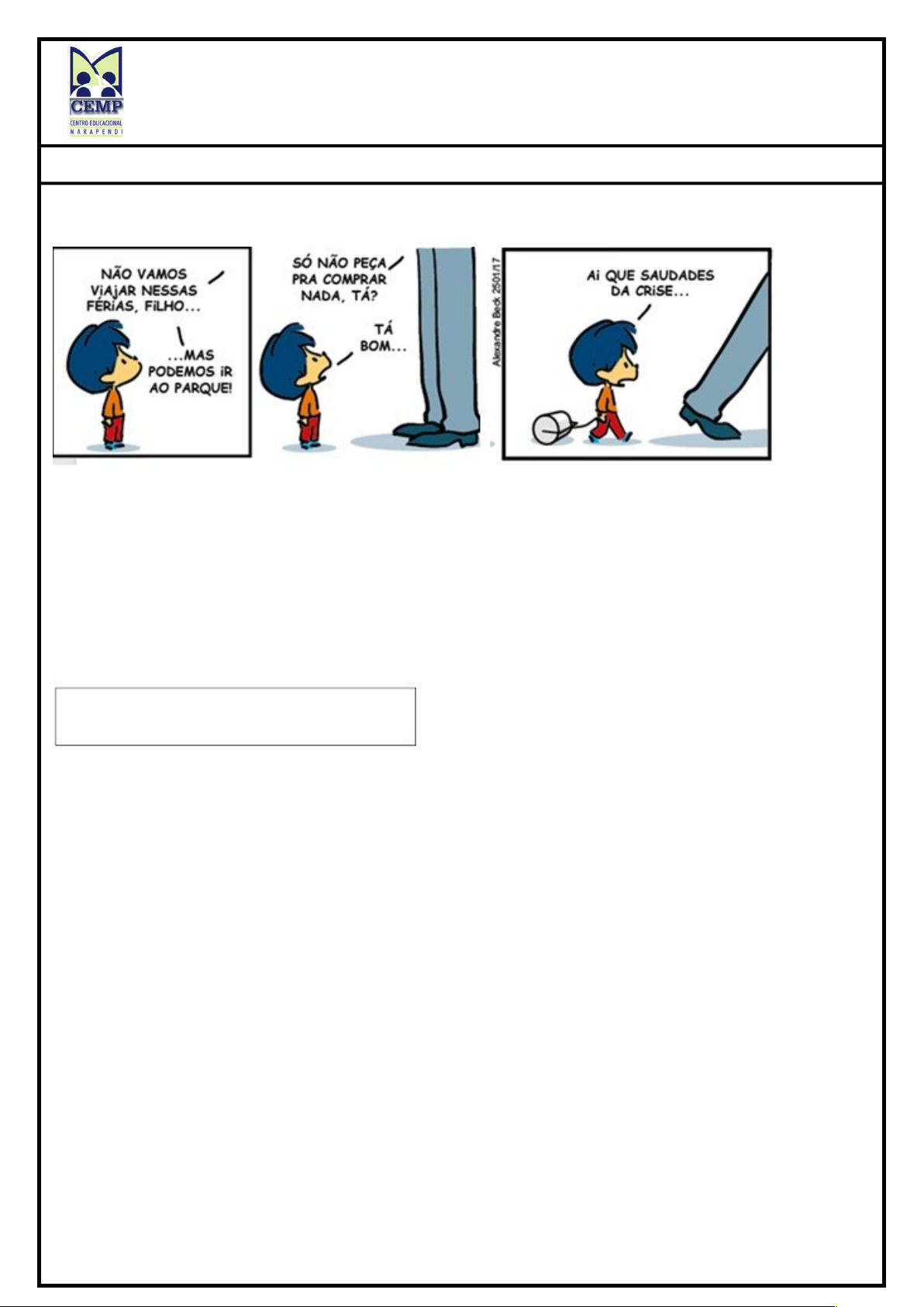 CEMP – Ensino Médio Nome: _____________________________________________________________Data: 16 / 04 / 2024 Professora: Roberta 6°Ano do Ensino Fundamental Turma: 6A / 6B / 6C Leia a tirinha para resolver às questões 1 - 6: 1. Os encontros vocálicos são encontros de vogais em uma palavra, seja em sílabas separadas ou não. Assinale a alternativa que só apresenta palavras retiradas da tirinha que contêm encontros vocálicos. a) saudades, crises, nessas e filho. b) vamos, mas, podemos e parque. c) não, férias, saudades e viajar. d) podemos, viajar, crise e nada. 2. Separe as sílabas da palavra SAUDADES no espaço abaixo e resolva às questões. a) Quantas sílabas tem a palavra? _____________________________________________________________________________________ b) O encontro vocálico da palavra ficou em sílabas separadas ou na mesma sílaba? _____________________________________________________________________________________ c) A palavra possui: ( ) Ditongo. ( ) Tritongo. ( ) Hiato. 3. Hiato é o encontro vocálico em que duas vogais aparecem juntas numa palavra, mas ficam em sílabas diferentes. Assinale a alternativa que apresenta uma palavra da tirinha com HIATO. a) Férias. b) Viajar. c) Não. d) Parque. 4. Localize na tirinha 2 (duas) palavras que possuem vogais juntas, mas NÃO são encontros vocálicos, porque contêm dígrafos, já que uma das vogais de cada palavra não possui som. _____________________________________________________________________________________ 5. Assinale a alternativa cujas palavras monossílabas retiradas da tirinha são ditongos. a) ir e só. b) ao e da. c) ai e tá. d) ao e ai. 6. No último quadrinho, o personagem demonstra estar: a) contente. b) zangado. c) deprimido. d) animado. 7. Separe as sílabas das palavras abaixo: a) Rainha ________________________ b) Água __________________________ c) Saguão ________________________ d) Troféu _________________________ e) Pastéis ________________________ f) Viúva __________________________ g) Coroa _________________________ h) Enxaguou ______________________ i) Coração ________________________ j) Ruído __________________________ k) Ouro __________________________ l) Paraguai _______________________ 8. Agora, de acordo com as palavras cujas sílabas foram separadas acima, classifique-as colocando (H) para Hiato, (D) para Ditongo e (T) para Tritongo. ( ) Rainha ( ) Água ( ) Saguão ( ) Troféu ( ) Pastéis ( ) Viúva ( ) Coroa ( ) Enxaguou ( ) Coração ( ) Ruído ( ) Ouro ( ) Paraguai Leia e resolva às questões: 9. Conforme o texto, por que o Garfield resolveu sair de casa? _____________________________________________________________________________________ 10. A palavra abaixo retirada da tirinha classificada como HIATO é: a) meu. b) que. c) dia. d) céu. 11. Separe as sílabas da palavra “METEOROLOGIA” e resolva à questão: _____________________________________________________________________________________ Sobre a palavra separada, assinale a alternativa CORRETA: a) A palavra possui dois ditongos. b) A palavra possui um ditongo e um hiato. c) A palavra possui um tritongo e um ditongo. d) A palavra possui dois hiatos. 12. Qual palavra abaixo possui DITONGO? a) Céu. b) Periferia. c) Linda. d) Chuva. 13. Observe a palavra abaixo retirada da tirinha com as sílabas separadas: SI – NAL Observe que o “L” tem som de “U”, logo, há um ditongo na palavra. A palavra abaixo que segue a mesma situação é: a) Lambida. b) Coronel. c) Levado. d) Planta. 14. Qual palavra abaixo NÃO é um tritongo? Separe as sílabas para descobrir. a) Uruguai. c) Quais. c) Averiguei. d) Papagaio. 15. Identifique a palavra abaixo que NÃO há encontro vocálico. a) Piada. b) Unicórnio. c) Advogado. d) Saída. ( ) Conjunto de letras que representa uma coisa, ideia ou ação. ( ) Símbolo, um sinal correspondente a um respectivo som, ao qual damos o nome de fonema. ( ) Estudo dos sons de cada uma das letras que formam as palavras. ( ) Estabelecer uma diferença de significado entre uma palavra e outra. ( ) Som representado graficamente por uma letra. 16) Em todas as opções as palavras têm encontro consonantal, exceto em: ( ) testa- treze- sublinhe- aplicação ( ) gratuito- destruição transporte- trem ( ) tranquilo – unha – carro- quilo ( ) milagroso – flauta- surpresa- formosa ( ) clareia –decepção- princesa- grama 17) Leia: Escreva em cada coluna apenas uma palavra dos quadrinhos que possua o que se pede 18) Divida as palavras em sílabas e classifique os encontros vocálicos em ditongo, hiato e tritongo. a) joia - ______________________________________ b) correio ____________________________________ c) sério ______________________________________ d) saguão ____________________________________ e) cheguei ___________________________________ f) rua ________________________________________ g) enxaguei __________________________________ h) álcool _____________________________________ i) mau _______________________________________ j) aquarela ___________________________________ 19) Determine a vogal e a semivogal de cada encontro vocálico e classifique-o em ditongo crescente ou ditongo decrescente. a) sinais _____________________________________________________________________________________ b) várzea _______________________________________________________________________________________ c) trouxe _____________________________________________________________________________________ d) iguais ______________________________________________________________________________________ e) boi ______________________________________________________________________________________ f) Paraguai ______________________________________________________________________________________ g) Euclides _______________________________________________________________________________________ h) goela _______________________________________________________________________________________ i) gratuito ___