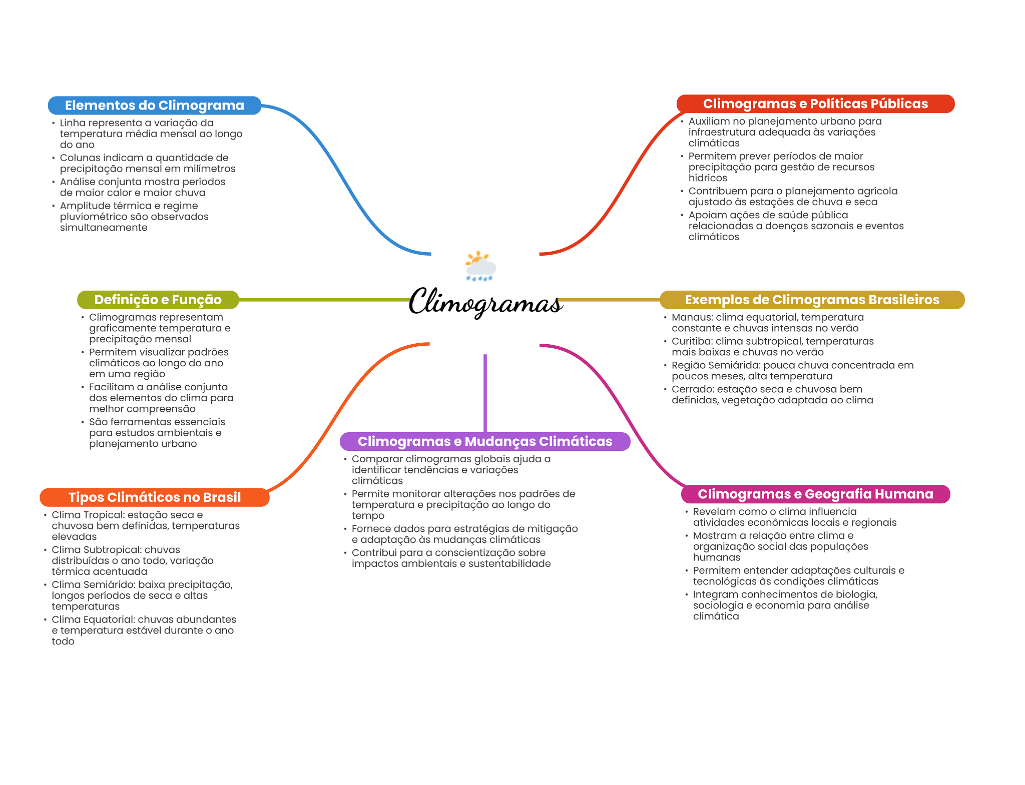 Elementos do Climograma Climogramas e Políticas Públicas Linha representa a variação da Auxiliam no planejamento urbano para temperatura média mensal ao longo infraestrutura adequada às variações do ano climáticas Colunas indicam a quantidade de Permitem prever períodos de maior precipitação mensal em milímetros para gestão de recursos Análise conjunta mostra períodos hídricos de maior calor e maior chuva Contribuem para planejamento agrícola Amplitude térmica e regime ajustado às estações de chuva e seca pluviométrico são observados Apoiam ações de saúde pública simultaneamente relacionadas a doenças sazonais e eventos climáticos Definição e Função Climogramas Exemplos de Climogramas Brasileiros Climogramas representam Manaus: clima equatorial, temperatura graficamente temperatura e constante e chuvas intensas no verão precipitação mensal Curitiba: clima subtropical, temperaturas Permitem visualizar padrões mais baixas e chuvas no verão climáticos ao longo do ano Região Semiárida: pouca chuva concentrada em em uma região poucos meses, alta temperatura Facilitam a análise conjunta Cerrado: estação seca e chuvosa bem dos elementos do clima para definidas, vegetação adaptada ao clima melhor compreensão São ferramentas essenciais para estudos ambientais e planejamento urbano Climogramas e Mudanças Climáticas Comparar climogramas globais ajuda a identificar tendências e variações climáticas Tipos Climáticos no Brasil Permite monitorar alterações nos padrões de Climogramas e Geografia Humana temperatura e precipitação ao longo do Clima Tropical: estação seca e tempo Revelam como clima influencia chuvosa bem definidas, temperaturas atividades econômicas locais e regionais Fornece dados para estratégias de mitigação elevadas e adaptação às mudanças climáticas Mostram a relação entre clima e Clima Subtropical: chuvas organização social das populações Contribui para a conscientização sobre distribuídas ano todo, variação humanas impactos ambientais e sustentabilidade térmica acentuada Permitem entender adaptações culturais e Clima Semiárido: baixa precipitação, tecnológicas às condições climáticas longos períodos de seca e altas Integram conhecimentos de biologia, temperaturas sociologia e economia para análise Clima Equatorial: chuvas abundantes climática e temperatura estável durante ano todo