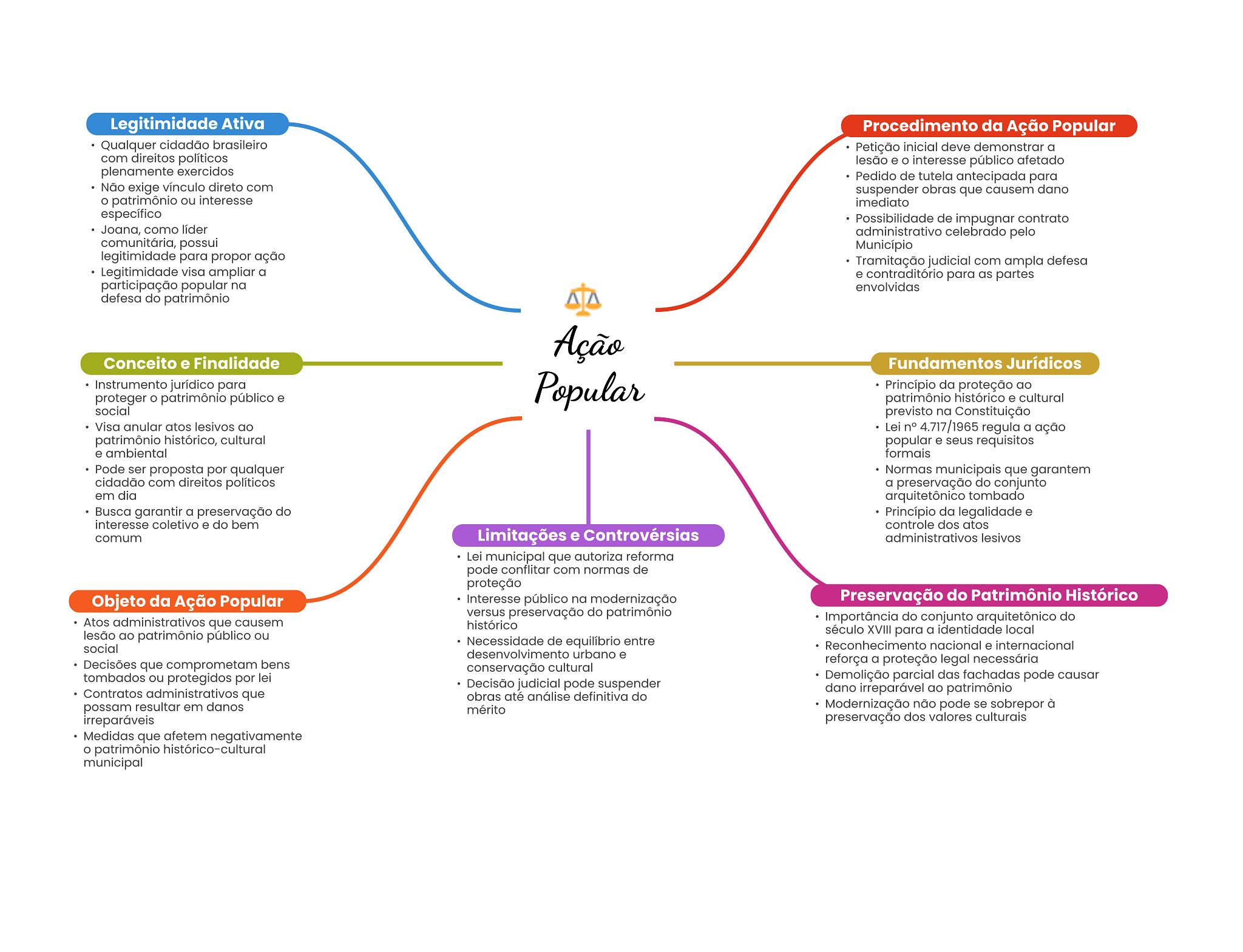 Legitimidade Ativa Procedimento da Ação Popular Qualquer cidadão brasileiro Petição inicial deve demonstrar a com direitos políticos lesão e interesse público afetado plenamente exercidos Pedido de tutela antecipada para Não exige vínculo direto com suspender obras que causem dano patrimônio ou interesse imediato específico Possibilidade de impugnar contrato Joana, como líder administrativo celebrado pelo comunitária, possui Município legitimidade para propor ação Tramitação judicial com ampla defesa Legitimidade visa ampliar a e contraditório para as partes participação popular na envolvidas defesa do patrimônio Ação Conceito e Finalidade Fundamentos Jurídicos Instrumento jurídico para Popular Princípio da proteção ao proteger O patrimônio público e patrimônio histórico e cultural social previsto na Constituição Visa anular atos lesivos ao Lei n° 4.717/1965 regula a ação patrimônio histórico, cultural popular e seus requisitos e ambiental formais Pode ser proposta por qualquer Normas municipais que garantem cidadão com direitos políticos a preservação do conjunto em dia arquitetônico tombado Busca garantir a preservação do Princípio da legalidade e interesse coletivo e do bem controle dos atos comum Limitações e Controvérsias administrativos lesivos Lei municipal que autoriza reforma pode conflitar com normas de proteção Objeto da Ação Popular Interesse público na modernização Preservação do Patrimônio Histórico versus preservação do patrimônio Atos administrativos que causem Importância do conjunto arquitetônico do histórico lesão ao patrimônio público ou século XVIII para a identidade local Necessidade de equilíbrio entre social Reconhecimento nacional e internacional desenvolvimento urbano e Decisões que comprometam bens reforça a proteção legal necessária conservação cultural tombados ou protegidos por lei Demolição parcial das fachadas pode causar Decisão judicial pode suspender Contratos administrativos que dano irreparável ao patrimônio obras até análise definitiva do possam resultar em danos mérito Modernização não pode se sobrepor à irreparáveis preservação dos valores culturais Medidas que afetem negativamente patrimônio histórico-cultural municipal