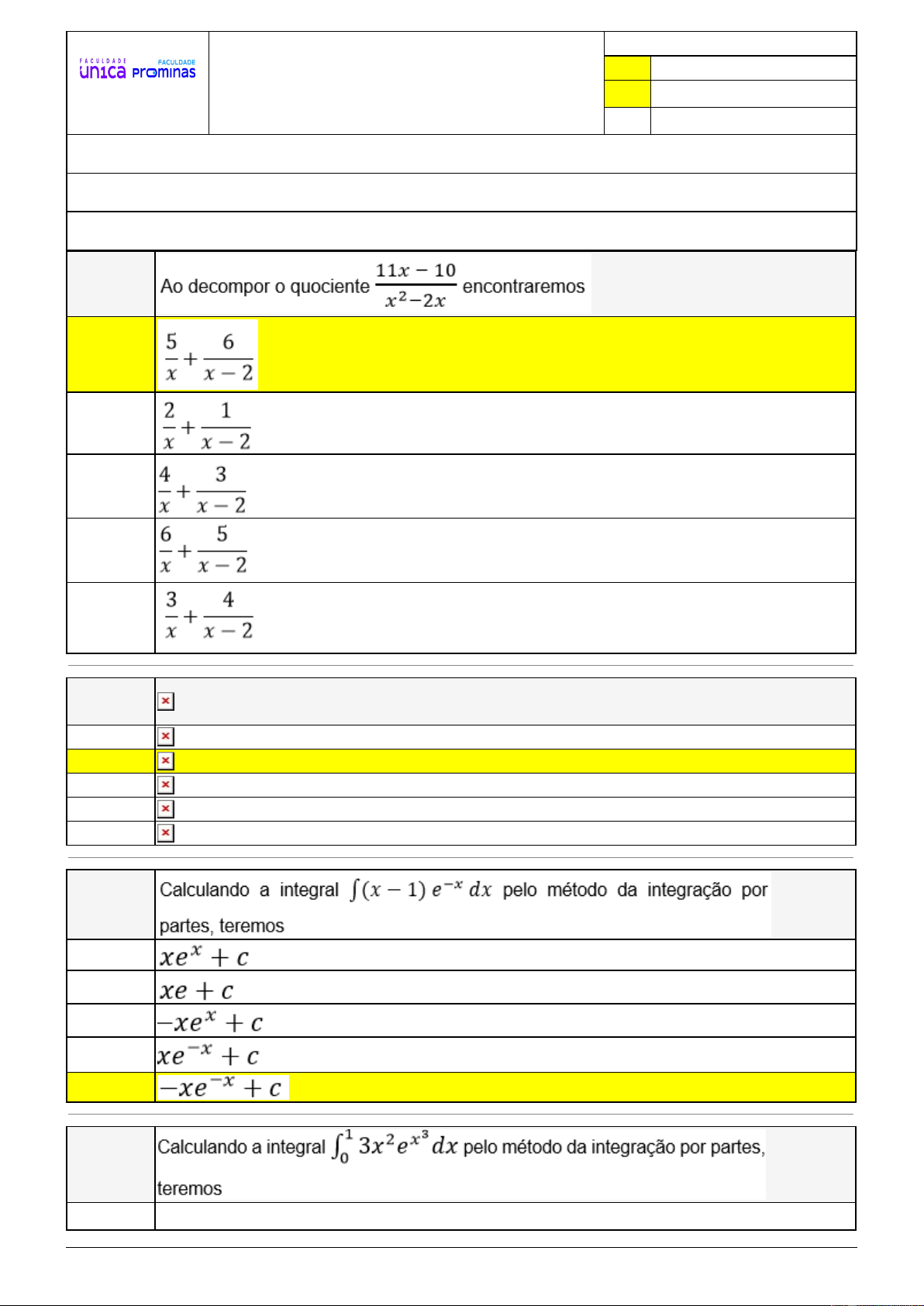 Pincel Atômico - 13/12/2023 08:44:34 1/2 LEONARDO OLIVEIRA SOUZA Avaliação Online (SALA EAD) Atividade finalizada em 12/12/2023 00:30:33 (1339404 / 1) LEGENDA Resposta correta na questão # Resposta correta - Questão Anulada X Resposta selecionada pelo Aluno Disciplina: CÁLCULO II [480223] - Avaliação com 5 questões, com o peso total de 15,00 pontos [capítulos - 4,5,6] Turma: Graduação: Engenharia Civil - Grupo: AGOSTO/2022 - ENGCIV/AGOS22 [69446] Aluno(a): 91417496 - LEONARDO OLIVEIRA SOUZA - Respondeu 5 questões corretas, obtendo um total de 15,00 pontos como nota [357368_84486] Questão 001 X [357368_84503] Questão 002 X [357368_84463] Questão 003 X [357369_84525] Questão 004 e Pincel Atômico - 13/12/2023 08:44:34 2/2 X e - 1 - e + 1 - e - 1 e +1 [357370_84533] Questão 005 X 1 - 2 -1 2 0
