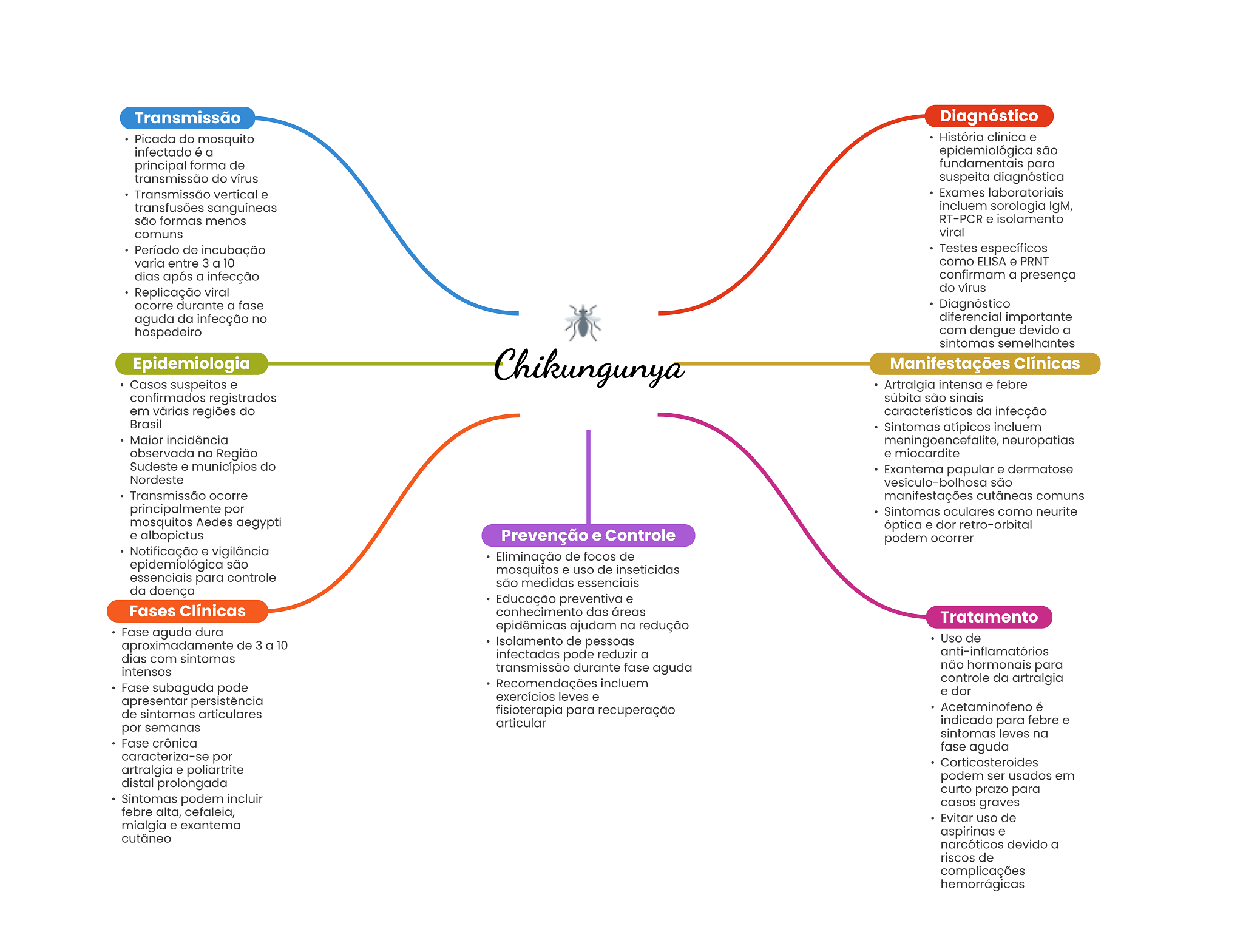 Transmissão Diagnóstico Picada do mosquito História clínica e infectado é a epidemiológica são principal forma de fundamentais para transmissão do vírus suspeita diagnóstica Transmissão vertical e Exames laboratoriais transfusões sanguíneas incluem sorologia IgM, são formas menos RT-PCR e isolamento comuns viral Período de incubação Testes específicos varia entre 3 a 10 como ELISA e PRNT dias após a infecção confirmam a presença Replicação viral do vírus ocorre durante a fase Diagnóstico aguda da infecção no diferencial importante hospedeiro com dengue devido a sintomas semelhantes Epidemiologia Chikungunya Manifestações Clínicas Casos suspeitos e Artralgia intensa e febre confirmados registrados súbita são sinais em várias regiões do característicos da infecção Brasil Sintomas atípicos incluem Maior incidência meningoencefalite, neuropatias observada na Região e miocardite Sudeste e municípios do Exantema papular e dermatose Nordeste vesículo-bolhosa são Transmissão ocorre manifestações cutâneas comuns principalmente por Sintomas oculares como neurite mosquitos Aedes aegypti óptica e dor retro-orbital e albopictus Prevenção e Controle podem ocorrer Notificação e vigilância Eliminação de focos de epidemiológica são mosquitos e uso de inseticidas essenciais para controle são medidas essenciais da doença Educação preventiva e Fases Clínicas conhecimento das áreas Tratamento Fase aguda dura epidêmicas ajudam na redução aproximadamente de 3 a 10 Isolamento de pessoas Uso de dias com sintomas infectadas pode reduzir a anti-inflamatórios intensos transmissão durante fase aguda não hormonais para Recomendações incluem controle da artralgia Fase subaguda pode exercícios leves e e dor apresentar persistência de sintomas articulares fisioterapia para recuperação Acetaminofeno é articular indicado para febre e por semanas sintomas leves na Fase crônica fase aguda caracteriza-se por artralgia e poliartrite distal prolongada podem ser usados em curto prazo para Sintomas podem incluir casos graves febre alta, cefaleia, Evitar uso de mialgia e exantema cutâneo aspirinas e narcóticos devido a riscos de complicações hemorrágicas