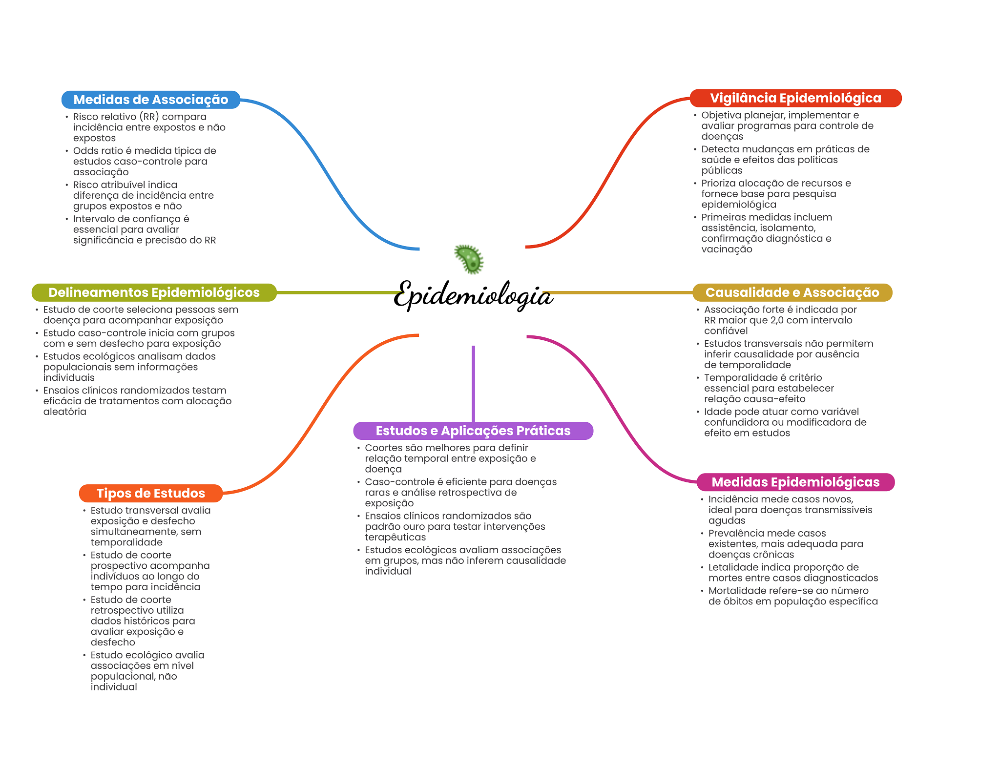 Medidas de Associação Vigilância Epidemiológica Risco relativo (RR) compara Objetiva planejar, implementar e incidência entre expostos e não avaliar programas para controle de expostos doenças Odds ratio é medida típica de Detecta mudanças em práticas de estudos caso-controle para saúde e efeitos das políticas associação públicas Risco atribuível indica Prioriza alocação de recursos e diferença de incidência entre fornece base para pesquisa grupos expostos e não epidemiológica Intervalo de confiança é Primeiras medidas incluem essencial para avaliar assistência, isolamento, significância e precisão do RR confirmação diagnóstica e vacinação Delineamentos Epidemiológicos Epidemiologia Causalidade e Associação Estudo de coorte seleciona pessoas sem Associação forte é indicada por doença para acompanhar exposição RR maior que 2,0 com intervalo Estudo caso-controle inicia com grupos confiável com e sem desfecho para exposição Estudos transversais não permitem Estudos ecológicos analisam dados inferir causalidade por ausência populacionais sem informações de temporalidade individuais Temporalidade é critério Ensaios clínicos randomizados testam essencial para estabelecer eficácia de tratamentos com alocação relação causa-efeito aleatória Idade pode atuar como variável confundidora ou modificadora de Estudos e Aplicações Práticas efeito em estudos Coortes são melhores para definir relação temporal entre exposição e doença Caso-controle é eficiente para doenças Medidas Epidemiológicas Tipos de Estudos raras e análise retrospectiva de exposição Incidência mede casos novos, Estudo transversal avalia Ensaios clínicos randomizados são ideal para doenças transmissíveis exposição e desfecho agudas simultaneamente, sem padrão ouro para testar intervenções terapêuticas Prevalência mede casos temporalidade existentes, mais adequada para Estudo de coorte Estudos ecológicos avaliam associações doenças crônicas prospectivo acompanha em grupos, mas não inferem causalidade individual Letalidade indica proporção de indivíduos ao longo do mortes entre casos diagnosticados tempo para incidência Mortalidade refere-se ao número Estudo de coorte de óbitos em população específica retrospectivo utiliza dados históricos para avaliar exposição e desfecho Estudo ecológico avalia associações em nível populacional, não individual