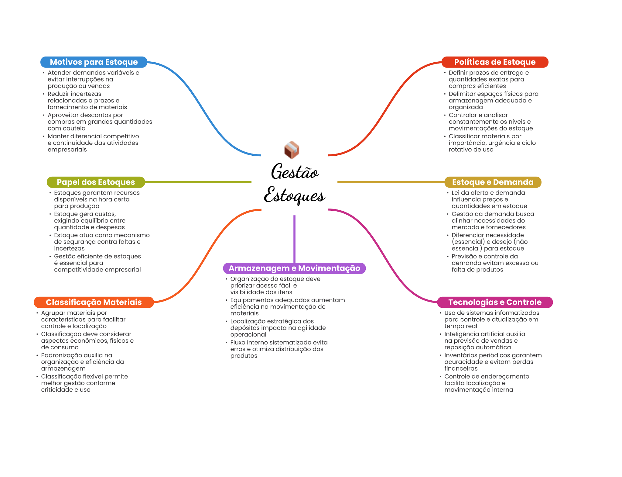Motivos para Estoque Políticas de Estoque Atender demandas variáveis e Definir prazos de entrega e evitar interrupções na quantidades exatas para produção ou vendas compras eficientes Reduzir incertezas Delimitar espaços físicos para relacionadas a prazos e armazenagem adequada e fornecimento de materiais organizada Aproveitar descontos por Controlar e analisar compras em grandes quantidades constantemente níveis e com cautela movimentações do estoque Manter diferencial competitivo Classificar materiais por e continuidade das atividades importância, urgência e ciclo empresariais rotativo de uso Gestão Papel dos Estoques Estoque e Demanda Estoques garantem recursos Estoques Lei da oferta e demanda disponíveis na hora certa influencia preços e para produção quantidades em estoque Estoque gera custos, Gestão da demanda busca exigindo equilíbrio entre alinhar necessidades do quantidade e despesas mercado e fornecedores Estoque atua como mecanismo Diferenciar necessidade de segurança contra faltas e (essencial) e desejo (não incertezas essencial) para estoque Gestão eficiente de estoques Previsão e controle da é essencial para demanda evitam excesso ou competitividade empresarial Armazenagem e Movimentação falta de produtos Organização do estoque deve priorizar acesso fácil e visibilidade dos itens Classificação Materiais Equipamentos adequados aumentam Tecnologias e Controle eficiência na movimentação de Agrupar materiais por materiais Uso de sistemas informatizados características para facilitar Localização estratégica dos para controle e atualização em controle e localização depósitos impacta na agilidade tempo real Classificação deve considerar operacional Inteligência artificial auxilia aspectos econômicos, físicos e Fluxo interno sistematizado evita na previsão de vendas e de consumo erros e otimiza distribuição dos reposição automática Padronização auxilia na produtos Inventários periódicos garantem organização e eficiência da acuracidade e evitam perdas armazenagem financeiras Classificação flexível permite Controle de endereçamento melhor gestão conforme facilita localização e criticidade e uso movimentação interna