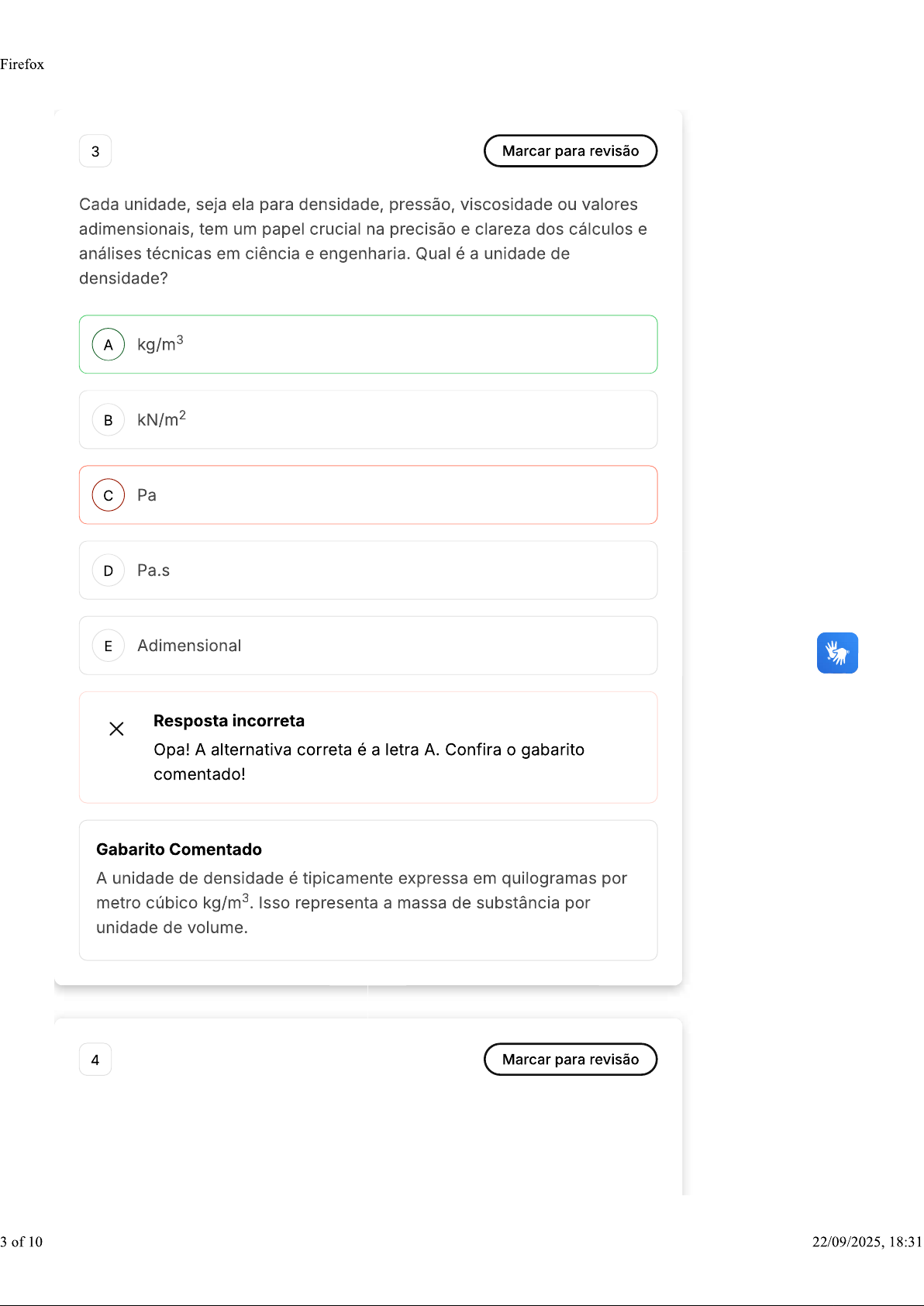 Firefox 3 Marcar para revisão Cada unidade, seja ela para densidade, pressão, viscosidade ou valores adimensionais, tem um papel crucial na precisão e clareza dos cálculos e análises técnicas em ciência e engenharia. Qual é a unidade de densidade? A kg/m³ kN/m² c Pa D Pa.s E Adimensional X Resposta incorreta Opa! A alternativa correta é a letra A. Confira o gabarito comentado! Gabarito Comentado A unidade de densidade é tipicamente expressa em quilogramas por metro cúbico kg/m³. Isso representa a massa de substância por unidade de volume. 4 Marcar para revisão 3 of 10 22/09/2025, 18:31