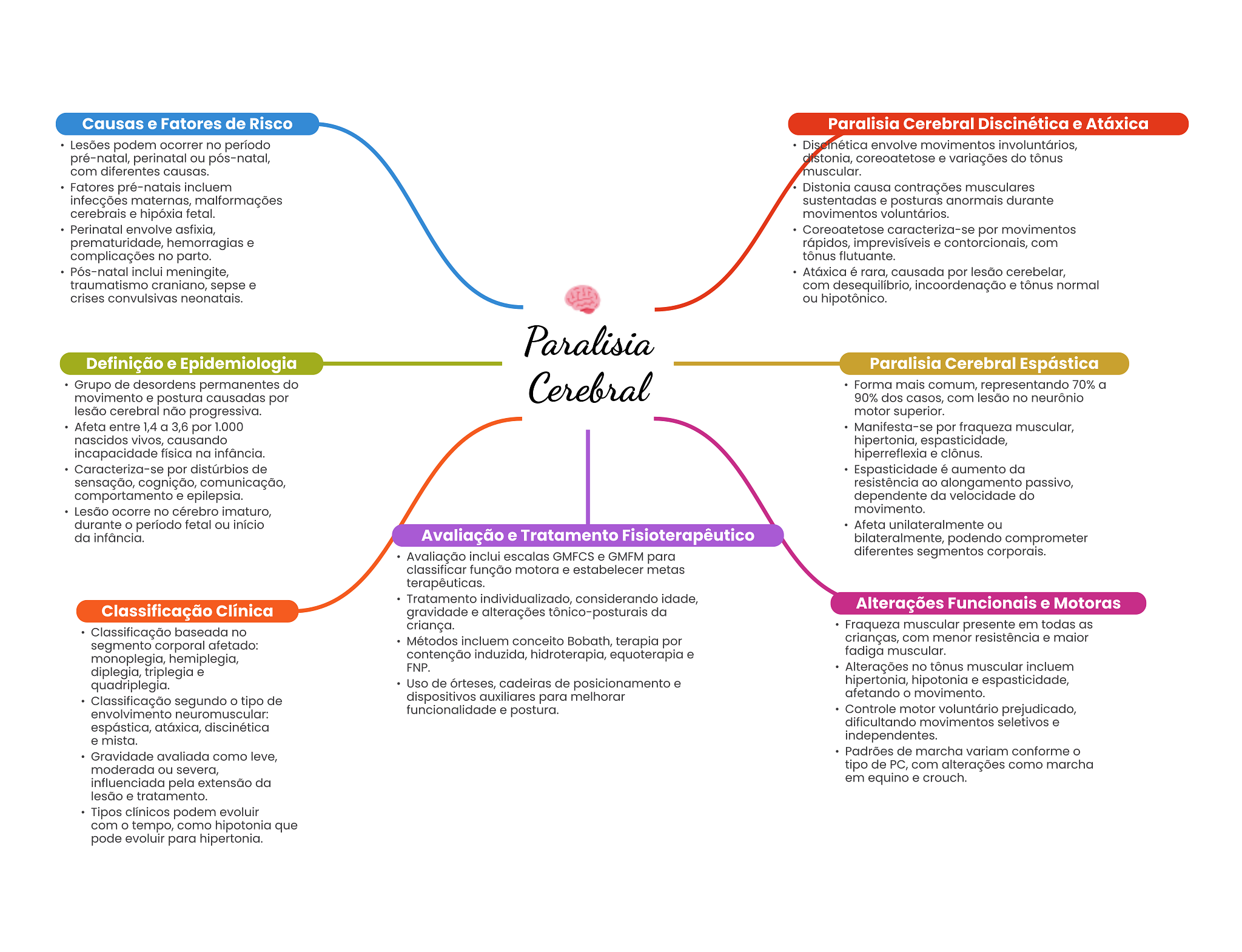 Causas e Fatores de Risco Paralisia Cerebral Discinética e Atáxica Lesões podem ocorrer no período Discinética envolve movimentos involuntários, pré-natal, perinatal ou pós-natal, distonia, coreoatetose e variações do tônus com diferentes causas. muscular. Fatores pré-natais incluem Distonia causa contrações musculares infecções maternas, malformações sustentadas e posturas anormais durante cerebrais e hipóxia fetal. movimentos voluntários. Perinatal envolve asfixia, Coreoatetose caracteriza-se por movimentos prematuridade, hemorragias e rápidos, imprevisíveis e contorcionais, com complicações no parto. tônus flutuante. Pós-natal inclui meningite, Atáxica é rara, causada por lesão cerebelar, traumatismo craniano, sepse e com desequilíbrio, incoordenação e tônus normal crises convulsivas neonatais. ou hipotônico. Paralisia Definição e Epidemiologia Paralisia Cerebral Espástica Grupo de desordens permanentes do movimento e postura causadas por Cerebral Forma mais comum, representando 70% a 90% dos casos, com lesão no neurônio lesão cerebral não progressiva. motor superior. Afeta entre 1,4 a 3,6 por 1.000 Manifesta-se por fraqueza muscular, nascidos vivos, causando hipertonia, espasticidade, incapacidade física na infância. hiperreflexia = clônus. Caracteriza-se por distúrbios de Espasticidade é aumento da sensação, cognição, comunicação, resistência ao alongamento passivo, comportamento e epilepsia. dependente da velocidade do Lesão ocorre no cérebro imaturo, movimento. durante período fetal ou início Afeta unilateralmente ou da infância. Avaliação e Tratamento Fisioterapêutico bilateralmente, podendo comprometer Avaliação inclui escalas GMFCS e GMFM para diferentes segmentos corporais. classificar função motora e estabelecer metas terapêuticas. Tratamento individualizado, considerando idade, Classificação Clínica Alterações Funcionais e Motoras gravidade e alterações tônico-posturais da Classificação baseada no criança. Fraqueza muscular presente em todas as segmento corporal afetado: Métodos incluem conceito Bobath, terapia por crianças, com menor resistência e maior monoplegia, hemiplegia, contenção induzida, hidroterapia, equoterapia e fadiga muscular. diplegia, triplegia e FNP. Alterações no tônus muscular incluem quadriplegia. Uso de órteses, cadeiras de posicionamento e hipertonia, hipotonia e espasticidade, Classificação segundo tipo de dispositivos auxiliares para melhorar afetando movimento. envolvimento neuromuscular: funcionalidade e postura. Controle motor voluntário prejudicado, espástica, atáxica, discinética dificultando movimentos seletivos e e mista. independentes. Gravidade avaliada como leve, Padrões de marcha variam conforme moderada ou severa, tipo de PC, com alterações como marcha influenciada pela extensão da em equino e crouch. lesão e tratamento. Tipos clínicos podem evoluir com tempo, como hipotonia que pode evoluir para hipertonia.