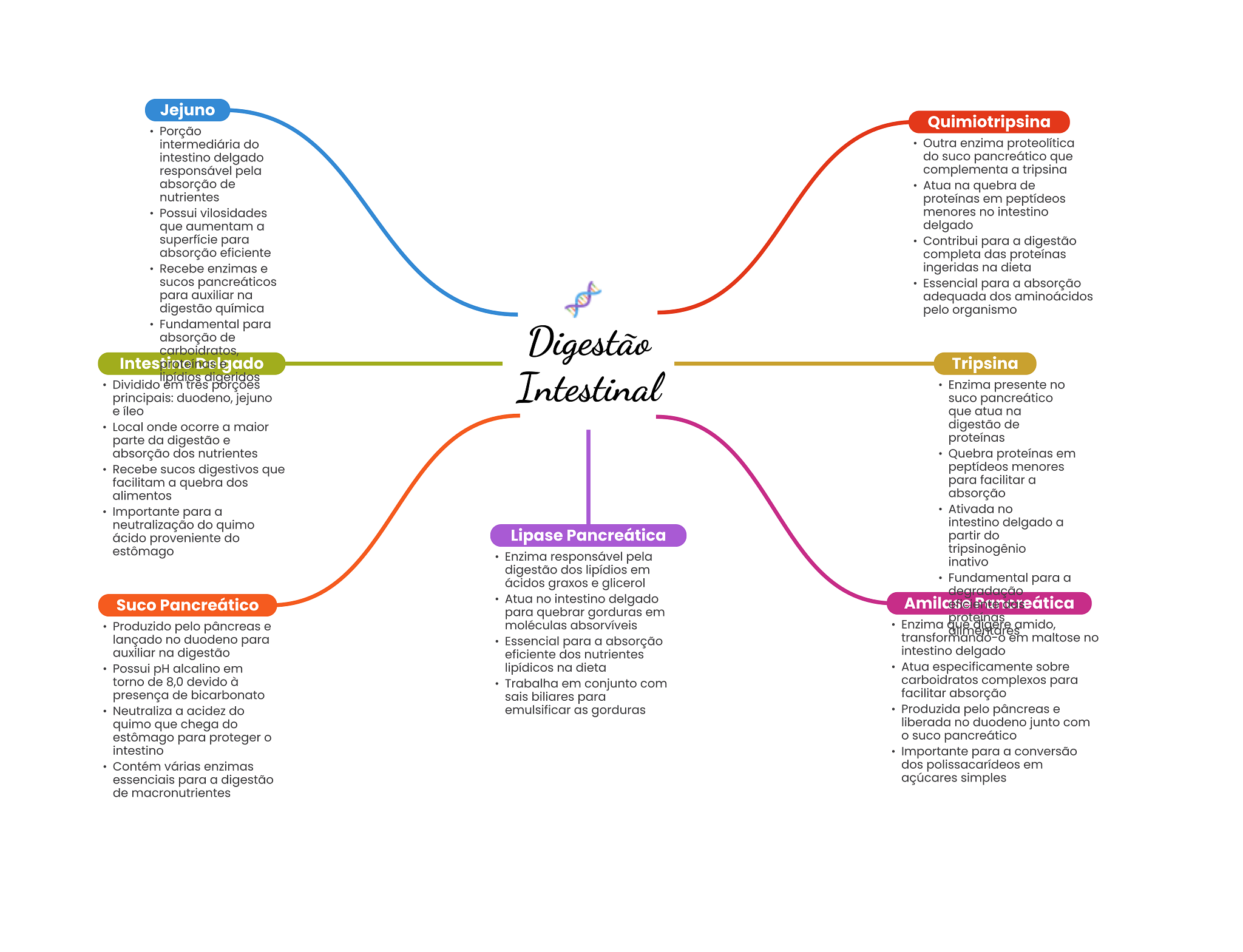 Jejuno Quimiotripsina Porção intermediária do Outra enzima proteolítica intestino delgado do suco pancreático que responsável pela complementa a tripsina absorção de Atua na quebra de nutrientes proteínas em peptídeos Possui vilosidades menores no intestino que aumentam a delgado superfície para Contribui para a digestão absorção eficiente completa das proteínas Recebe enzimas e ingeridas na dieta sucos Essencial para a absorção para auxiliar na adequada dos aminoácidos digestão química pelo organismo Fundamental para absorção de carboidratos Digestão Tripsina lipídios digeridos Dividido em tres porções principais: duodeno, jejuno Intestinal Enzima presente no suco pancreático e íleo que atua na Local onde ocorre a maior digestão de parte da digestão e proteínas absorção dos nutrientes Quebra proteínas em Recebe sucos digestivos que peptídeos menores facilitam a quebra dos para facilitar a alimentos absorção Importante para a Ativada no neutralização do quimo intestino delgado a ácido proveniente do Lipase Pancreática partir do estômago tripsinogênio Enzima responsável pela inativo digestão dos lipídios em ácidos graxos e glicerol Fundamental para a degradação Suco Pancreático Atua no intestino delgado Amilase para quebrar gorduras em Produzido pelo pâncreas e moléculas absorvíveis Enzima que proteinas amido, lançado no duodeno para Essencial para a absorção transformando- em maltose no auxiliar na digestão eficiente dos nutrientes intestino delgado Possui pH alcalino em lipídicos na dieta Atua especificamente sobre torno de 8,0 devido à Trabalha em conjunto com carboidratos complexos para presença de bicarbonato sais biliares para facilitar absorção Neutraliza a acidez do emulsificar as gorduras Produzida pelo pâncreas e quimo que chega do liberada no duodeno junto com estômago para proteger suco pancreático intestino Importante para a conversão Contém várias enzimas dos polissacarídeos em essenciais para a digestão açúcares simples de macronutrientes