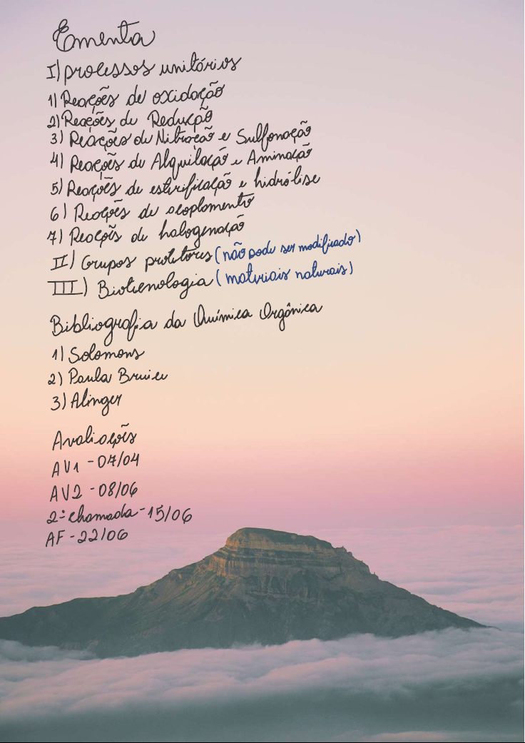 Ementa I) processos de 2) du 3) 41 du 5) de e 61 de 7) II) Crupos (não ser III) naturais) Bibliogrofia da Orgônica Solomons 2) Poula 3) Alinger AV1 AV2 - 08/06 2- AF -22106plangamento e sintese a e ver is que funtor 11 mais erior ma 0 OH 11 OH t + OH (Subproduto) E não AAS(IFA) i pra estor oli. de insumo processo unitório ativa e produto final) ! Esquema ! prova qual esquema + ? CE tem I grupo funcional! Grupos Il funcional C,H Benzeno II) Holetos du Alquila Br, ou I) FIII Grupo funcional R-OH OH IV) ÉTER funcional I V) Amina Crupo funewnol: R-NH2 N NM2 V VI) Aldúdo 11 H C M VII) Cetona Grupo R-C-R 11 C CVIII) Ácido funcional : R- C C C OM OM Amida Crupo : R - =0 NH1 X Ester Crupo funcional: : R-C 11 11 OR C C processo A du Fe + Fe els Na OH quimica I Gonha II Perde 11Ácida que mw Álcool (Substrato) (IFA) de 3° OH (mmor a) b) 1 H30+ + 1- OM OHdupla ligoção vai adieionor processo Oxidação Il Aleenos Se transforma im outra molicula a) Áeida I OM 3- b) OH 3' 1) Hg(OAc) 2, 21 Na BM4 c) 3' 11 BH3, OH 2) Aleeno dl OH NMO Outros KMn (mCPBA ou RCO3H) el Ozonólise (quebra) PROVA 03 DMS Aldúdo e cetona2° a) 11 TMF NaOM OM OH b) OSOH NMO OH 2- e) 3' OH Só nessa + dl 03 DMS 04 el 1) BM3, 2- 1- 2 H2O2 Na OH Anti 2 - -H (OMR) 3' 1) 20 21 Na metoocProcesso I) du D um (Boyer- tem que wm 1 OH ponta (Aldúdo), com "OH" 11 M m-CPBA OH Aldúdo ÁC # du M> Ph V 1° V CH3 II) a) : dieromoto du sádio voi ser OH OH ou H2Cr 04 tem que a dupla ligoepo 11 OH Noo 3: não sofre OM PCC 1- Aldúdo0 de 0 11 2- H> 1) 21 Anti Anti-Mark Mark OH 0 21 PCC Aldúdo 3) 4 quebra da dupla ligação 03 DMS OH 41 OH a que tem I eoloca o DM 5) m-CPBA OH OH 6) Na2 Cr2Processo Redução perde oxiginio gonha I e 1 OH hidroginio 11 du a ? duplo 2 Na de Reagenti OH = 1) NaBHu, 21 3 Mal: Midreto di e de Reduz toolos II) du Q= OH THE BORANO a eoubonila1) Na BH21 21 K20 0