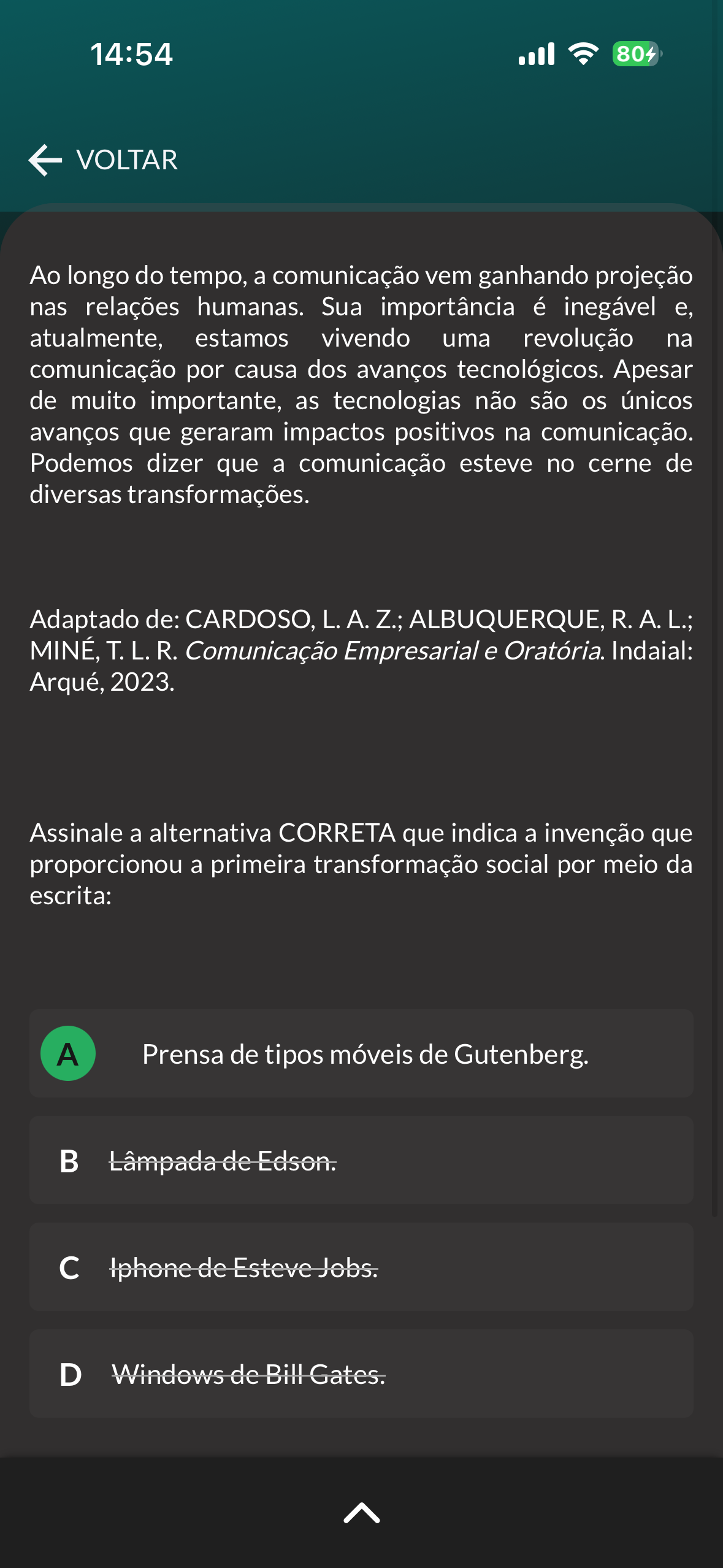 14:54 804 VOLTAR Ao longo do tempo, a comunicação vem ganhando projeção nas relações humanas. Sua importância é inegável e, atualmente, estamos vivendo uma revolução na comunicação por causa dos avanços tecnológicos. Apesar de muito importante, as tecnologias não são os únicos avanços que geraram impactos positivos na comunicação. Podemos dizer que a comunicação esteve no cerne de diversas transformações. Adaptado de: CARDOSO, L.A. Z.; ALBUQUERQUE, R. A. L.; MINÉ, T.L.R. Comunicação Empresarial e Oratória. Indaial: Arqué, 2023. Assinale a alternativa CORRETA que indica a invenção que proporcionou a primeira transformação social por meio da escrita: A Prensa de tipos móveis de Gutenberg. Lâmpada de Edson. c Iphone de Esteve Jobs. D Windows de Bill Gates.