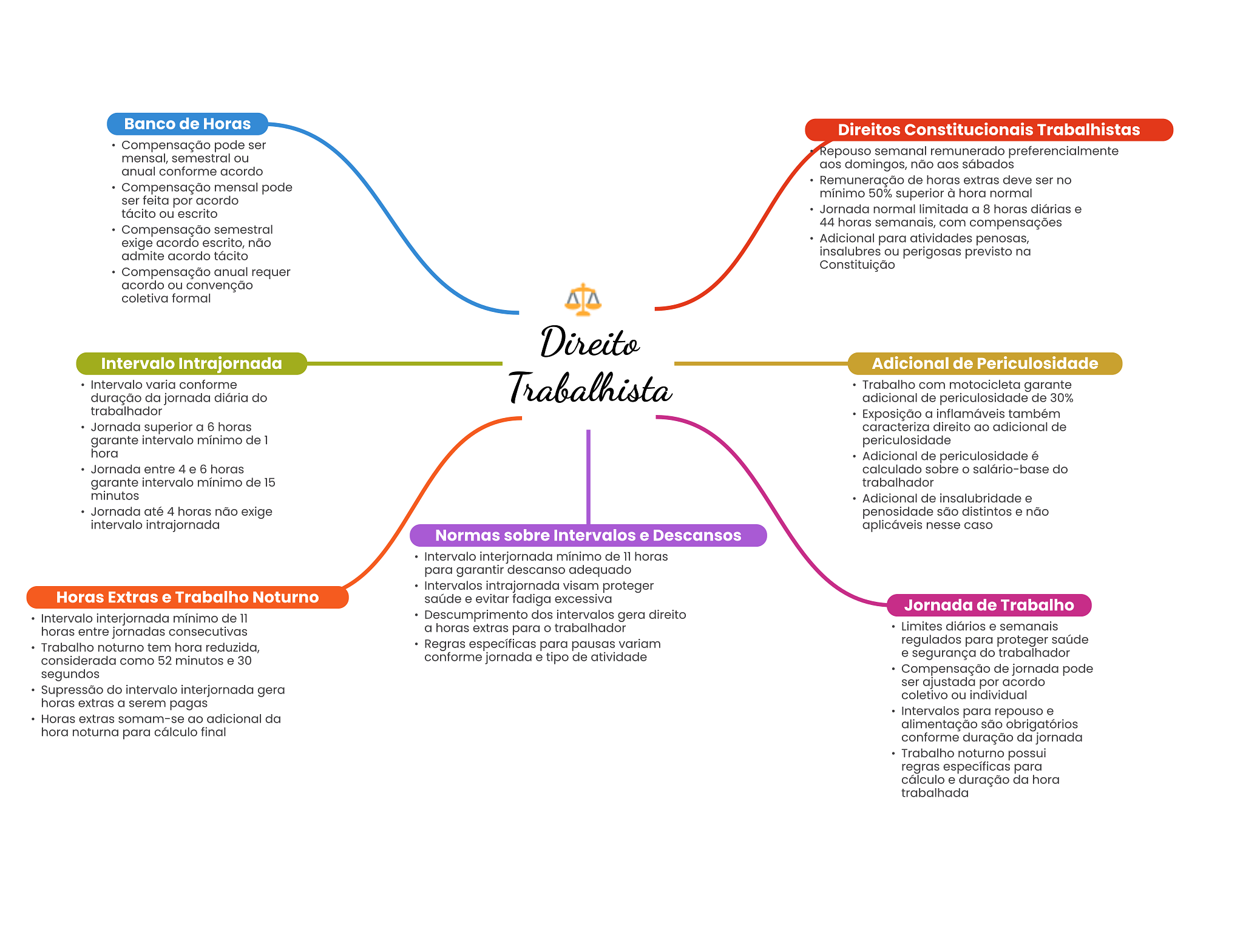 Banco de Horas Direitos Constitucionais Trabalhistas Compensação pode ser Repouso semanal remunerado preferencialmente mensal, semestral ou anual conforme acordo aos domingos, não aos sábados Remuneração de horas extras deve ser no Compensação mensal pode mínimo 50% superior à hora normal ser feita por acordo tácito ou escrito Jornada normal limitada a 8 horas diárias e 44 horas semanais, com compensações Compensação semestral exige acordo escrito, não Adicional para atividades penosas, admite acordo tácito insalubres ou perigosas previsto na Constituição Compensação anual requer acordo ou convenção coletiva formal Direito Intervalo Intrajornada Adicional de Periculosidade Intervalo varia conforme Trabalhista Trabalho com motocicleta garante duração da jornada diária do adicional de periculosidade de 30% trabalhador Exposição a inflamáveis também Jornada superior a 6 horas caracteriza direito ao adicional de garante intervalo mínimo de 1 periculosidade hora Adicional de periculosidade é Jornada entre 4 e 6 horas calculado sobre O salário-base do garante intervalo mínimo de 15 trabalhador minutos Adicional de insalubridade e Jornada até 4 horas não exige penosidade são distintos e não intervalo intrajornada aplicáveis nesse caso Normas sobre Intervalos e Descansos Intervalo interjornada mínimo de 11 horas para garantir descanso adequado Intervalos intrajornada visam proteger Horas Extras e Trabalho Noturno saúde e evitar fadiga excessiva Jornada de Trabalho Intervalo interjornada mínimo de 11 Descumprimento dos intervalos gera direito horas entre jornadas consecutivas a horas extras para trabalhador Limites diários e semanais Trabalho noturno tem hora reduzida, Regras específicas para pausas variam regulados para proteger saúde conforme jornada e tipo de atividade e segurança do trabalhador considerada como 52 minutos e 30 segundos Compensação de jornada pode ser ajustada por acordo Supressão do intervalo interjornada gera coletivo ou individual horas extras a serem pagas Intervalos para repouso e Horas extras somam-se ao adicional da alimentação são obrigatórios hora noturna para cálculo final conforme duração da jornada Trabalho noturno possui regras específicas para cálculo e duração da hora trabalhada