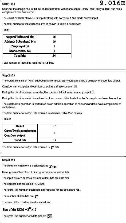 Step 1 of 3 9.016E Consider the design of a 16 bit full adder/subtracter with mode control, carry input, carry output, and two's complement overflow output. The circuit consists of two 16 bit inputs along with carry input and mode control input. The total number of input bits required is shown in Table 1 as follows: Table 1 Augend/ Minuend bits 16 Addend/ Subtrahend bits 16 Carry input bit 1 Mode control bit 1 Total bits 34 Total number of input bits required is 34 bits. Step 2 of 3 The output consists of 16 bit adder/subtracter result, carry output and two's complement overflow output. Consider carry output and overflow output as a single common bit. During the circuit operated as adder, the common bit is treated as carry output bit. During the circuit operated as subtracter, the common bit is treated as two's complement over flow output. The subtraction operation is performed as an addition operation of minuend and the two's complement of subtrahend. The total number of output bits required is shown in Table 2 as follows: Table 2 Result 16 Carry/Two's complement 1 Overflow output Total bits 17 The total number of output bits required is 17 bits. Step 3 of 3 The Read only memory is designated as Here n is number of input bits, m is number of output bits. The input bits are address bits and output bits are data bits. The address bits are called ROM bits. Therefore, the number of address bits required for the circuit are 34 The number of data bits are 17 The size of the ROM required is as follows: Size of the ROM = x17 Therefore, the number of ROM bits are 34