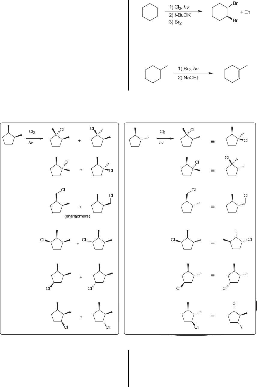 348 CHAPTER 10 To make the desired alkene (cyclohexene) from the starting compound (cyclohexane), we use the same approach taken in the solution to part (c). That is, we perform radical chlorination or bromination to install a leaving group, which then allows for an E2 process with a strong base to give the desired product. Once again, tert-butoxide will likely be more efficient, as it will suppress the competing SN2 process. In summary, the desired transformation can be achieved via the following three-step synthesis: (e) Radical bromination installs a bromine atom selectively at the tertiary position. Then, a strong base is used to give an E2 reaction (Zaitsev product, since the base employed is not sterically hindered): 10.45. cis-1,2-Dimethylcyclopentane produces six pairs of compounds, where each pair have a diastereomeric relationship (except for one pair, which is enantiomeric, indicated below). In contrast, trans-dimethylcyclopentane produces only six different compounds, as shown below: 10.46. (a) Recall that ΔG has two components: (ΔH) and (-TΔS). The first term is positive, so the second term must have a large negative value in order for ΔG to be negative (which is necessary in order for the process to be thermodynamically favorable). This will be the case if ΔS and T are both large and positive (T cannot be negative). At high T, both of these terms are indeed large. ΔS is large and positive because one chemical entity is being converted into two chemical entities, which significantly increases the entropy of the system. www.MyEbookNiche.eCrater.com
