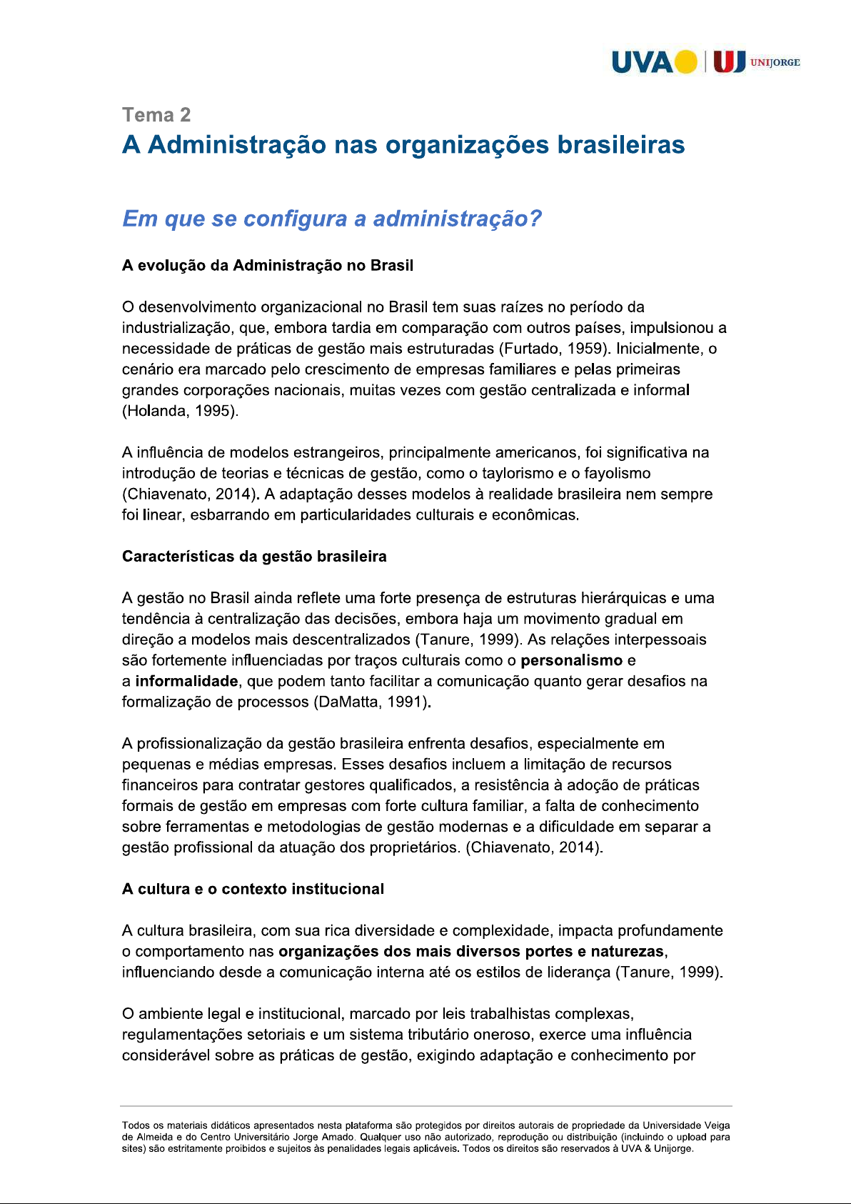 UVA UJ UNIJORGE Tema 2 A Administração nas organizações brasileiras Em que se configura a administração? A evolução da Administração no Brasil desenvolvimento organizacional no Brasil tem suas raízes no período da industrialização, que, embora tardia em comparação com outros países, impulsionou a necessidade de práticas de gestão mais estruturadas (Furtado, 1959). Inicialmente, o cenário era marcado pelo crescimento de empresas familiares e pelas primeiras grandes corporações nacionais, muitas vezes com gestão centralizada e informal (Holanda, 1995). A influência de modelos estrangeiros, principalmente americanos, foi significativa na introdução de teorias e técnicas de gestão, como o taylorismo e o fayolismo (Chiavenato, 2014). A adaptação desses modelos à realidade brasileira nem sempre foi linear, esbarrando em particularidades culturais e econômicas. Características da gestão brasileira A gestão no Brasil ainda reflete uma forte presença de estruturas hierárquicas e uma tendência à centralização das decisões, embora haja um movimento gradual em direção a modelos mais descentralizados (Tanure, 1999). As relações interpessoais são fortemente influenciadas por traços culturais como personalismo e a informalidade, que podem tanto facilitar a comunicação quanto gerar desafios na formalização de processos (DaMatta, 1991). A profissionalização da gestão brasileira enfrenta desafios, especialmente em pequenas e médias empresas. Esses desafios incluem a limitação de recursos financeiros para contratar gestores qualificados, a resistência à adoção de práticas formais de gestão em empresas com forte cultura familiar, a falta de conhecimento sobre ferramentas e metodologias de gestão modernas e a dificuldade em separar a gestão profissional da atuação dos proprietários. (Chiavenato, 2014). A cultura e contexto institucional A cultura brasileira, com sua rica diversidade e complexidade, impacta profundamente o comportamento nas organizações dos mais diversos portes e naturezas, influenciando desde a comunicação interna até estilos de liderança (Tanure, 1999). ambiente legal e institucional, marcado por leis trabalhistas complexas, regulamentações setoriais e um sistema tributário oneroso, exerce uma influência considerável sobre as práticas de gestão, exigindo adaptação e conhecimento por Todos os materiais didáticos apresentados nesta plataforma são protegidos por direitos autorais de propriedade da Universidade Veiga de Almeida e do Centro Universitário Jorge Amado. Qualquer uso não autorizado, reprodução ou distribuição (incluindo upload para sites) são estritamente proibidos e sujeitos às penalidades legais aplicáveis. Todos direitos são reservados à UVA & Unijorge.UVA UNIJORGE parte dos administradores. A burocracia, especialmente no setor público, é um traço marcante que impacta a eficiência e a agilidade dos processos (Chiavenato, 2020). Gestão no Setor Público A administração pública brasileira possui uma estrutura complexa e enfrenta desafios históricos relacionados à eficiência e à burocracia. Tentativas de modernização da gestão pública buscam a implementação de práticas focadas em resultados e na otimização de recursos; no entanto, a rigidez burocrática, a falta de inovação e questões éticas ainda representam obstáculos importantes para a transformação da gestão no setor público (Chiavenato, 2020). Inovações e tendências presente cenário da gestão no Brasil é marcado pela crescente adoção de tecnologias emergentes, como inteligência artificial, análise de dados e automação, que transformam processos e modelos de negócio (Tanure, 2019). Metodologias ágeis e a busca por inovação aberta ganham espaço nas organizações. Saiba mais Inovação Aberta É um modelo em que as empresas buscam ativamente ideias, tecnologias e conhecimento fora de suas fronteiras organizacionais, colaborando com startups, universidades, clientes e outras partes interessadas para acelerar a inovação e reduzir custos e riscos. A sustentabilidade e a inserção gradual dos princípios de ESG (ambiental, social e governança) na estratégia organizacional refletem uma preocupação crescente com o impacto das empresas na sociedade e no meio ambiente (Chiavenato, 2020). Desafios atuais para a gestão empresarial no Brasil Os gestores brasileiros enfrentam a complexidade de um ambiente econômico, político e regulatório instável, que exige adaptabilidade e resiliência, uma vez que a pressão por maior produtividade e competitividade em mercados globalizados é constante. Nesse contexto, torna-se estratégico desenvolver lideranças adaptáveis, éticas e orientadas para resultados, capazes de navegar pela incerteza e de construir organizações sustentáveis e inovadoras (Tanure, 2019). Os desafios a serem enfrentados pelos gestores se alteram a cada cenário interno ou externo. Vejamos alguns que podem ser tomados como exemplos relevantes no contexto das organizações brasileiras: Gestão da diversidade e inclusão Todos os materiais didáticos apresentados nesta plataforma são protegidos por direitos autorais de propriedade da Universidade Veiga de Almeida e do Centro Universitário Jorge Amado. Qualquer uso não autorizado, reprodução ou distribuição (incluindo upload para sites) são estritamente proibidos e sujeitos às penalidades legais aplicáveis. Todos os direitos são reservados à UVA & Unijorge.UVA UNIJORGE Dada a rica diversidade do Brasil, a gestão da diversidade e a promoção da inclusão nas organizações tornam-se cada vez mais inadiáveis. Empresas que valorizam e implementam práticas inclusivas tendem a atrair e reter talentos mais diversos, a estimular a criatividade e a inovação e a construir uma reputação mais positiva. Os desafios incluem superar preconceitos, adaptar políticas públicas e empresariais e criar uma cultura organiza