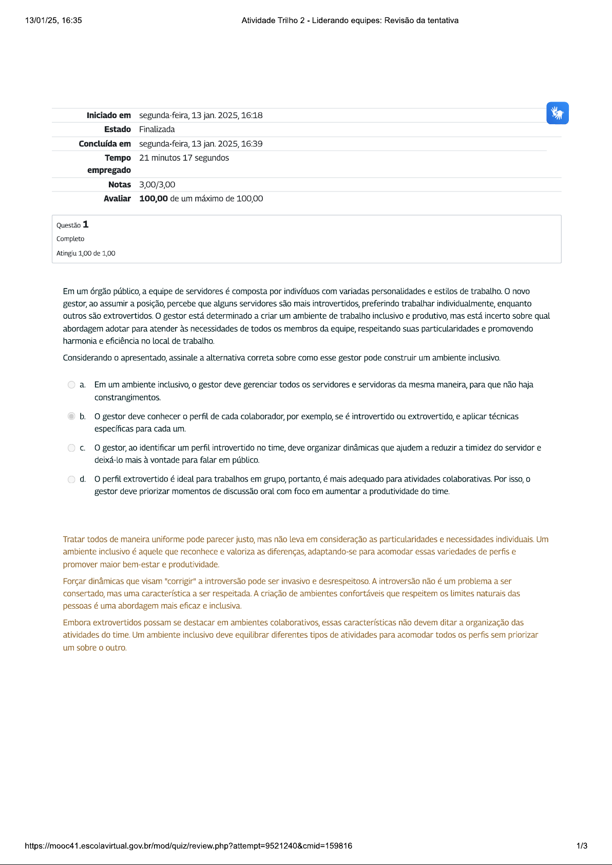 13/01/25, 16:35 Atividade Trilho 2 Liderando equipes: Revisão da tentativa Iniciado em segunda-feira, 13 jan. 2025, 16:18 Estado Finalizada Concluída em segunda-feira, 13 jan. 2025, 16:39 Tempo 21 minutos 17 segundos empregado Notas 3,00/3,00 Avaliar 100,00 de um máximo de 100,00 Questão 1 Completo Atingiu 1,00 de 1,00 Em um órgão público, a equipe de servidores é composta por indivíduos com variadas personalidades e estilos de trabalho. o novo gestor, ao assumir a posição, percebe que alguns servidores são mais introvertidos, preferindo trabalhar individualmente, enquanto outros são extrovertidos. o gestor está determinado a crian um ambiente de trabalho inclusivo e produtivo, mas está incerto sobre qual abordagem adotar para atender às necessidades de todos os membros da equipe, respeitando suas particularidades e promovendo harmonia e eficiência no local de trabalho. Considerando o apresentado, assinale a alternativa correta sobre como esse gestor pode construir um ambiente inclusivo. a. Em um ambiente inclusivo, o gestor deve todos os servidores e servidoras da mesma maneira, para que não haja constrangimentos. b. gestor deve conhecer o perfil de cada colaborador, por exemplo, se é introvertido ou extrovertido, e aplicar técnicas específicas para cada um. C. o gestor, ao identificar um perfil introvertido no time, deve organizar dinâmicas que ajudem a reduzin a timidez do servidor e deixá-lo mais à vontade para falar em público. d. o perfil extrovertido é ideal para trabalhos em grupo, portanto, é mais adequado para atividades colaborativas. Por isso, o gestor deve priorizar momentos de discussão oral com foco em aumentar a produtividade do time. Tratar todos de maneira uniforme pode parecer justo, mas não leva em consideração as particularidades e necessidades individuais. Um ambiente inclusivo é aquele que reconhece e valoriza as diferenças, adaptando-se para acomodar essas variedades de perfis e promover maior bem-estar e produtividade. Forçar dinâmicas que visam "corrigir" a introversão pode ser invasivo e desrespeitoso. A introversão não é um problema a ser consertado, mas uma característica a ser respeitada. A criação de ambientes confortáveis que respeitem os limites naturais das pessoas é uma abordagem mais eficaz e inclusiva. Embora extrovertidos possam se destacar em ambientes colaborativos, essas características não devem ditar a organização das atividades do time. Um ambiente inclusivo deve equilibrar diferentes tipos de atividades para acomodar todos os perfis sem priorizar um sobre o outro. 1/313/01/25, 16:35 Atividade Trilho 2 - Liderando equipes: Revisão da tentativa Questão 2 Completo Atingiu 1,00 de 1,00 Em um órgão público, um gestor recém-nomeado está enfrentando desafios para melhorar a coesão e a cooperação entre os membros de sua equipe. A equipe é composta por indivíduos com diferentes preferências de trabalho: alguns valorizam a comunicação e o trabalho colaborativo frequente, enquanto outros preferem concentrar-se em suas tarefas de forma mais independente, em um ambiente calmo e sem interrupções. Para favorecer a coesão e a cooperação em seu time, o gestor deve a. priorizar momentos presenciais para que o time possa trabalhar em conjunto e ao mesmo tempo, independentemente do perfil dos servidores do time, sejam eles introvertidos ou extrovertidos. b. reduzir os momentos silenciosos e sem interrupção para aumentar a comunicação e a interação entre os membros da equipe. C. proporcionar momentos silenciosos mais longos e com menos interrupções, alternando com espaços de interação social mais intensos e por períodos mais curtos. d. estabelecer um ambiente de trabalho onde a comunicação deve ser constante, incentivando os membros da equipe a estarem sempre acessíveis para perguntas e discussões. Momentos presenciais podem ser benéficos para facilitar a interação e o trabalho colaborativo; contudo, ignorar as preferências individuais dos servidores (introvertidos ou extrovertidos) pode não ser eficaz. Forçar um método único de trabalho não atende às necessidades de todos, podendo causar desconforto ou reduzir a produtividade para aqueles que têm perfis diferentes. Diminuir os períodos de trabalho silencioso pode ser prejudicial, especialmente para membros da equipe que precisam de foco e concentração para realizar suas tarefas. Um ambiente constantemente interrompido pode diminuir a produtividade e a qualidade do trabalho, além de aumentar o estresse para aqueles que preferem ou necessitam de ambiente calmo para serem produtivos. Respeitar as diferentes preferências de trabalho da equipe, alternando momentos silenciosos mais longos com períodos curtos de interação social fortalecem a coesão e permitem a colaboração necessária. Embora a comunicação seja essencial, exigir que os membros estejam constantemente acessíveis pode ser contraproducente. Isso pode interromper o foco e o fluxo de trabalho, especialmente para aqueles que preferem trabalhar em um ambiente calmo e sem interrupções. https://mooc41.escolavirtual.gov.br/mod/quiz/review.php?attempt=9521240&cmid=159816 2/313/01/25, 16:35 Atividade Trilho 2 Liderando equipes: Revisão da tentativa Questão 3 Completo Atingiu 1,00 de 1,00 Em um determinado órgão público, a gestora percebeu que, enquanto alguns servidores do time estão altamente motivados e proativos, contribuindo com ideias inovadoras e mostrando comprometimento, outros servidores estão desmotivados, cumprindo apenas suas tarefas essenciais sem interesse adicional ou iniciativa. Considerando o apresentado, para engajar a equipe no trabalho, o gestor deve que a. servidores engajados são pessoas altamente produtivas, dispostas, multitarefas e otimistas. Assim, deve envolver os servidores e servidoras em novos projetos, aumentando a produtividade do time. Projetos desafiadores também ajudam a manter o interesse e a motivação altos, i