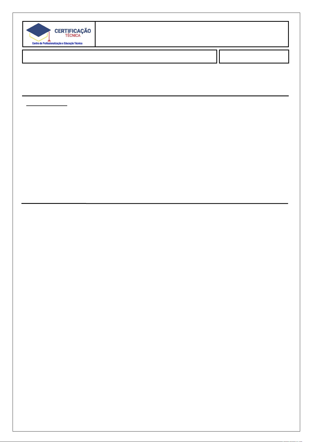 NR de 1 a 12 Data: Aluno(a): Atividade Prática Final INSTRUÇÕES: · Esta Atividade contém 05 (cinco) questões totalizando 10 (dez) pontos, atribuídos da seguinte forma: Questão 01 vale 1,0 ponto. Questão 02 vale 3,0 pontos. Questão 03 vale 3,0 pontos. Questão 04 vale 2,0 pontos. Questão 05 vale 1,0 ponto. · Você deve preencher dos dados no Cabeçalho para sua identificação: Nome / Data de entrega. · As atividades sem identificação serão consideradas inválidas. · As respostas devem ser digitadas abaixo de cada pergunta; · Ao terminar salve o arquivo no formato PDF ou DOC; · Envio o arquivo pelo sistema no local indicado; · Em caso de dúvidas consulte o seu Tutor. Demonstre o seu aprendizado no curso respondendo os tópicos abaixo: 1 – A NR 1 – Disposições Gerais, traz em seu escopo, dentre outros temas, os seguintes itens: a) Objetivo b) Campo de aplicação c) Direitos e deveres Dentre esses itens escolha UM e explique por que, na sua opinião, ele é importante na matéria de Saúde e Segurança do Trabalho. 2 – Utilizando como base o subitem 4.5.1 da NR 4 - Serviços Especializados em Segurança e em Medicina do Trabalho – e os seus quadros I e II e, elabore as respostas dessa questão: a) Crie uma empresa fictícia (nome fantasia): b) Informe quantos empregados o estabelecimento possui. c) Escolha uma atividade econômica, informe o número do código da atividade que escolheu e o grau de risco atribuída a ela. Para fazer isso consulte o quadro I da NR 4 – Classificação de Atividades Econômicas (CNAE), d) A partir do grau de risco da atividade econômica que escolheu e o número de empregados no estabelecimento, constitua um SESMT, especificando quantos e quais profissionais do atuarão nesse serviço. Para isso consulte o quadro II da NR 4. e) Informe quantas horas cada um desses profissionais deverá dedicar ao SEMT. Para isso consulte o quadro II da NR 4. IMPORTANTE: NÃO utilize atividade relacionadas a AGRICULTURA, ATIVIDADES SAZONAIS (que só operam em determinado período no ano), MINERAÇÃO E CONSTRUÇÃO CIVIL, pois essas têm dimensionamento de CIPA e/ou SESMT diferenciado. 3 – A partir das INFORMAÇÕES COM AS QUAIS RESPONDEU À QUESTÃO 2, (atividade econômica, grau de risco e número de empregados) e do que está disposto na NR 5 - Comissão Interna de Prevenção de Acidentes – constitua uma CIPA informando APENAS: a) Quantos representantes efetivos, eleitos, a comissão terá: b) Quantos representantes suplentes, eleitos, a comissão terá: c) Qual o período do mandato dessa comissão: Para isso, consulte o quadro I dessa NR 4 – A partir INFORMAÇÕES COM AS QUAIS RESPONDEU À QUESTÃO 2 (atividade econômica, grau de risco e número de empregados) e do que está disposto na NR 6 – Equipamento de Proteção Individual – crie: a) UM setor de serviço no qual um trabalhador, ou mais, esteja exposto a um ou mais risco ocupacional. b) Especifique, de acordo com a NR 6, quais EPI deverão ser utilizados por esses trabalhadores para sua proteção. OBS: Os riscos e EPI devem ter relação com o tipo de riscos e atividade desenvolvida nesse setor. 5 – De acordo com a NR 7 – Programa de Controle Médico de Saúde Ocupacional – quais são os exames previstos no Atestados de Saúde Ocupacional – ASO – que atestam, ou não, a capacidade de saúde dos trabalhadores da empresa? Atividade Prática Serviços de Turismo e Viagens - GUI image2.jpeg image3.jpg image1.png