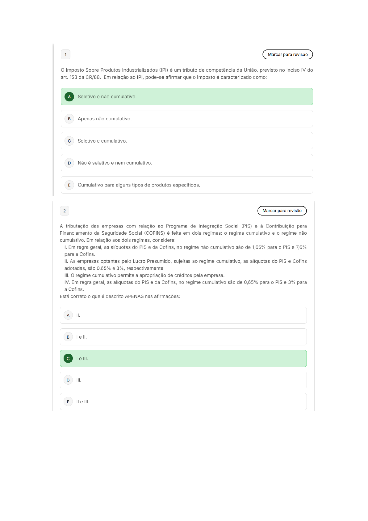 1 Marcar para revisão O Imposto Sobre Produtos Industrializados (IPI) é um tributo de competência da União, previsto no inciso IV do art. 153 da CR/88. Em relação ao IPI, pode-se afirmar que o imposto é caracterizado como: A Seletivo e não cumulativo. Apenas não cumulativo. Seletivo e cumulativo. D Não é seletivo e nem cumulativo. E Cumulativo para alguns tipos de produtos específicos. 2 Marcar para revisão A tributação das empresas com relação ao Programa de Integração Social (PIS) e à Contribuição para Financiamento da Seguridade Social (COFINS) é feita em dois regimes: o regime cumulativo e o regime não cumulativo. Em relação aos dois regimes, considere: I. Em regra geral, as alíquotas do PIS e da Cofins, no regime não cumulativo são de 1,65% para o PIS e 7,6% para a Cofins. II. As empresas optantes pelo Lucro Presumido, sujeitas ao regime cumulativo, as alíquotas do PIS e Cofins adotadas, são 0,65% e 3%, respectivamente III. regime cumulativo permite a apropriação de créditos pela empresa. IV. Em regra geral, as alíquotas do PIS e da Cofins, no regime cumulativo são de 0,65% para o PIS e 3% para a Cofins. Está correto o que é descrito APENAS nas afirmações: A II. e II. III. D III. E e III.3 Marcar para revisão imposto sobre serviços de qualquer natureza (ISS) é um imposto brasileiro municipal, ou seja, somente os municípios têm competência para instituí-lo (Art.156, III, da Constituição Federal). A única exceção é o Distrito Federal, unidade da federação que tem as mesmas atribuições dos Estados e dos Municípios. contribuinte é prestador do serviço. Analise as afirmativas a seguir sobre o ISS Imposto sobre serviços de qualquer natureza e assinale a alternativa correta: I. imposto será devido no local do estabelecimento do tomador ou intermediário do serviço ou, na falta de estabelecimento, onde ele estiver domiciliado. II. imposto será devido no local da execução dos serviços de diversão, lazer, entretenimento e congêneres; III. imposto incide sobre o fornecimento de mercadorias com a simultânea prestação de serviços em bares, restaurantes e estabelecimentos similares. IV. A legislação possibilita que os municípios e Distrito Federal atribuam, mediante lei, a responsabilidade pelo crédito tributário a terceira pessoa que seja vinculada diretamente ao fato gerador do imposto Estão corretas as afirmações: A e III apenas. e III apenas. I, III e IV apenas. D I, e IV apenas. 4 Marcar para revisão UFPB (INSTITUTO AOCP 2019 adaptada) Os tributos sobre vendas são aqueles cobrados sobre o produto ou serviço comercializado, podendo ter incidência federal, estadual ou municipal. A incidência desses tributos varia de acordo com a mercadoria ou serviço comercializado. Sobre os impostos e contribuições nas operações de compras e vendas, assinale a alternativa correta. Nas operações de compras e vendas, existem diversos impostos e contribuições que fazem parte A dessas negociações, como ICMS, IPI, ISS, PIS e COFINS. IPI e ICMS são contribuições, enquanto o PIS e o COFINS são impostos que fazem parte das transações de compra e de venda. Os valores de impostos e contribuições inerentes às operações de venda são obrigações da empresa C perante os fiscos municipais (ICMS, IPI), estaduais (ISS) ou federais (PIS, COFINS). Os impostos e contribuições podem ser considerados débitos fiscais nas operações de compras, D gerando obrigações para os compradores das mercadorias. E Na comercialização de mercadorias e produtos, existe a inclusão do IPI no preço final.5 Marcar para revisão (CONSULPLAN 2019 CFC Bacharel em Ciências Contábeis 2° Exame adaptada) A Sociedade Empresária adquiriu, a prazo, mercadorias para revenda pelo valor de R 300.000,00, 51.000,00 incluído na NF. Adicionalmente, pagou, à vista, R$ 5.000,00 a título de frete para transporte das mercadorias, sem incidência de ICMS. Tendo como referência apenas essas informações apresentadas, o lançamento contábil que melhor registra essa operação é: DÉBITO Mercadorias para Revenda R$ 254.000,00 DÉBITO ICMS a Recuperar R$ 51.000,00 A DÉBITO Fretes e Carretos Despesa Administrativa R$ 5.000,00 CRÉDITO Fornecedores R$ 300.000,00 CRÉDITO Caixa R$ 5.000,00 DÉBITO Mercadorias para Revenda R$ 254.000,00 DÉBITO ICMS a Recuperar R$ 51.000,00 CRÉDITO Fornecedores R$ 249.000,00 CRÉDITO Caixa R$ 5.000,00 DÉBITO Mercadorias para Revenda R$ 249.000,00 DÉBITO ICMS Despesas Tributárias R$ 51.000,00 C CRÉDITO Caixa R$ 5.000,00 CRÉDITO Fornecedores R$ 254.000,00 DÉBITO Mercadorias para Revenda R$ 254.000,00 DÉBITO ICMS a Recuperar R$ 51.000,00 D CRÉDITO Fornecedores R$ 300.000,00 CRÉDITO Caixa R$ 5.000,00 DÉBITO Mercadorias para Revenda R$ 300.000,00 DÉBITO ICMS Despesas Tributárias R$ 51.000,00 E CRÉDITO Caixa R$ 5.000,00 CRÉDITO Fornecedores R$ 300.000,006 Marcar para revisão Imposto Sobre Serviços (ISS) é um tributo que incide na prestação de serviços realizada por empresas e profissionais autônomos. Ele é recolhido pelos municípios e pelo Distrito Federal. ISS é conhecido também pela sigla ISSQN Imposto Sobre Serviços de Qualquer Natureza. Quase todas as operações envolvendo serviços geram a cobrança deste tributo. Na definição da base de cálculo do ISS, as empresas prestadoras de serviços devem considerar: A preço do serviço deduzidos dos custos diretos. o preço do serviço deduzidos dos custos indiretos. c valor total cobrado na prestação do serviço. D a receita líquida dos serviços. E o lucro obtido. 7 Marcar para revisão Imposto sobre operações relativas à circulação de mercadorias e sobre prestações de serviços de transporte interestadual e intermunicipal e de comunicação ICMS é reconhecido como o tributo com maior arrecadação do Brasil. Quanto ao ICMS, é correto afirmar: imposto incidirá sobre valor total da operação, quando mercadorias forem fornecidas co