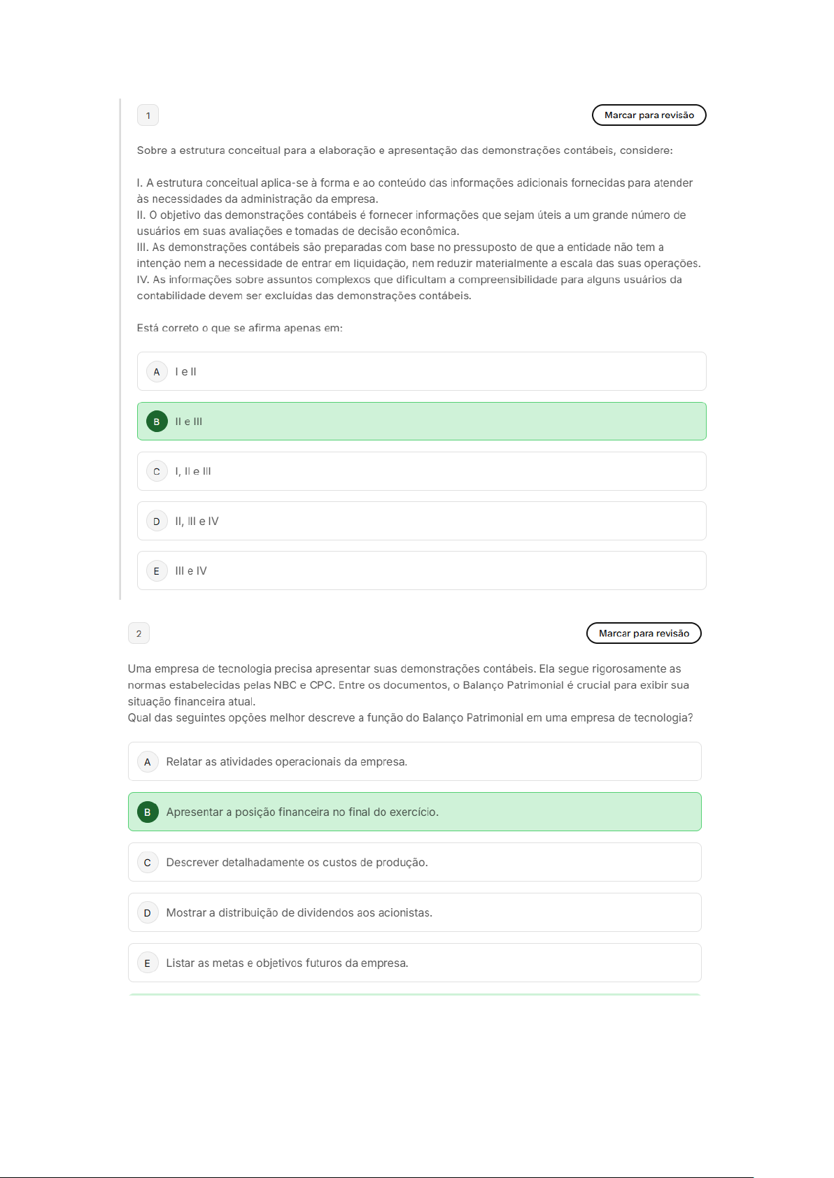 1 Marcar para revisão Sobre a estrutura conceitual para a elaboração e apresentação das demonstrações contábeis, considere: I. A estrutura conceitual aplica-se à forma e ao conteúdo das informações adicionais fornecidas para atender às necessidades da administração da empresa. II. objetivo das demonstrações contábeis é fornecer informações que sejam úteis a um grande número de usuários em suas avaliações e tomadas de decisão econômica. III. As demonstrações contábeis são preparadas com base no pressuposto de que a entidade não tem a intenção nem a necessidade de entrar em liquidação, nem reduzir materialmente a escala das suas operações. IV. As informações sobre assuntos complexos que dificultam a compreensibilidade para alguns usuários da contabilidade devem ser excluídas das demonstrações contábeis. Está correto o que se afirma apenas em: A e e III C I, e III D II, III e IV E III e IV 2 Marcar para revisão Uma empresa de tecnologia precisa apresentar suas demonstrações contábeis. Ela segue rigorosamente as normas estabelecidas pelas NBC e CPC. Entre os documentos, o Balanço Patrimonial é crucial para exibir sua situação financeira atual. Qual das seguintes opções melhor descreve a função do Balanço Patrimonial em uma empresa de tecnologia? A Relatar as atividades operacionais da empresa. Apresentar a posição financeira no final do exercício. Descrever detalhadamente os custos de produção. D Mostrar a distribuição de dividendos aos acionistas. E Listar as metas e objetivos futuros da empresa.3 Marcar para revisão Em conformidade com estabelecido pelo CPC 00, conceito financeiro de manutenção do capital, no qual capital é definido em unidades monetárias nominais, o ganho por manutenção e/ou a estocagem de ativos, no período, só podem ser reconhecidos como lucro A No momento em que ocorrer variação do indexador definido pelo órgão regulador. De acordo com regime de competência independentemente da transferência para terceiros. Ao final de cada período verificado pela variação de um indexador definido pela entidade. D No momento em que esses ativos forem efetivamente vendidos a terceiros. E Ao final do período examinado se ocorrer aumento no índice geral de preços. 4 Marcar para revisão A empresa de consultoria financeira precisa garantir que suas demonstrações contábeis sejam consistentes ano a ano. Isso permite que os investidores façam comparações significativas entre os períodos. Qual característica das demonstrações contábeis assegura que os dados sejam comparáveis ao longo do tempo? A Materialidade Consistência Clareza D Confiabilidade E Relevância5 Marcar para revisão Uma sociedade empresária mensura suas propriedades para investimento a um valor justo, tal como previsto pela NBC TG 28 (R3) propriedades para investimento. No entanto, ela deixou de apresentar, na nota de conciliação dos valores contábeis da propriedade de investimento no início e no fim do período, item "ganhos ou perdas líquidos provenientes de ajustes de valor justo". Essa omissão restringiu a capacidade analítica do usuário e, entre outras perdas de qualidade, prejudicou valor confirmatório. De acordo com disposto pela NBC TG estrutura conceitual estrutura conceitual para elaboração e divulgação de relatório contábil-financeiro, valor confirmatório é uma das marcas da característica qualitativa da: A Materialidade Relevância Representação fidedigna D Tempestividade E Entidade 6 Marcar para revisão As demonstrações contábeis, quando corretamente elaboradas, satisfazem às necessidades comuns da maioria dos seus usuários, uma vez que quase todos eles as utilizam para a tomada de decisões de ordem econômica. Sob esse aspecto, pode-se dizer que, entre outras finalidades, os usuários baseiam-se nas demonstrações contábeis para praticar as seguintes ações, exceto: A Decidir quando comprar, manter ou vender um investimento em ações. Avaliar a capacidade da entidade de pagar seus empregados e proporcionar-lhes outros benefícios. C Determinar a distribuição de lucros e dividendos. D Regulamentar as atividades das entidades. E Fiscalizar a lisura dos atos administrativos.7 Marcar para revisão A chamada "saúde" financeira e econômica das empresas, no fim de cada ano ou em qualquer data prefixada, pode ser feita na demonstração financeira denominada: A Balanço patrimonial. Demonstração do resultado do exercício. Demonstração do lucro ou prejuízo acumulado. D Demonstração de origens e aplicações de recursos. E Demonstração das mutações do patrimônio líquido. 8 Marcar para revisão Das cinco assertivas abaixo, apenas uma expressa a informação correta. Assinale a opção que a contém. As características qualitativas são os atributos que tornam as demonstrações contábeis úteis para os A usuários. As principais características qualitativas são: compreensibilidade, relevância, confiabilidade, continuidade e comparabilidade. As normas contábeis chamam de "elementos das demonstrações contábeis" as classes em que são retratados os efeitos patrimoniais e financeiros das transações e outros eventos de acordo com as suas características econômicas. Os elementos diretamente relacionados à mensuração da posição patrimonial e financeira da entidade são as receitas e as despesas. Os elementos diretamente relacionados com a mensuração do desempenho da entidade são os D ativos, os passivos e patrimônio líquido. A demonstração das mutações na posição financeira não reflete os elementos da demonstração do E resultado, e sim as ocorridas nos elementos do balanço patrimonial.9 Marcar para revisão Uma das características qualitativas da informação contábil-financeira útil é a relevância. Nos termos da Resolução CFC n° 1.374/2011, que dá nova redação à NBC TG estrutura conceitual, a relevância é entendida como a característic