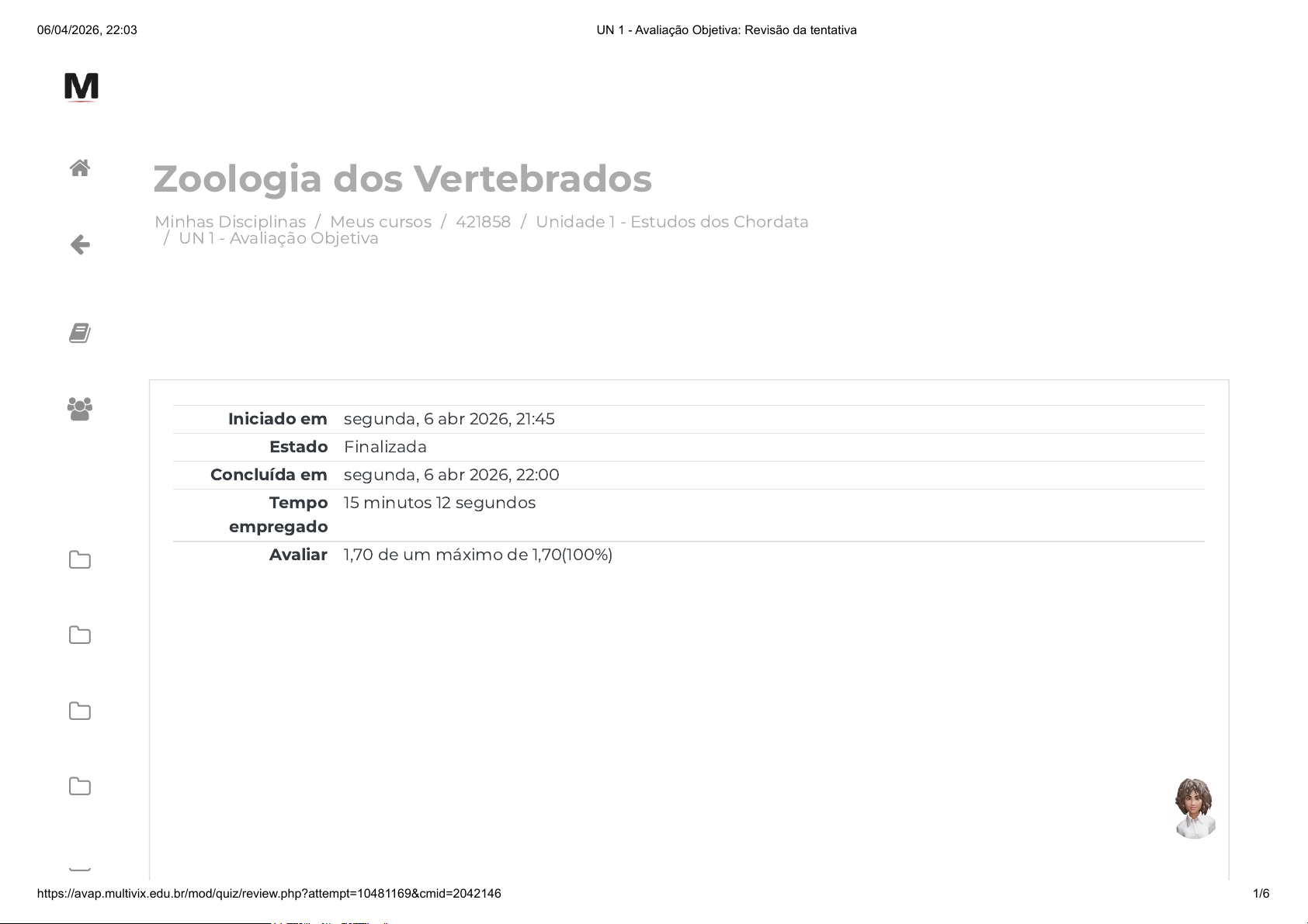 Minhas Disciplinas / Meus cursos / 421858 / Unidade 1 - Estudos dos Chordata / UN 1 - Avaliação Objetiva Zoologia dos Vertebrados Iniciado em segunda, 6 abr 2026, 21:45 Estado Finalizada Concluída em segunda, 6 abr 2026, 22:00 Tempo empregado 15 minutos 12 segundos Avaliar 1,70 de um máximo de 1,70(100%) 06/04/2026, 22:03 UN 1 - Avaliação Objetiva: Revisão da tentativa https://avap.multivix.edu.br/mod/quiz/review.php?attempt=10481169&cmid=2042146 1/6 https://avap.multivix.edu.br/my/ https://avap.multivix.edu.br/course/view.php?id=38651 https://avap.multivix.edu.br/course/view.php?id=38651§ion=2 https://avap.multivix.edu.br/mod/quiz/view.php?id=2042146 https://avap.multivix.edu.br/my/ https://avap.multivix.edu.br/course/view.php?id=38651 https://avap.multivix.edu.br/user/index.php?id=38651 https://avap.multivix.edu.br/course/view.php?id=38651§ion=1 https://avap.multivix.edu.br/course/view.php?id=38651§ion=2 https://avap.multivix.edu.br/course/view.php?id=38651§ion=3 https://avap.multivix.edu.br/course/view.php?id=38651§ion=4 https://avap.multivix.edu.br/course/view.php?id=38651§ion=5 https://avap.multivix.edu.br/ https://avap.multivix.edu.br/ https://avap.multivix.edu.br/ https://avap.multivix.edu.br/ https://avap.multivix.edu.br/ https://avap.multivix.edu.br/ https://avap.multivix.edu.br/ Questão 1 Correto Atingiu 0,34 de 0,34 Em 1735, o sueco Carl von Linné, botânico e médico, conhecido como Lineu, lançou seu livro Systema Naturae com o objetivo de criar regras para classificar e denominar animais e plantas. Então na décima edição, em 1758, a obra sugeriu uma nomenclatura simples: cada organismo seria conhecido por dois nomes, seguidos e inseparáveis. Essa nomenclatura ficou conhecida como: Escolha uma opção: binomial trinomial. trinomial. tetranominal. uninominal. binomial. 06/04/2026, 22:03 UN 1 - Avaliação Objetiva: Revisão da tentativa https://avap.multivix.edu.br/mod/quiz/review.php?attempt=10481169&cmid=2042146 2/6 https://avap.multivix.edu.br/ https://avap.multivix.edu.br/ https://avap.multivix.edu.br/ https://avap.multivix.edu.br/ https://avap.multivix.edu.br/ https://avap.multivix.edu.br/ https://avap.multivix.edu.br/ Questão 2 Correto Atingiu 0,34 de 0,34 Os animais do filo Cordada possuem algumas características marcantes: cavidade corporal interna cheia de líquido (celoma), corpo em um plano bilateral simétrico (são bilatérios), camadas germinativas (são animais vertebrados). A evolução até os animais cordados ocorreu a partir da ramificação dos bilatérios. Aponte a alternativa que cita os grupos resultantes dessa ramificação. Escolha uma opção: Protostômios, hemicordado e Xenacoelomorpha. Cordados, deuterostômios e Xenacoelomorpha. Protostômios, deuterostômios e Xenacoelomorpha. Protostômios, deuterostômios e hemicordado. Protostômios, deuterostômios e Ecdysozo. 06/04/2026, 22:03 UN 1 - Avaliação Objetiva: Revisão da tentativa https://avap.multivix.edu.br/mod/quiz/review.php?attempt=10481169&cmid=2042146 3/6 https://pt.wikipedia.org/w/index.php?title=Xenacoelomorpha&action=edit&redlink=1 https://pt.wikipedia.org/w/index.php?title=Xenacoelomorpha&action=edit&redlink=1 https://pt.wikipedia.org/w/index.php?title=Xenacoelomorpha&action=edit&redlink=1 https://avap.multivix.edu.br/ https://avap.multivix.edu.br/ https://avap.multivix.edu.br/ https://avap.multivix.edu.br/ https://avap.multivix.edu.br/ https://avap.multivix.edu.br/ https://avap.multivix.edu.br/ Questão 3 Correto Atingiu 0,34 de 0,34 Muitas evidências mostram que o grupo Amniota é dividido em dois clados: Mammalia e Sauropsida. Esse grupo é reconhecido como monofilético e os animais têm como características, além do ovo amniótico: Escolha uma opção: maior queratinizarão do tegumento, astrágalo e mais de uma vértebra sacral. pele fina e úmida, astrágalo e mais de uma vértebra sacral. menor queratinizarão do tegumento, astrágalo e mais de uma vértebra sacral. menor queratinizarão do tegumento, astrágalo e ausência de uma vértebra sacral. maior queratinizarão do tegumento, astrágalo e ausência de uma vértebra sacral. 06/04/2026, 22:03 UN 1 - Avaliação Objetiva: Revisão da tentativa https://avap.multivix.edu.br/mod/quiz/review.php?attempt=10481169&cmid=2042146 4/6 https://avap.multivix.edu.br/ https://avap.multivix.edu.br/ https://avap.multivix.edu.br/ https://avap.multivix.edu.br/ https://avap.multivix.edu.br/ https://avap.multivix.edu.br/ https://avap.multivix.edu.br/ Questão 4 Correto Atingiu 0,34 de 0,34 Os anfíbios, apesar de apresentarem diversificadas formas corporais (salamandras, cecílias, sapos, rãs e pererecas), pertencem à mesma linhagem evolutiva: a subclasse Lissamphibia (do grego liss = liso). As principais características desse grupo são: Escolha uma opção: tegumento úmido e permeável (troca dos gases respiratórios); reprodução com a deposição de grande número de ovos, que eclodem em larvas no ambiente terrestre. tegumento úmido e permeável (troca dos gases respiratórios); reprodução com a deposição de grande número de ovos, que eclodem em larvas no ambiente aquático. tegumento úmido; presença de pulmões e de escamas; reprodução com a deposição de grande número de ovos, que eclodem em larvas no ambiente aquático. tegumento úmido e impermeável (troca dos gases respiratórios); reprodução com a deposição de poucos ovos, que eclodem em larvas no ambiente terrestre. tegumento protegido por escama; bexiga natatória; reprodução com a deposição de grande número de ovos, que eclodem em larvas no ambiente terrestre. 06/04/2026, 22:03 UN 1 - Avaliação Objetiva: Revisão da tentativa https://avap.multivix.edu.br/mod/quiz/review.php?attempt=10481169&cmid=2042146 5/6 https://avap.multivix.edu.br/ https://avap.multivix.edu.br/ https://avap.multivix.edu.br/ https://avap.multivix.edu.br/ https://avap.multivix.edu.br/ https://avap.multivix.edu.br/ https://avap.multivix.edu.br/ Questão 5 