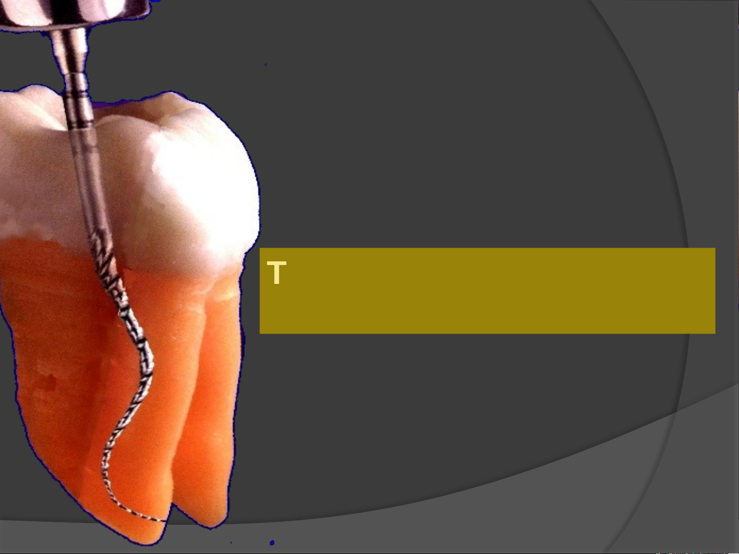 Técnicas de Instrumentação Preparo Biomecânico JAIR FERREIRA TRATAMENTO ENDODÔNTICO DIAGNÓSTICO NECROPULPECTOMIA BIOPULPECTOMIA POLPA INFLAMADA POLPA NECROSADA LIGAMENTO PERIODONTAL INFLAMADO LESÃO PERIRADICULAR CÁRIETÉCNICA COROA-ÁPICE TÉCNICA ÁPICE- COROA CANAL RADICULAR C.D.CC.D.C CANAL DENTINÁRIO CANAL CEMENTÁRIO Somente LIMPEZA CAMPO DE ATUAÇÃO DO ENDODONTISTA COTO PULPAR INDICAÇÕES: Processo inflamatório da polpa dentária causado por cárie ou trauma; Ocorrência de algum acidente operatório que leva a exposição pulpar. Mario Roberto Leonardo BIOPULPECTOMIA - TRATAMENTO ENDODÔNTICO EM POLPA VIVA NECROPULPECTOMIA I: tratamento do canal radicular com polpa necrosada sem lesão patológica evidenciavel radiograficamente. NECROPULPECTOMIA I I: tratamento do canal radicular em polpa necrosada com lesão periapical patológica visível em radiografia. Mario Roberto Leonardo NECROPULPECTOMIA - TRATAMENTO ENDODÔNTICO EM POLPA MORTA MEIOS QUÍMICOS FÍSICOS MECÂNICOS PREPARO BIOQUÍMICOMECÂNICO ALARGAR, MODELAR E DESINFECTAR Irrigar, aspirar e inundar Sol. Irrigadoras TÉCNICAS DE INSTRUMENTAÇÃO FINALIDADES DO PREPARO BIOMECÂNICO Limpeza Ação mecânica dos instrumentos endodônticos; Fluxo e refluxo da solução irrigadora (ação física); Ação química de soluções irrigadoras. Modelagem Ação mecânica dos instrumentos endodônticos. Mario Roberto Leonardo Facilitar a instrumentação; Remoção de restos orgânicos; Remoção de raspas de dentina; Combater microrganismos; Lubrificação do canal radicular; Aliviar a região apical de exudatos e corpos estranhos; Auxiliar na secagem do canal. FINALIDADES DA IRRIGAÇÃO E ASPIRAÇÃO ASPIRAÇÃO: Cânula no interior da câmara pulpar. IRRIGAÇÃO: (Irrigar/ Aspirar/ Inundar) Início só na câmara pulpar Quanto + alargar maior a penetração Injetar com leve pressão Deixar o espaço para o refluxo Até 2mm AQUÉM do CRT TÉCNICA ANTESDURANTEDEPOIS Solução de hipoclorito de sódio COMPOSTOS HALOGENADOS Solução de Gluconato de Clorexidina a 2% QUELANTES EDTA -Solução de ácido etilenodiaminotetracético OUTRAS SOLUÇÕES IRRIGADORAS: - Água destilada estérilizada - Soro fisiológico - Peróxido de hidrogênio 10vol. MEIOS QUÍMICOS APKV/03 Propriedades desejáveis das sol. irrigadoras: Boa viscosidade Baixa tensão superficial Biocompatibilidade Ação antimicrobiana Solvente de tecido MEIOS QUÍMICOS APKV/03 MEIOS QUÍMICOS HIPOCLORITO DE SÓDIO Dissolve de matéria orgânica Ação rápida (baixa tensão superficial) Dupla ação detergente (mat. orgânica e gorduras) Bactericida, ação lubrificante e clareadora Neutraliza produtos tóxicos Auxilia na instrumentação Ph Alcalino Ph alcalino-Irritante aos tecidos periapicais Alvejante Irritante para a pele e mucosas Gosto desagradável Mancha a roupa CUIDADO!!! COMPOSTOS HALOGENADOS Concentrações: LÍQUIDO DE DAKIN – 0,5% SOLUÇÃO DE MILTON – 1% SOLUÇÃO DE LABARRAQUE – 2,5% SODA CLORADA – 4 a 6 % HIPOCLORITO DE SÓDIO MEIOS QUÍMICOS COMPOSTOS HALOGENADOS VANTAGENS: Ausência de toxicidade relativa; Capacidade de adsorção pela dentina; Amplo expectro de ação contra bactérias G+/- Substantividade; Biocompatibilidade. DESVANTAGENS: Não dissolve tecido pulpar; Não tem ação clareadora. CLOREXIDINA COMPOSTOS HALOGENADOS MEIOS QUÍMICOS MEIO QÚIMICOS QUELANTES Promove a quelação (remoção) de íons cálcio da dentina; Descalcificação dentina; Biocompatível com tecidos periapicais. Remove a smear layer; Aumenta a permeabilidade da dentina; Permite a penetração da medicação nas áreas; inacessíveis à instrumentação; EDTA FINALIDADES DO PREPARO MECÂNICO Remover polpa coronária, radicular, restos pulpares e sangue infiltrado nos túbulos dentinários; Neutralização do conteúdo séptico; Retificar o mais possível as curvaturas do canal; Criar um espaço para a obturação; Preparar o batente apical; Alargar e alisar as paredes do canal; Proporcionar forma cônica ao canal. MOVIMENTO DE LIMAGEM A) Introdução B) Tração com pressão lateral INDICAÇÃO: Segmento achatado de canal CONTRA-INDICAÇÃO: Instrumentação do segmento apical DESVANTAGEM: Deslocamento apical CINEMÁTICA MOVIMENTO DE LIMAGEM LOCALIZADA INDICAÇÃO: Desgaste anti-curvatura no segmento cervical INDICAÇÃO: - Canais ou segmentos de canais que após a instrumentação apresentam a secção reta transversal circular; - Canais ou segmentos de canis curvos. CONTRA-INDICAÇÃO: - Canais que após a instrumentação não apresentam forma circular. CINEMÁTICA A)Avanço B)Rotação MAIOR DIÂMETRO APICAL MOVIMENTO DE ALARGAMENTO MOVIMENTO DE REMOÇÃO CINEMÁTICA A)Avanço B)Rotação C)Tração contra as paredes laterais ODONTOMETRIA Procedimento que visa determinar o comprimento do dente (CRD) Para estabelecer a extensão da instrumentação = COMP. REAL DE TRABALHO (CRT) 1) Determinar o Comprimento Aparente do dente (CAD): Na radiografia de diagnóstico, meça o comprimento do dente (com régua milimetrada) desde a borda incisal, ponta de cúspide ou acidente anatômico até o ápice radicular. CAD=23 2) Determinar o Comprimento de Trabalho Provisório (CTP): Diminuir 3mm do CAD CTP = CAD - 3 CTP = 23 - 3 = 20 3) Transferir a medida do CTP para lima e inseri-la no canal radicular: A lima deverá ser compatível com o diâmetro do canal radicular 4) Realizar novo Rx 5) Determinar D = distância da ponta da lima até o ápice 6) Determinar o Comprimento Real do dente (CRD): 2mm - Somar a distância ao Comp. Trab. Prov. CRD = CTP + D 20 + 2 = 22mm 7) Determinar Comprimento Real de Trabalho (CRT) : BIOPULPECTOMIA E NECRO I 1 á 2mm NECROPULPECTOMIA II DIMINUIR DO CRD 1mm CRT = CRD – 1 à 2mm TÉCNICA ÁPICE COROA INDICAÇÃO: TRATAMENTO DE BIOPULPECTOMIA VANTAGEM: - Fácil execução. DESVANTAGEM: - Potencial de extrusão de detritos e material necrótico; - Bloqueio Apical; - Alteração do Comprimento de trabalho; - Tendência de desviar o ca