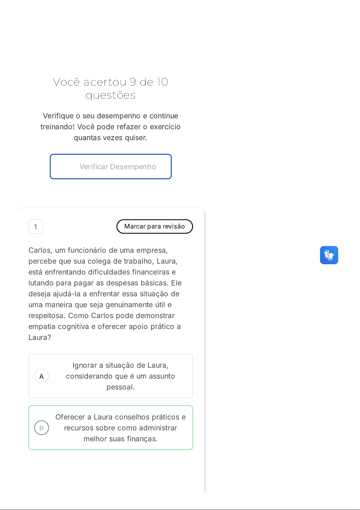 Você acertou 9 de 10 questões Verifique o seu desempenho e continue treinando! Você pode refazer o exercício quantas vezes quiser. Verificar Desempenho A B 1 Marcar para revisão Carlos, um funcionário de uma empresa, percebe que sua colega de trabalho, Laura, está enfrentando dificuldades financeiras e lutando para pagar as despesas básicas. Ele deseja ajudá-la a enfrentar essa situação de uma maneira que seja genuinamente útil e respeitosa. Como Carlos pode demonstrar empatia cognitiva e oferecer apoio prático a Laura? Ignorar a situação de Laura, considerando que é um assunto pessoal. Oferecer a Laura conselhos práticos e recursos sobre como administrar melhor suas finanças. C D E Criticar Laura por suas escolhas financeiras, sem oferecer ajuda ou compreensão. Evitar falar sobre dinheiro com Laura para não a constranger. Sugerir que Laura peça um empréstimo bancário para resolver seus problemas financeiros. Resposta correta Parabéns, você selecionou a alternativa correta. Confira o gabarito comentado! Gabarito Comentado Carlos, ao oferecer a Laura conselhos práticos e recursos para gerenciar suas finanças, demonstra empatia cognitiva ao reconhecer as dificuldades específicas que ela enfrenta. Essa abordagem mostra que Carlos está comprometido em oferecer apoio real e útil para ajudar Laura a enfrentar suas dificuldades financeiras, sem julgamentos ou críticas. 2 Marcar para revisão Lucas percebe que sua colega de classe, Ana, está visivelmente preocupada e ansiosa nos últimos dias. Ele decide abordá-la para oferecer apoio. Como Lucas pode demonstrar empatia por Ana e ajudá-la neste momento? A B C D E Ignorar os sinais de preocupação de Ana, assumindo que é algo pessoal e que ela precisa resolver sozinha. Perguntar diretamente a Ana se ela está bem e se precisa de ajuda, demonstrando interesse genuíno por seu bem-estar. Fazer comentários leves para tentar distrair Ana de suas preocupações, evitando abordar o assunto diretamente. Evitar interagir com Ana, pois não quer se envolver em problemas pessoais. Falar sobre seus próprios problemas para que Ana perceba que não está sozinha em suas preocupações. Resposta correta Parabéns, você selecionou a alternativa correta. Confira o gabarito comentado! Gabarito Comentado Ao demonstrar empatia, Lucas aborda diretamente a situação de Ana, oferecendo apoio e criando um espaço seguro para que ela compartilhe seus sentimentos. Isso fortalece a conexão entre eles e mostra que Lucas está disposto a ajudar Ana em suas dificuldades emocionais. A B C D E 3 Marcar para revisão �ESAF/2004� Cada vez mais, amplia-se a consciência de que o desenvolvimento a qualquer preço provoca efeitos desastrosos sobre a vida no planeta. Nesse sentido, sabe-se que as consequências de um aquecimento global de grandes proporções podem ser catastróficas. A emissão descontrolada de determinados gases na atmosfera contribui para agravar o denominado Efeito mundial. Protocolo de Kioto. Efeito estufa. Conversor catalítico. Barômetro de Torricelli. Resposta correta Parabéns, você selecionou a alternativa correta. Confira o gabarito comentado! Gabarito Comentado O enunciado da questão faz referência ao fenômeno que ocorre quando determinados gases presentes na atmosfera terrestre absorvem parte da A B C radiação infravermelha emitida pela superfície da Terra, impedindo que ela escape para o espaço. Esse fenômeno é conhecido como "efeito estufa". A emissão descontrolada de gases, como o dióxido de carbono e o metano, intensifica esse efeito, contribuindo para o aquecimento global. Portanto, a alternativa correta é a "C", que menciona o "efeito estufa". 4 Marcar para revisão Marta, que trabalha em uma ONG, nota que João, um novo voluntário, tem dificuldade em se adaptar porque não fala fluentemente o idioma local. Como Marta pode facilitar a integração de João na equipe? Insistir para que João aprenda o idioma rapidamente para se integrar melhor. Oferecer ajuda, sugerindo sessões de prática de idioma em grupo ou individualmente. Ignorar a barreira do idioma, assumindo que João se virará sozinho. D E Limitar as tarefas de João a atividades que não requerem comunicação. Encorajar outros membros da equipe a se comunicarem apenas no idioma local para acelerar o aprendizado de João. Resposta correta Parabéns, você selecionou a alternativa correta. Confira o gabarito comentado! Gabarito Comentado Colocar pressão desnecessária sobre João, pode aumentar seu estresse. Fornecer apoio prático e emocional, facilita a integração de João. Ignorar o desafio de João pode fazê-lo sentir-se isolado e desvalorizado. Restringir as atividades de João, pode limitar seu envolvimento e crescimento na ONG. Pode ser contraproducente, aumentando a sensação de exclusão de João. 5 Marcar para revisão Durante uma reunião de pais e professores, a professora Ana percebe que os pais de Felipe, um aluno, estão preocupados com a dificuldade de seu filho em fazer amigos na escola. Como a professora Ana pode ajudar Felipe a desenvolver habilidades sociais e se sentir mais acolhido? Questão 5 de 10 Corretas �9� Incorretas �1� 1 2 3 4 5 6 7 8 9 10 Lista de exercícios Cidadania Sair A B C D E Sugerir que Felipe seja colocado em um programa de tutoria para alunos com dificuldades sociais. Incentivar Felipe a se juntar a clubes e atividades extracurriculares onde ele possa encontrar alunos com interesses similares. Aconselhar os pais de Felipe a procurarem terapia para ele sem envolver a escola. Ignorar a preocupação dos pais, considerando que é normal crianças terem dificuldades em fazer amigos. Organizar atividades de grupo obrigatórias para forçar Felipe a interagir com seus colegas. Resposta incorreta Opa! A alternativa correta é a letra B. Confira o gabarito comentado! Gabarito Comentado Pode ser útil, mas talvez destaque Felipe de maneira que ele se sinta ainda mais isolado. Promove
